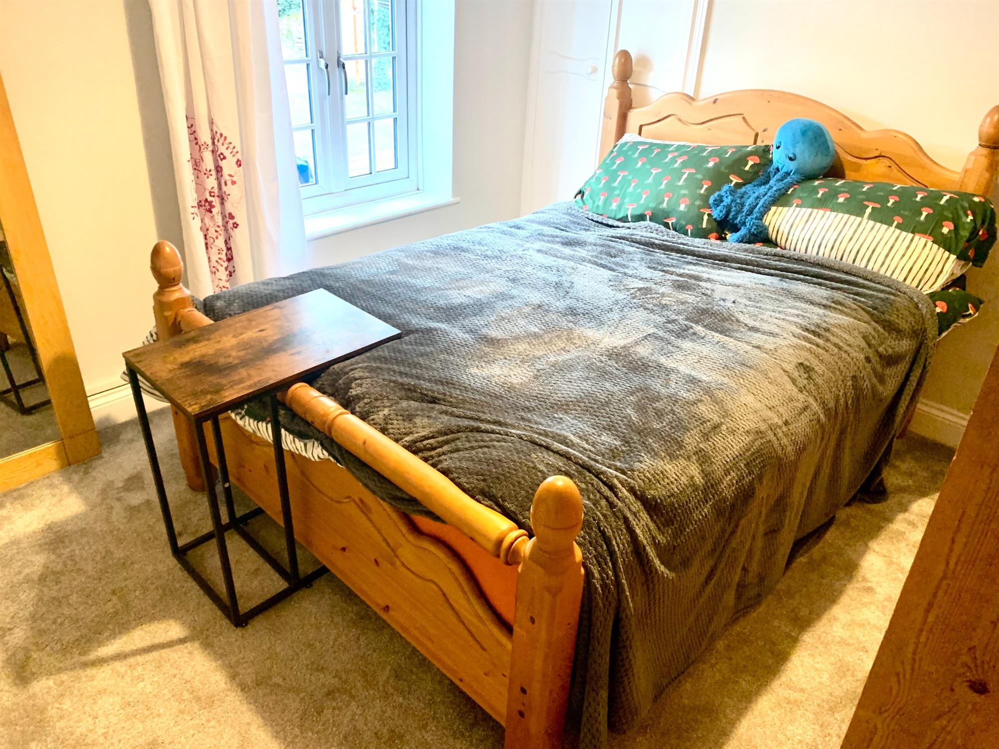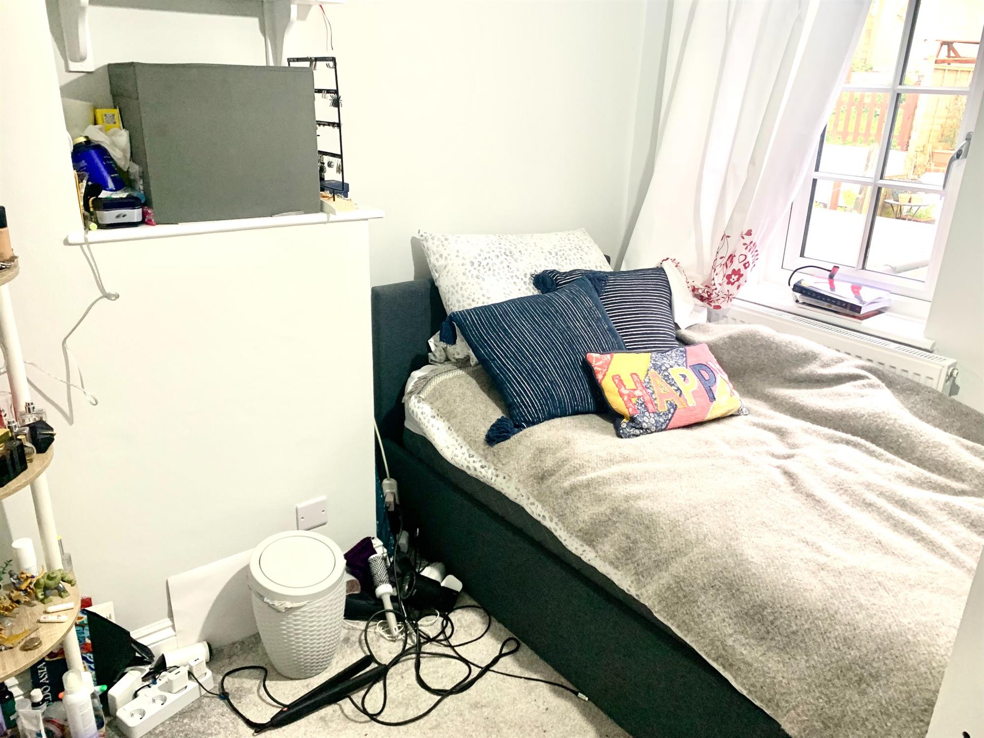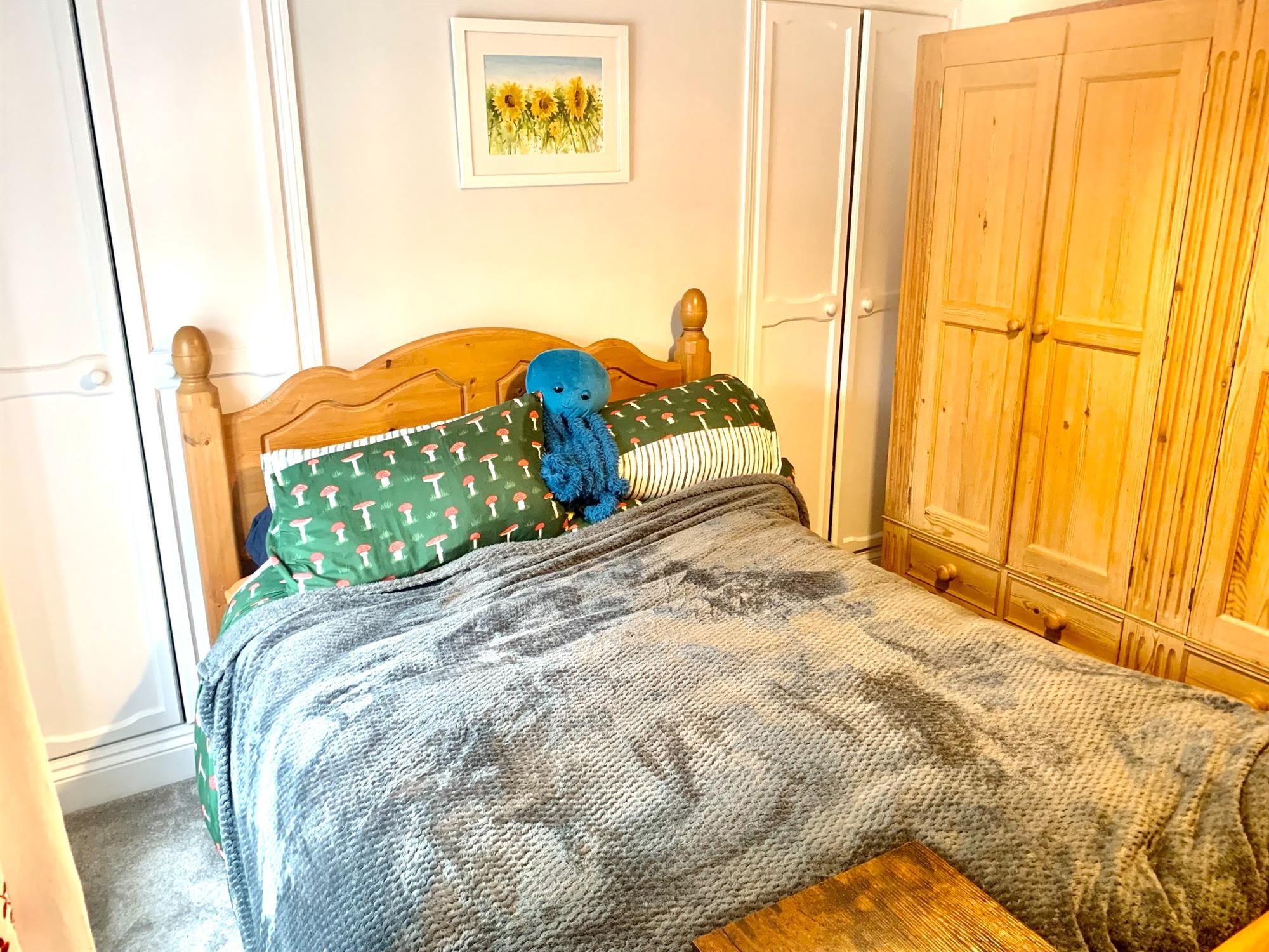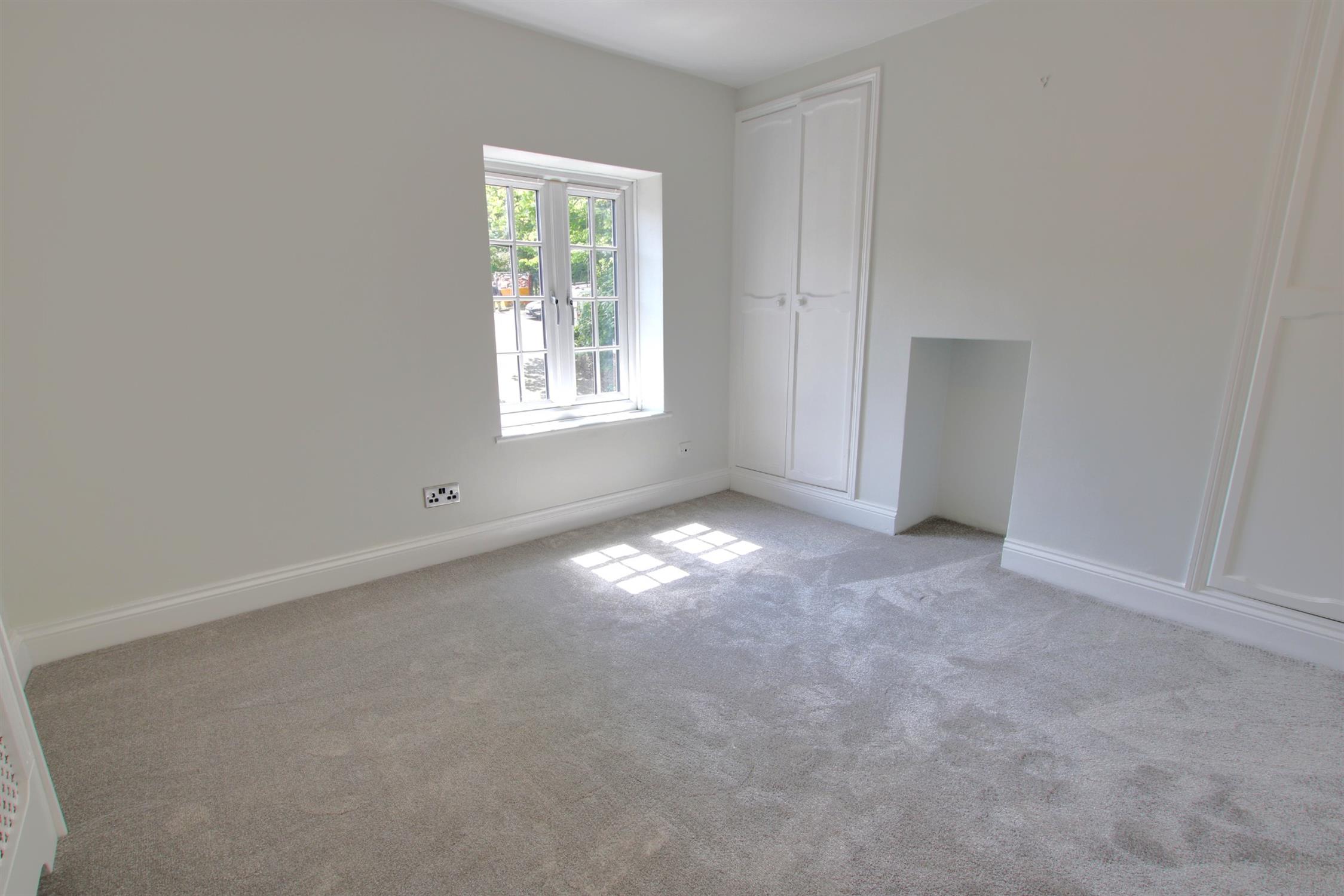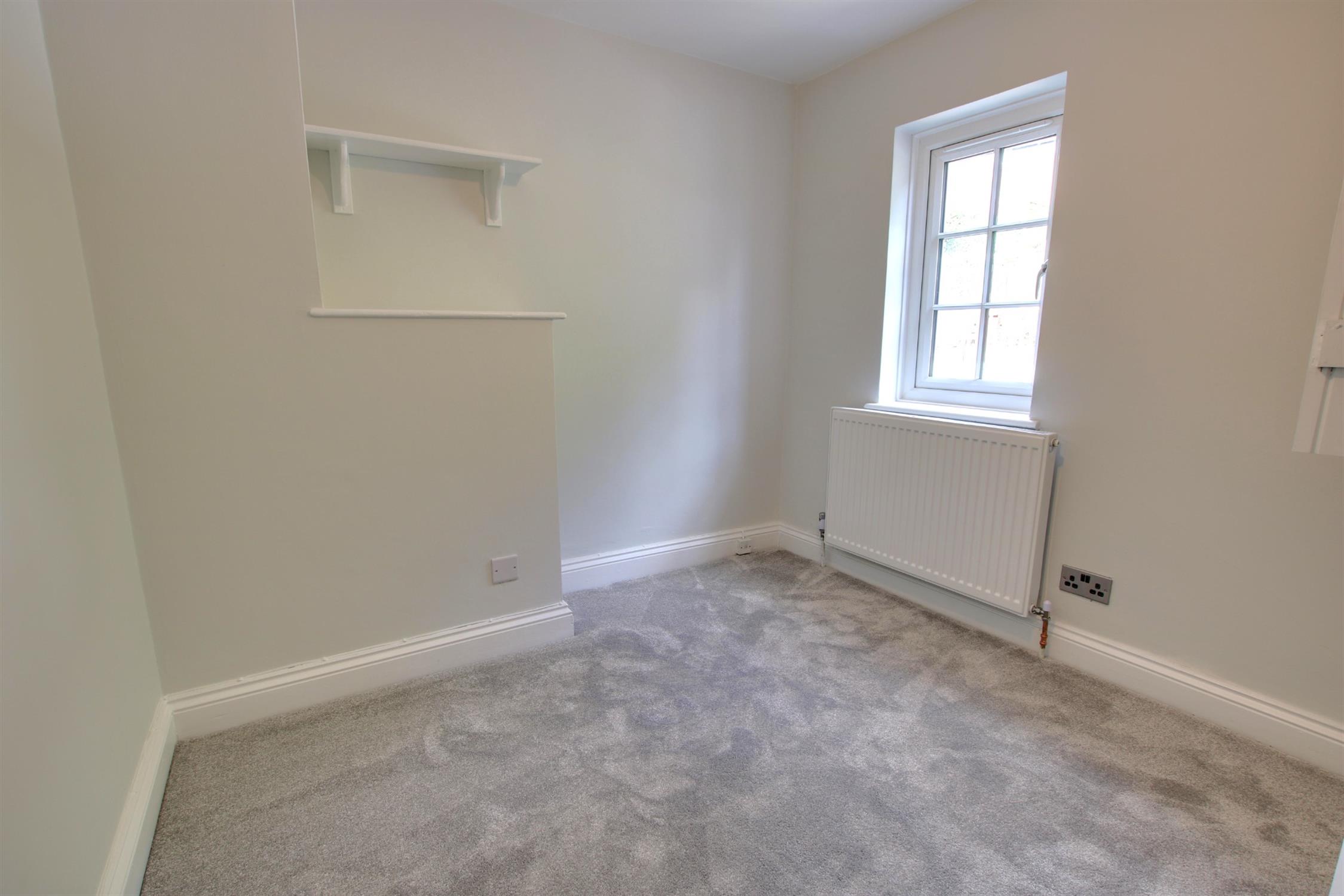 Small double bedroom with window to rear, carpet and small storage cupboard.