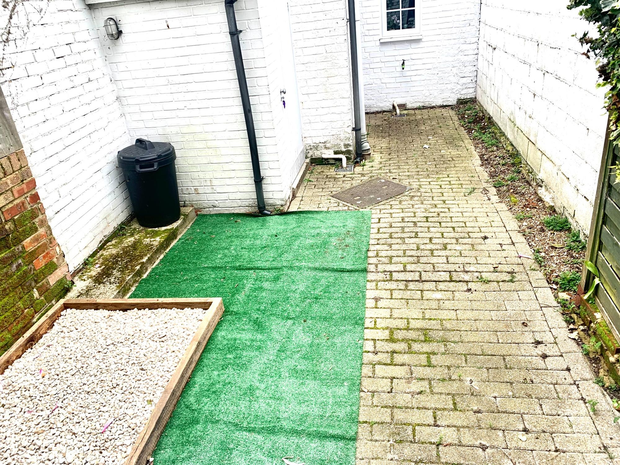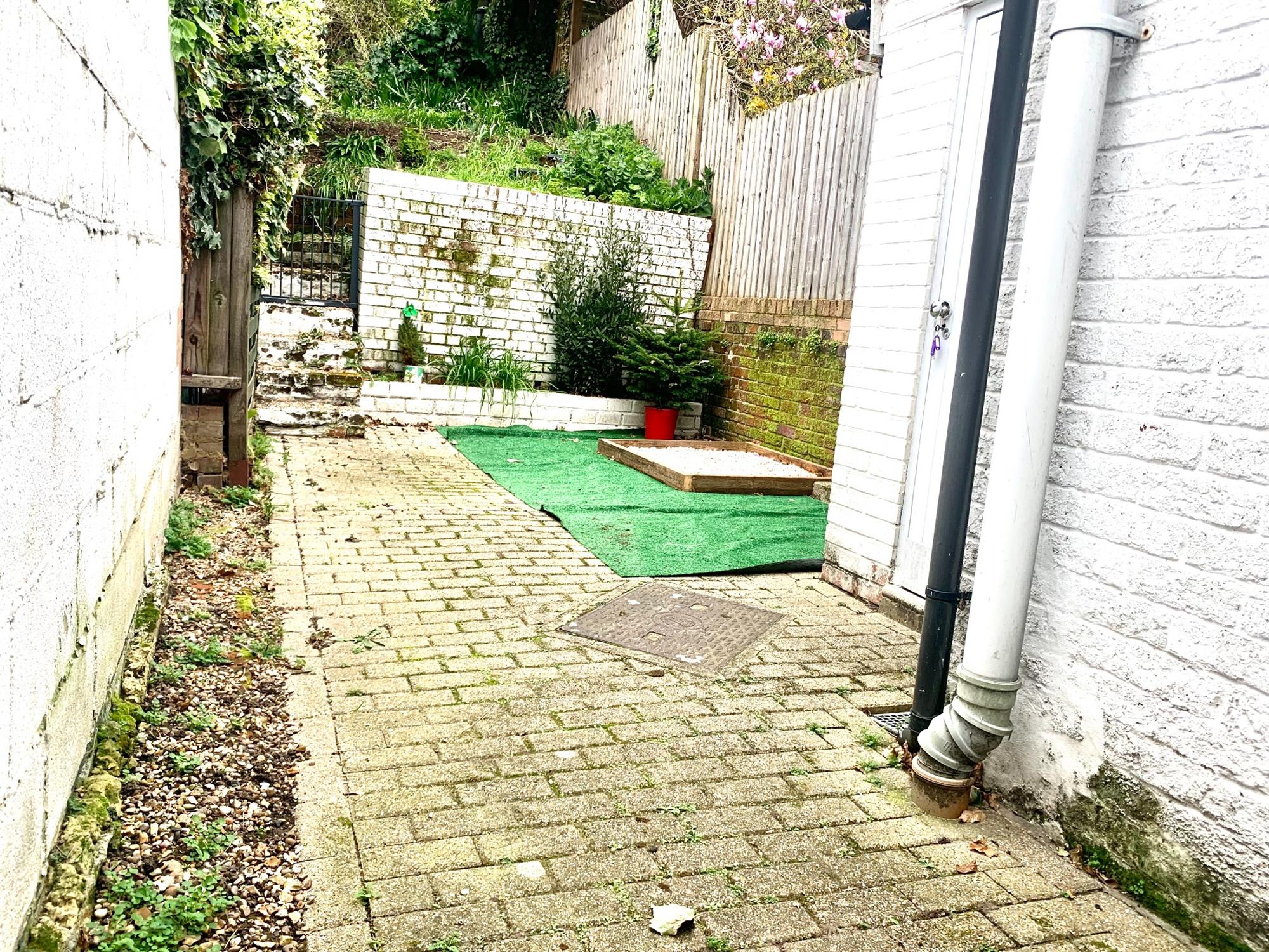 Courtyard paved area with brick built shed and the remainder of the garden is tiered which would be unsuitable for younger children.