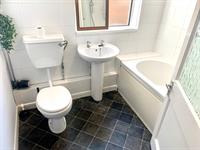 White suite with electric shower over bath, sink and toilet. Window to side.