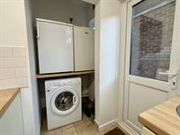 Modern cream wall and base units with appliances consisting of: an electric oven, under-counter fridge, under-counter freezer and washing machine. With doors to bedroom 2 and the private rear garden. This door could also be used as the main entry.