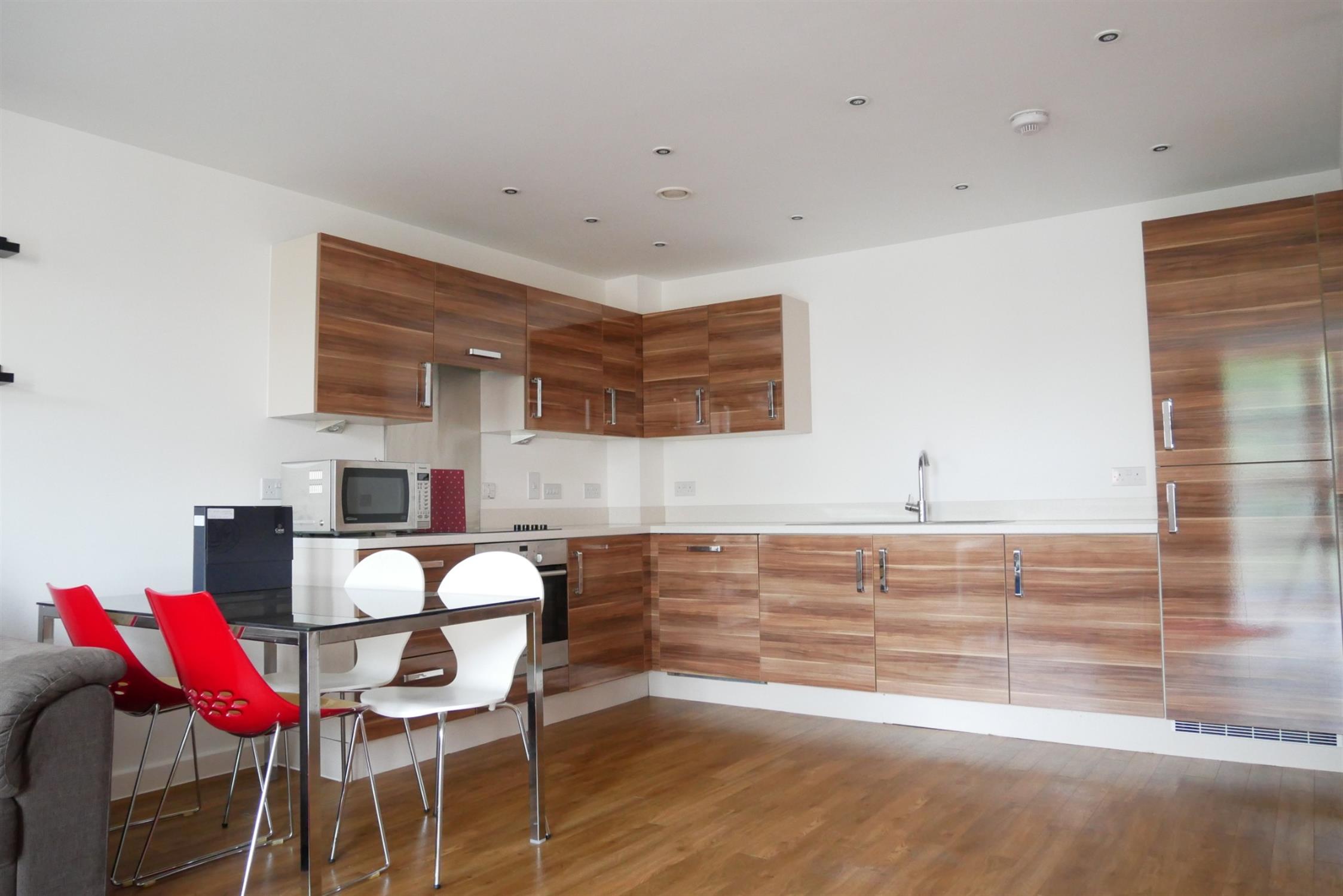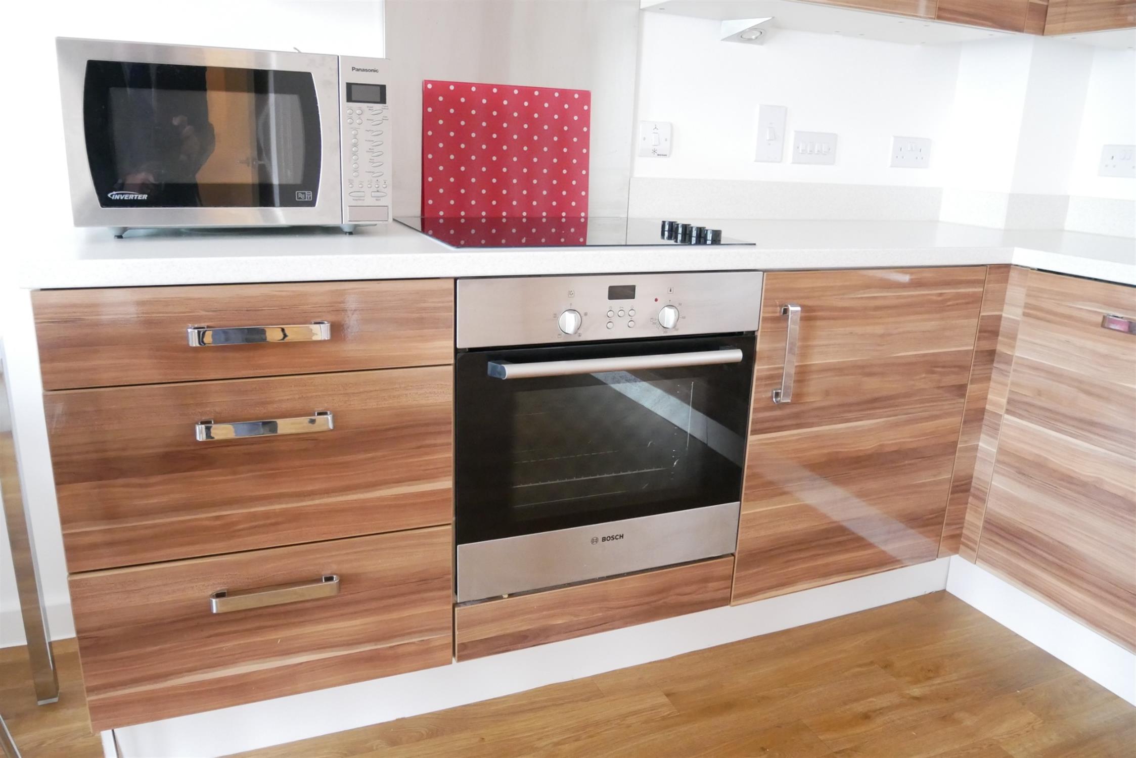 KITCHEN - Modern fitted kitchen with various wall and base units. Appliances comprises: Integral fridge/freezer, electric hob, hob extractor, electric oven, microwave and integral slimline dishwasher. Laminate flooring.