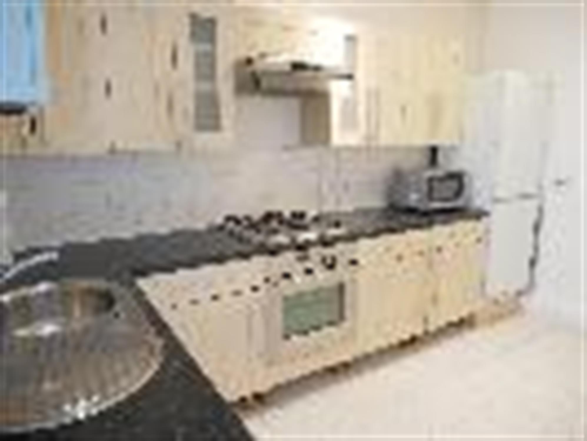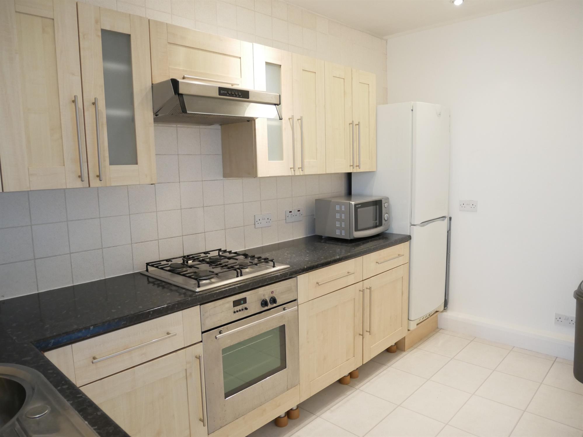 Modern kitchen with range of wall and base units. Appliances include gas hob, electric oven, fridge-freezer and washer/dryer. Laminate flooring.