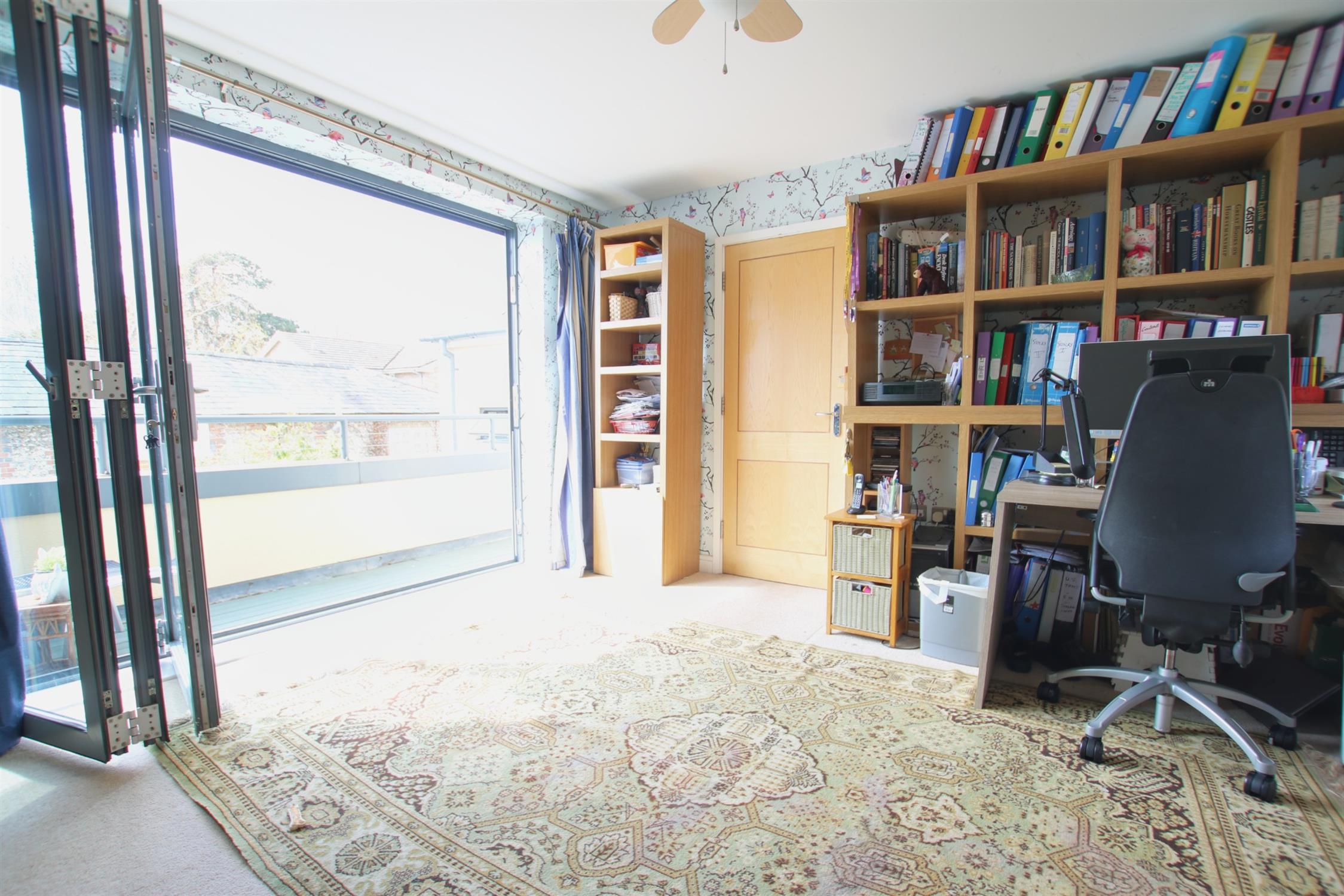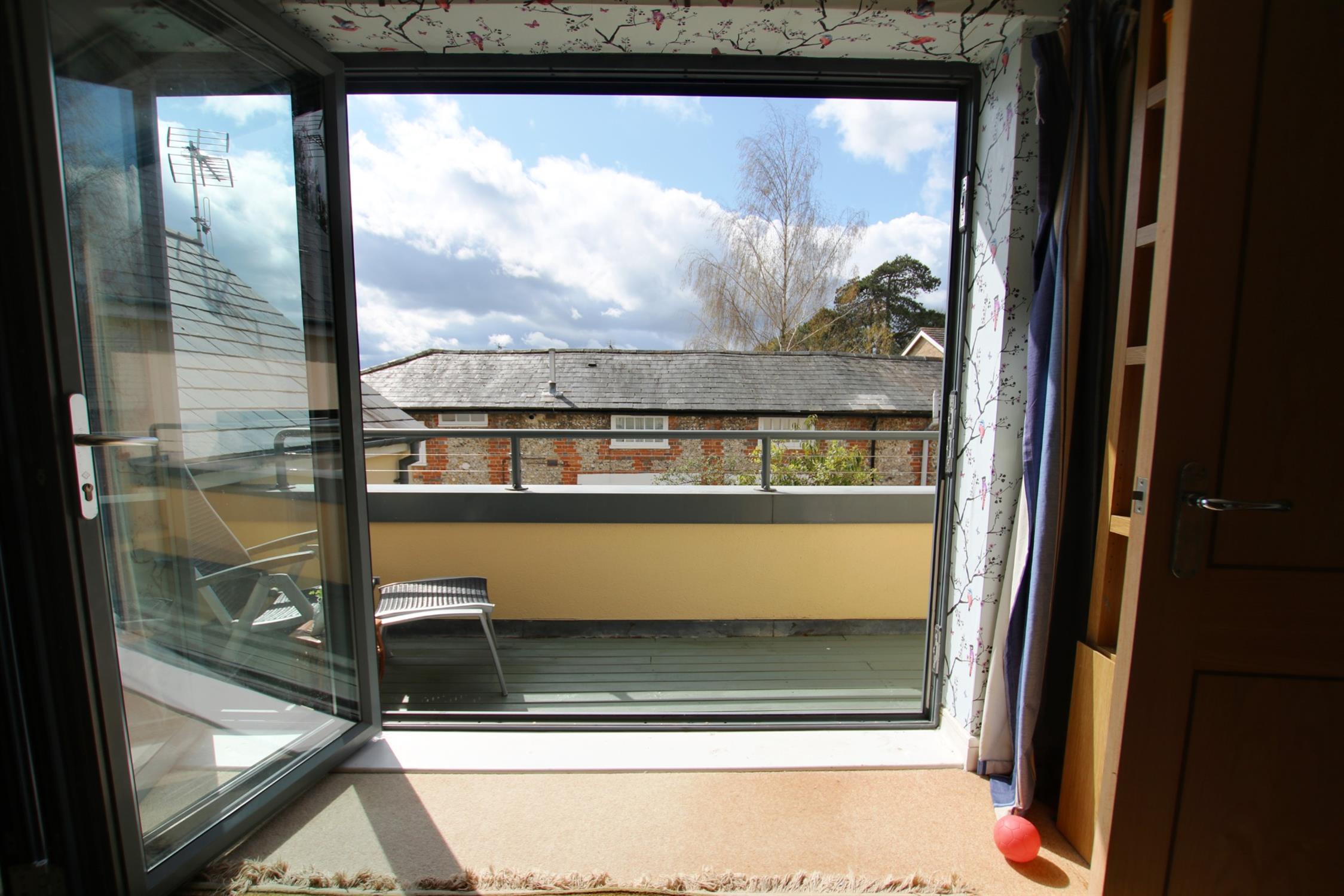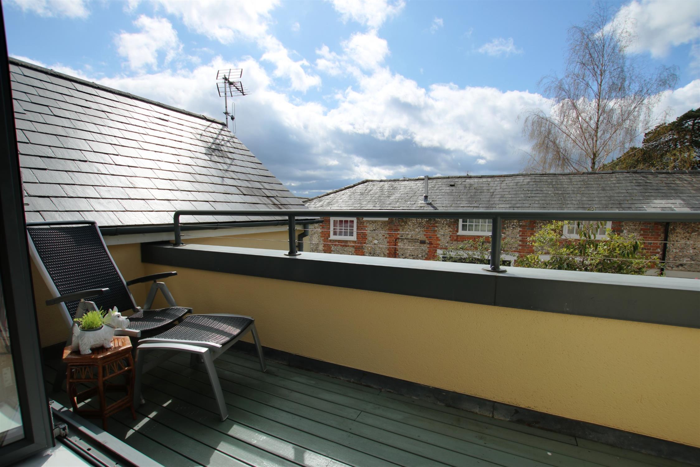The first floor also contains a large dual aspect sitting room (currently used as an office) with built in floor to ceiling bookcases. There is a large balcony providing ample space for relaxation, accessed via tri-fold glass doors running almost the full length of the room. Fronting onto Mews Lane, this provides both views of the neighbouring historical houses and far beyond.