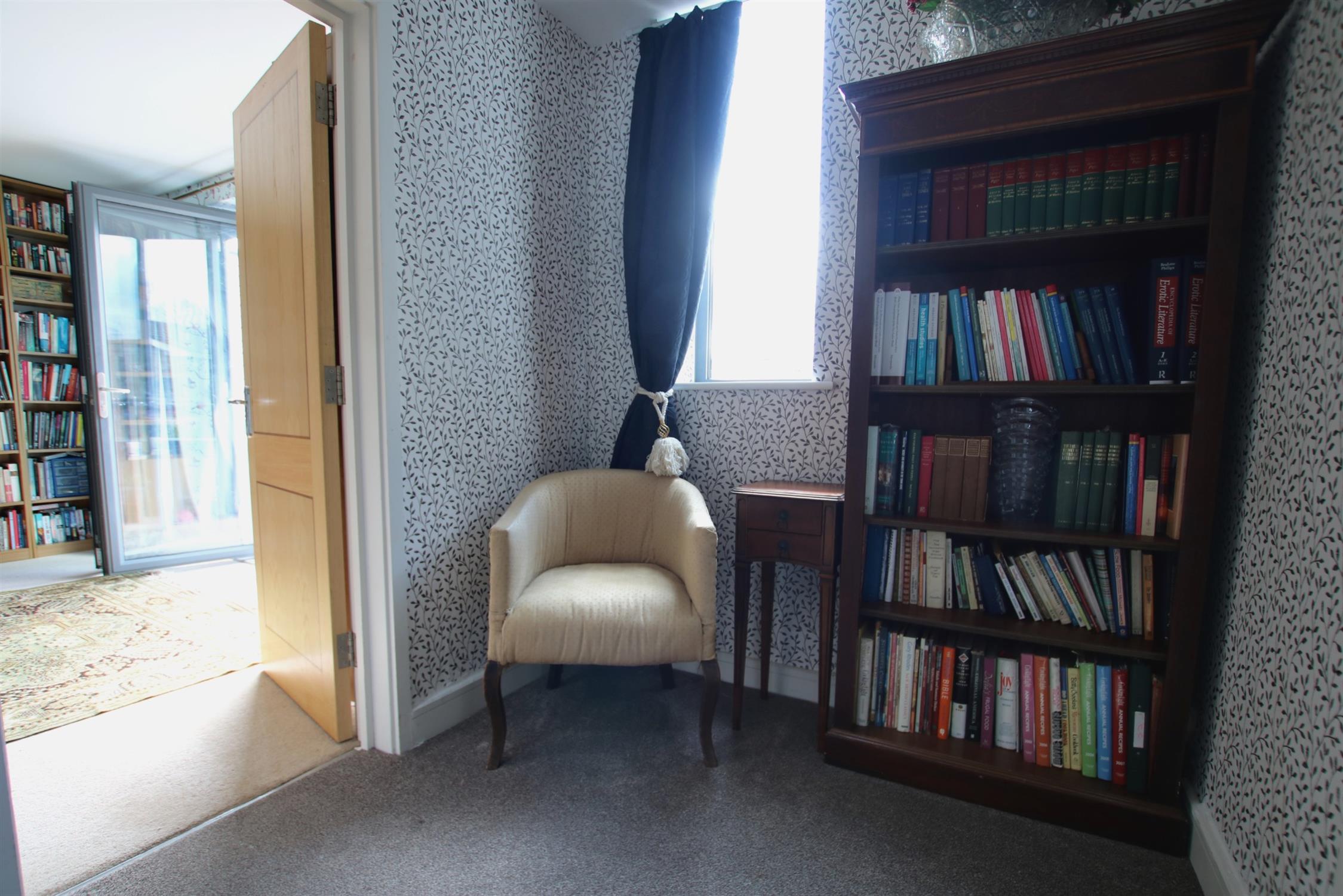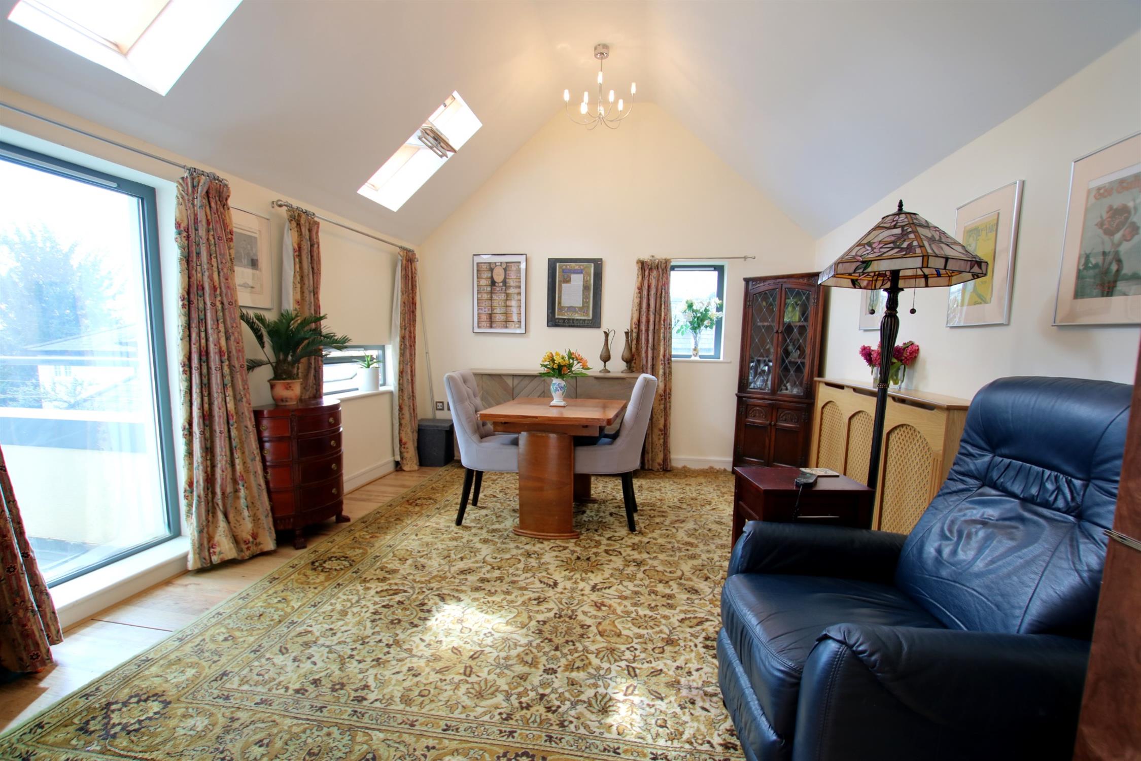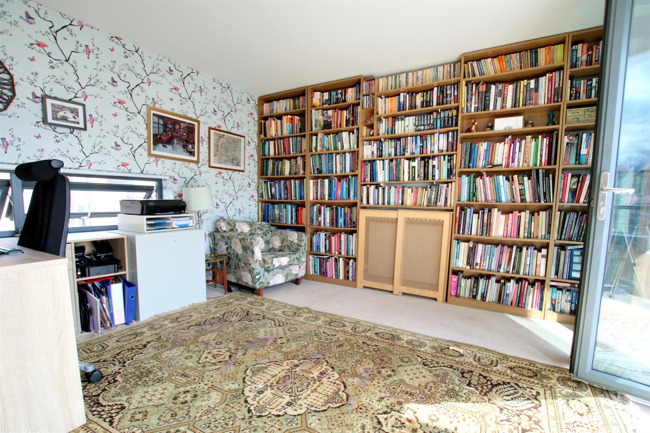 The first floor also contains a large dual aspect sitting room (currently used as an office) with built in floor to ceiling bookcases. There is a large balcony providing ample space for relaxation, accessed via tri-fold glass doors running almost the full length of the room. Fronting onto Mews Lane, this provides both views of the neighbouring historical houses and far beyond.