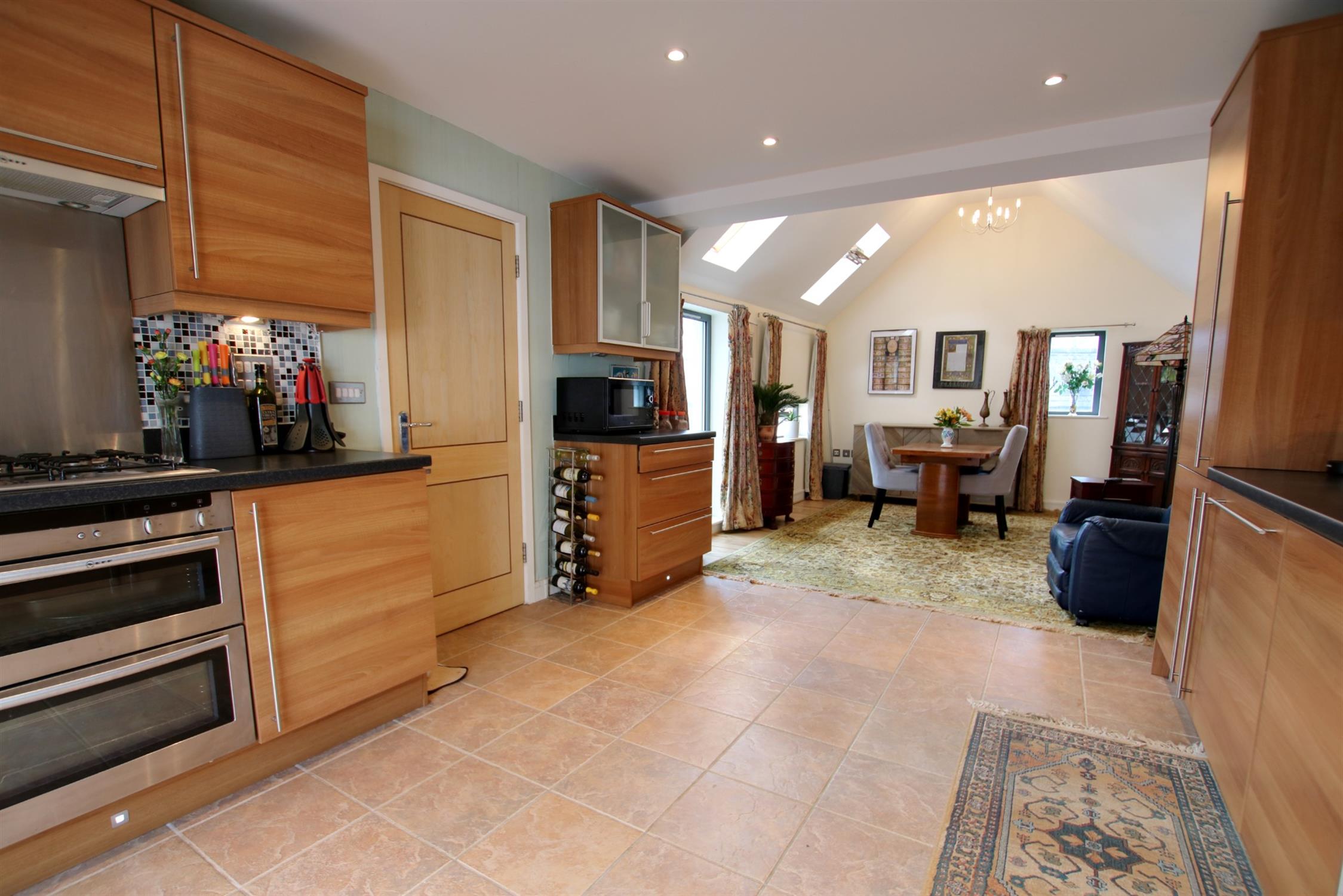 In order to take full advantage of the property’s amazing views, the main living rooms are situated on the first floor. This includes a 26ft open-plan triple-aspect kitchen/dining room. The kitchen is comprehensively fitted with an ample range of Howden cabinetry and integrated appliances, as well as a wealth of worktop space and floor to ceiling window. This is joined by an equally bright and dramatic vaulted-roof living area with skylights, picture window overlooking the balcony and two further windows.