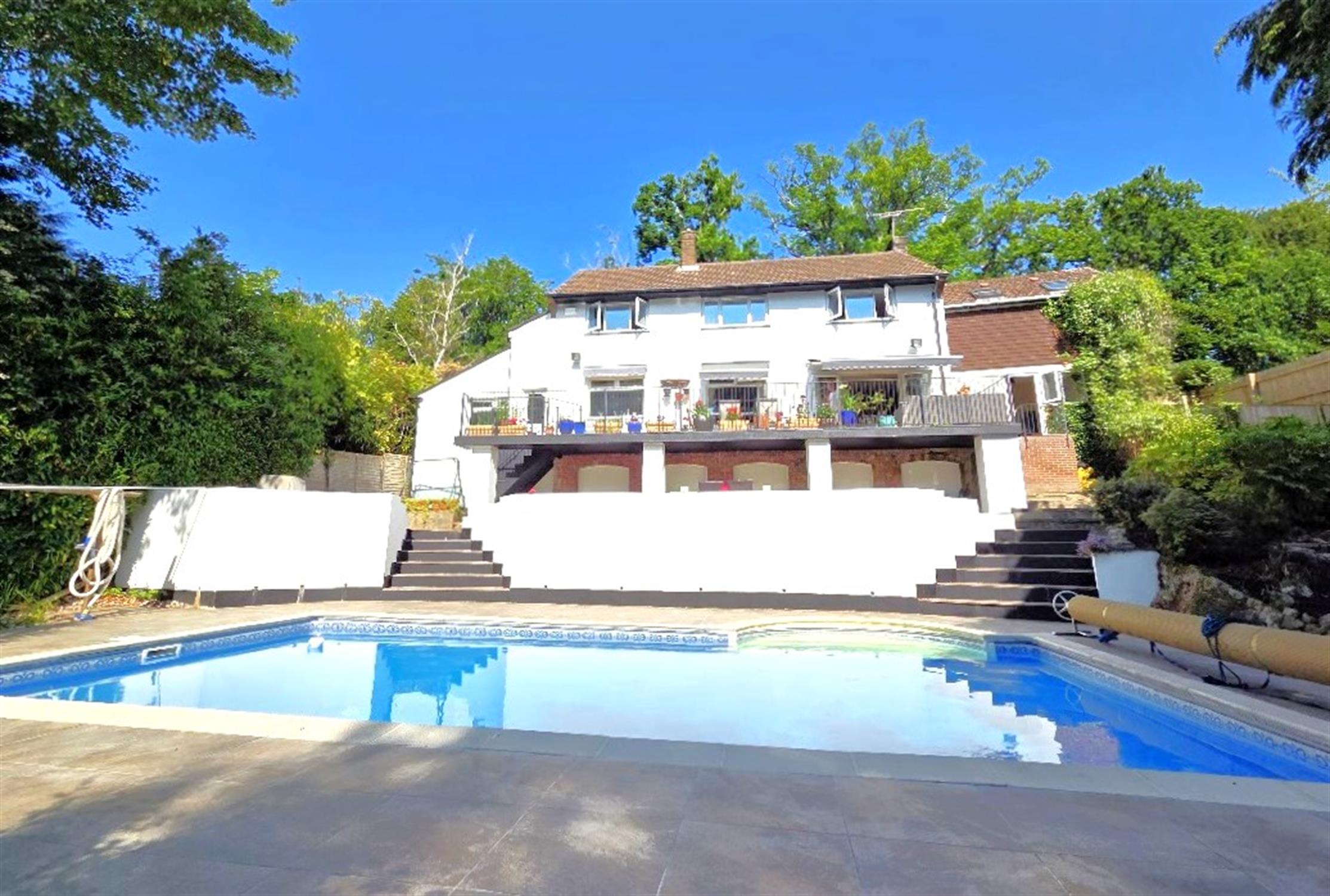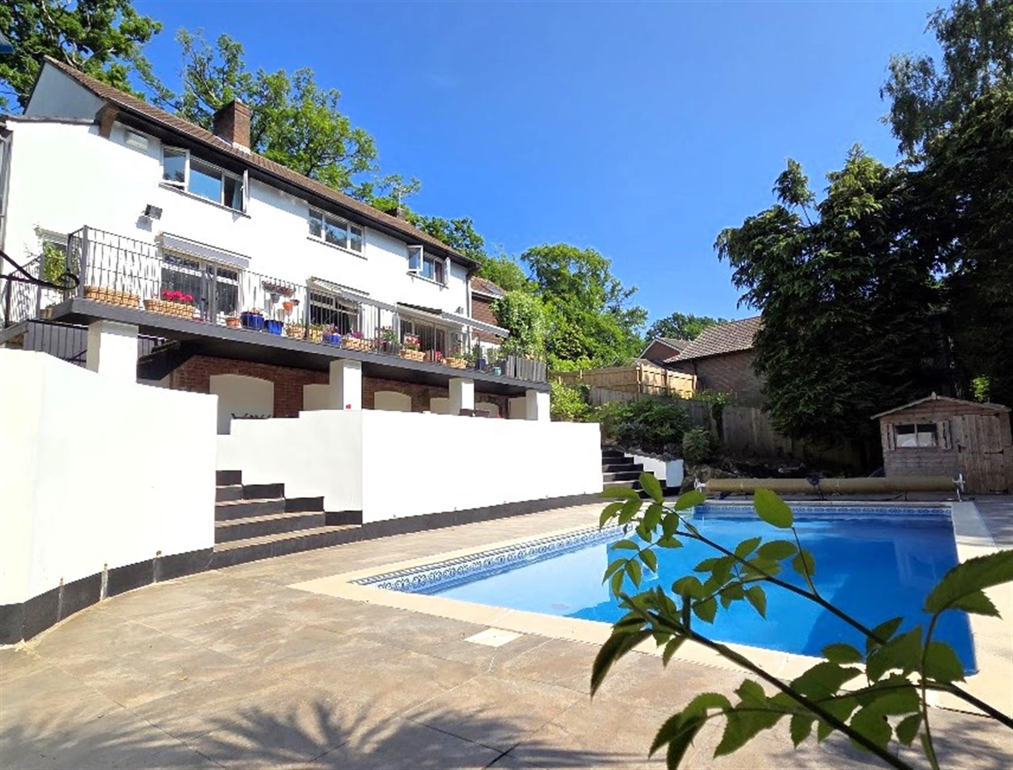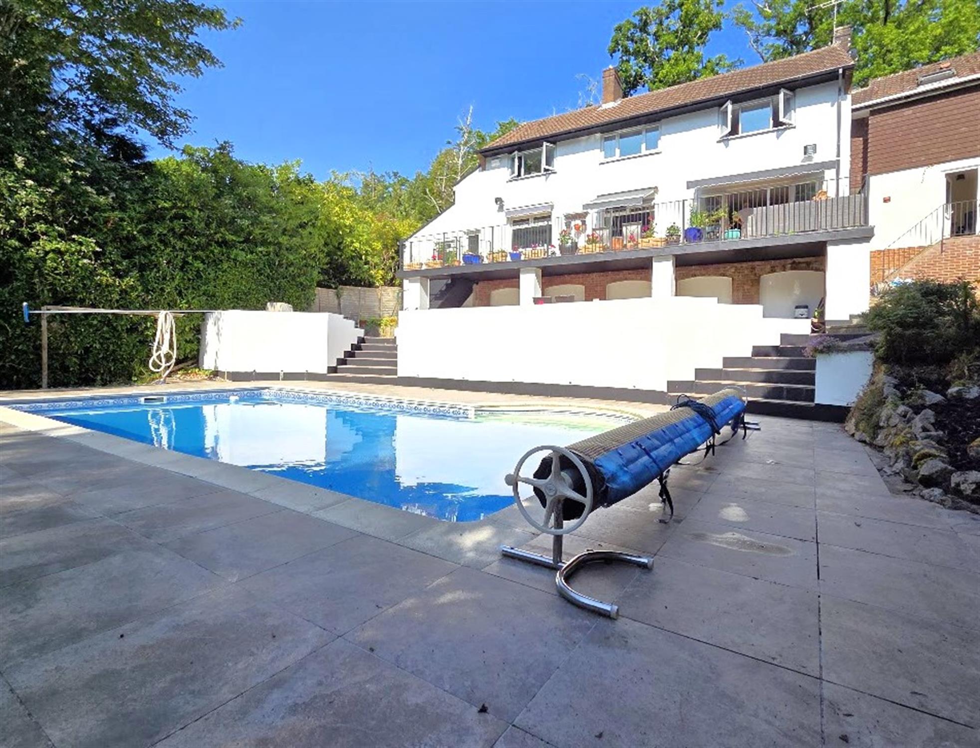 An enclosed secluded rear garden, westerly facing with mature tree borders, offering a high degree of privacy, a heated swimming pool set within terraces providing seating spaces, timber pump and summer house. A large veranda is located at the rear of the house, with covered retractable awnings providing shade from the sun, lots of space for tables, chairs, sun loungers, steps to the lower level with covered areas(beneath the veranda). The frontage has a driveway providing off-road parking spaces, and leading to the double garage.