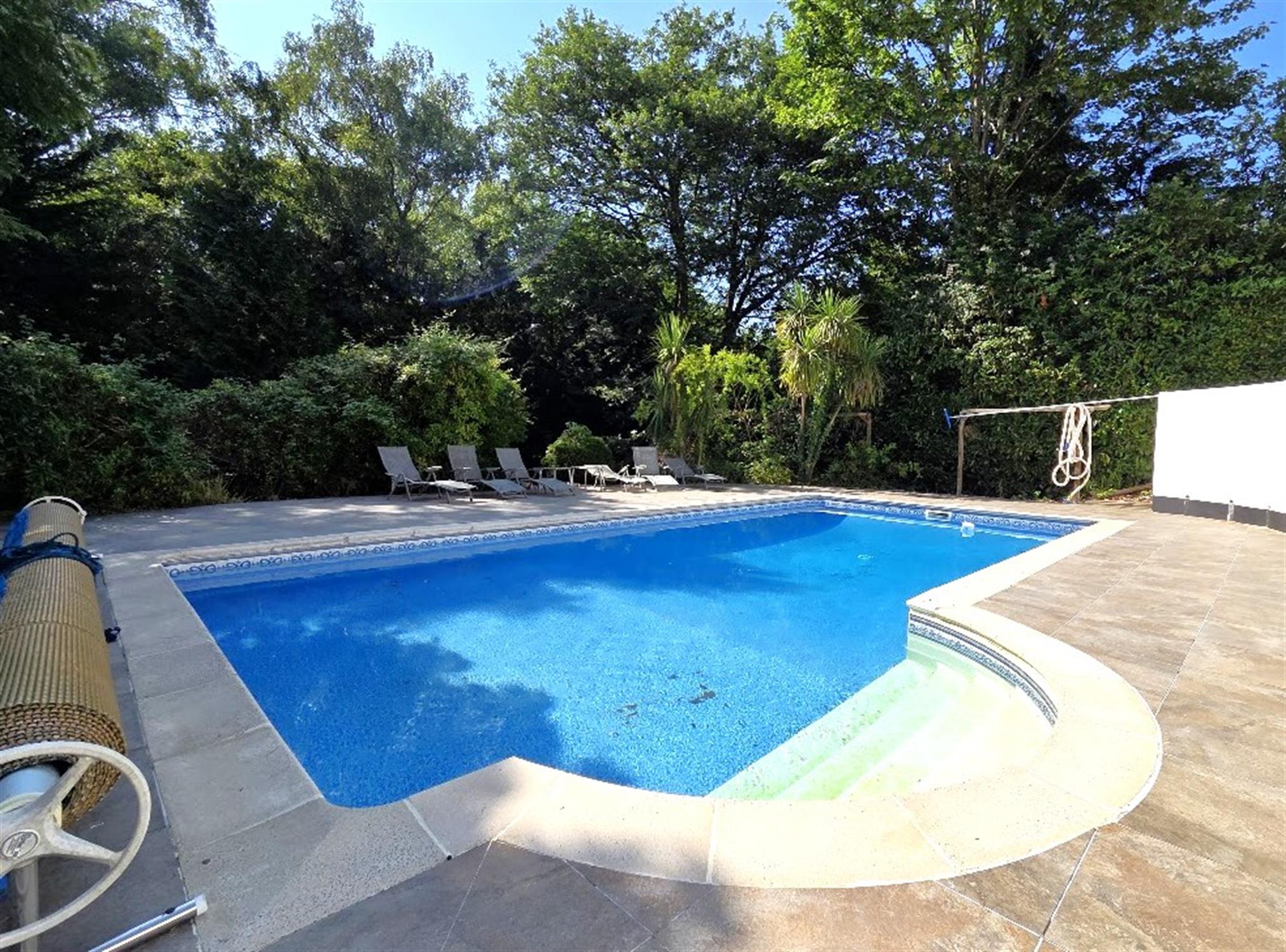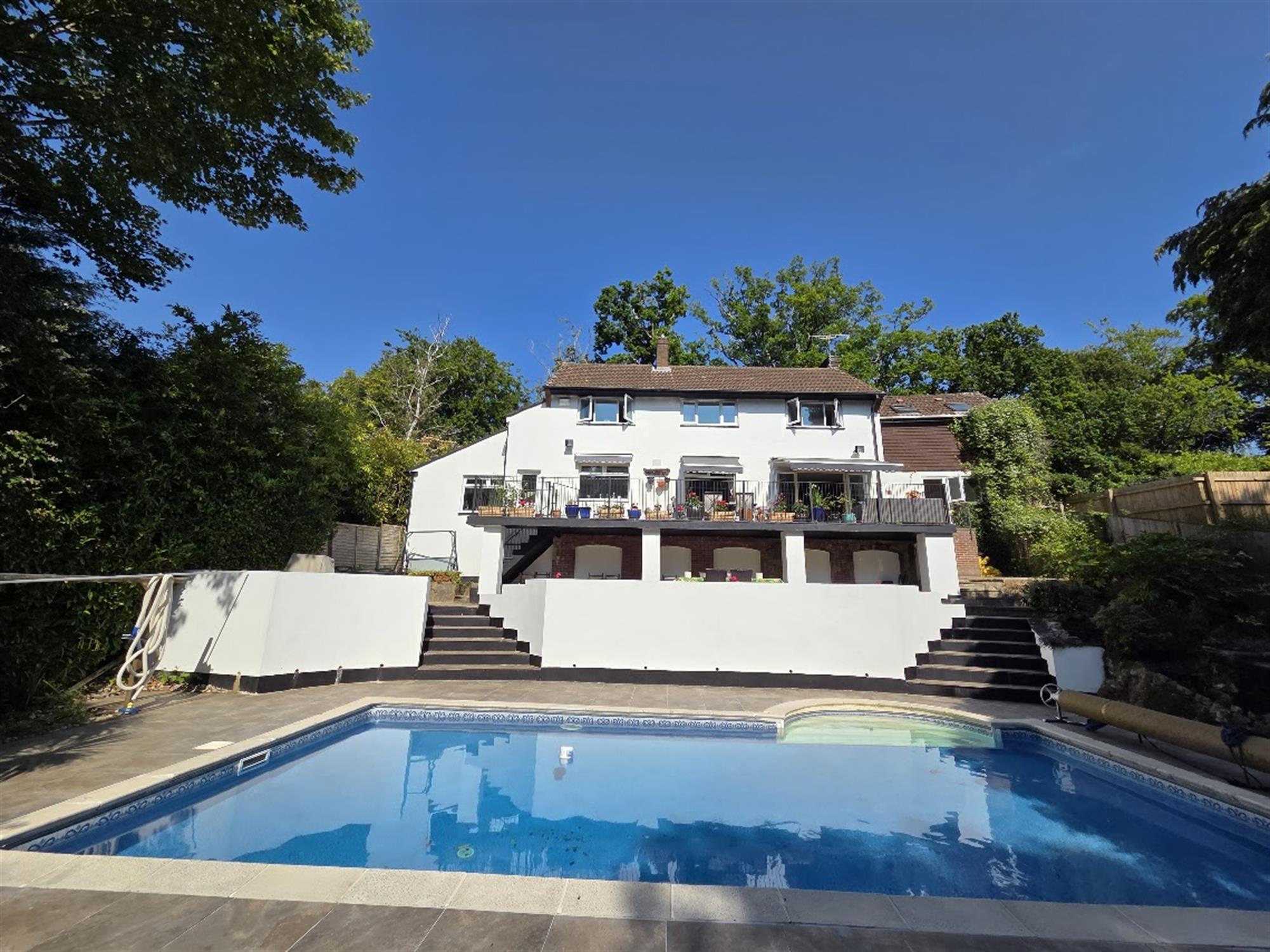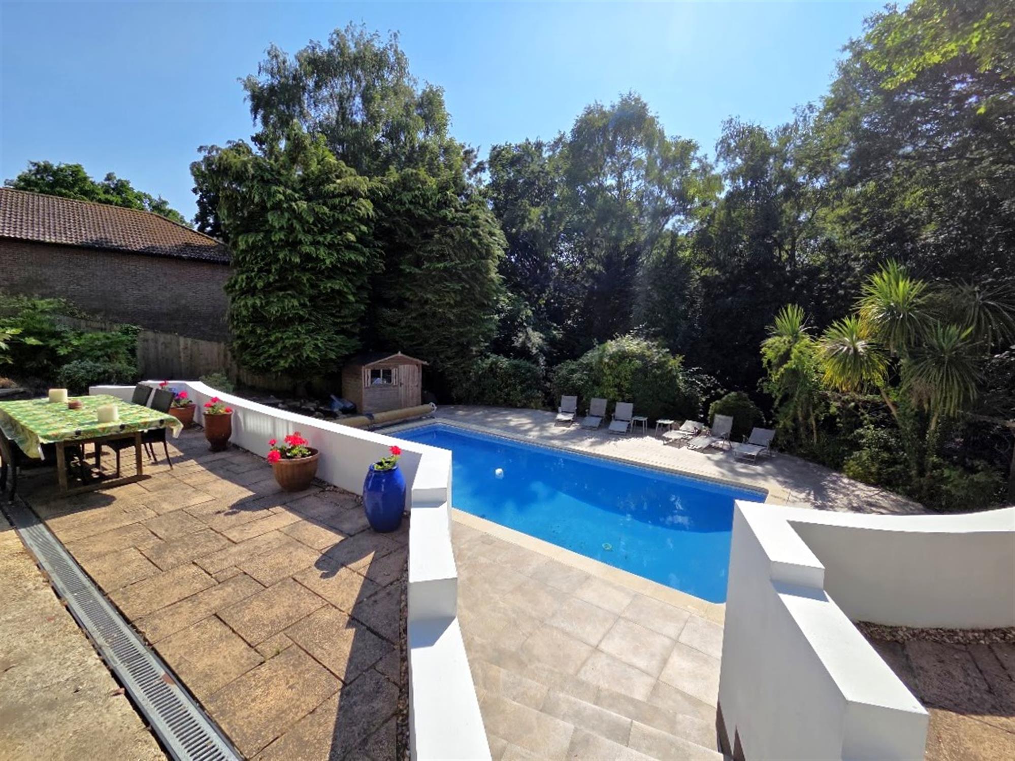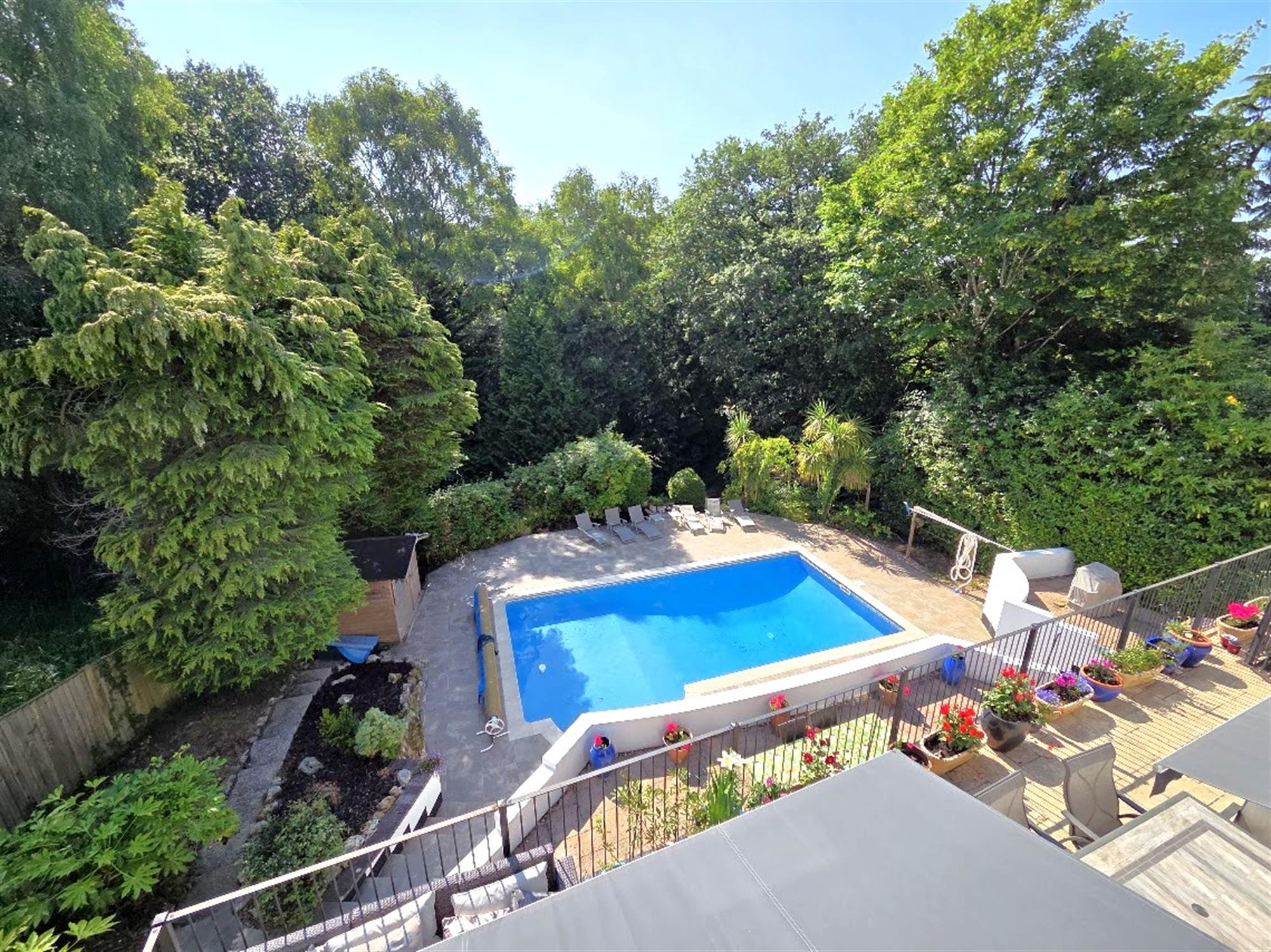 An enclosed secluded rear garden, westerly facing with mature tree borders, offering a high degree of privacy, a heated swimming pool set within terraces providing seating spaces, timber pump and summer house. A large veranda is located at the rear of the house, with covered retractable awnings providing shade from the sun, lots of space for tables, chairs, sun loungers, steps to the lower level with covered areas(beneath the veranda). The frontage has a driveway providing off-road parking spaces, and leading to the double garage.