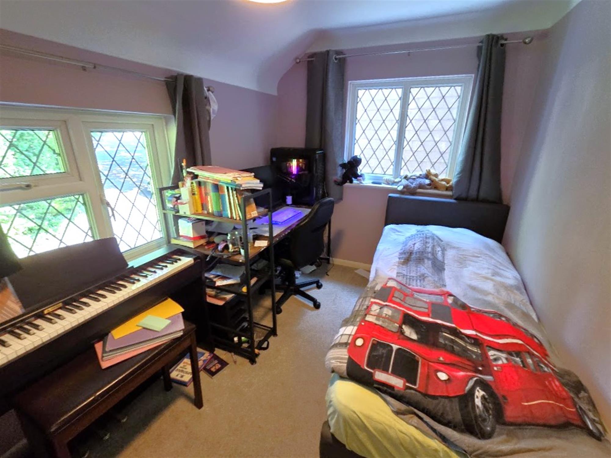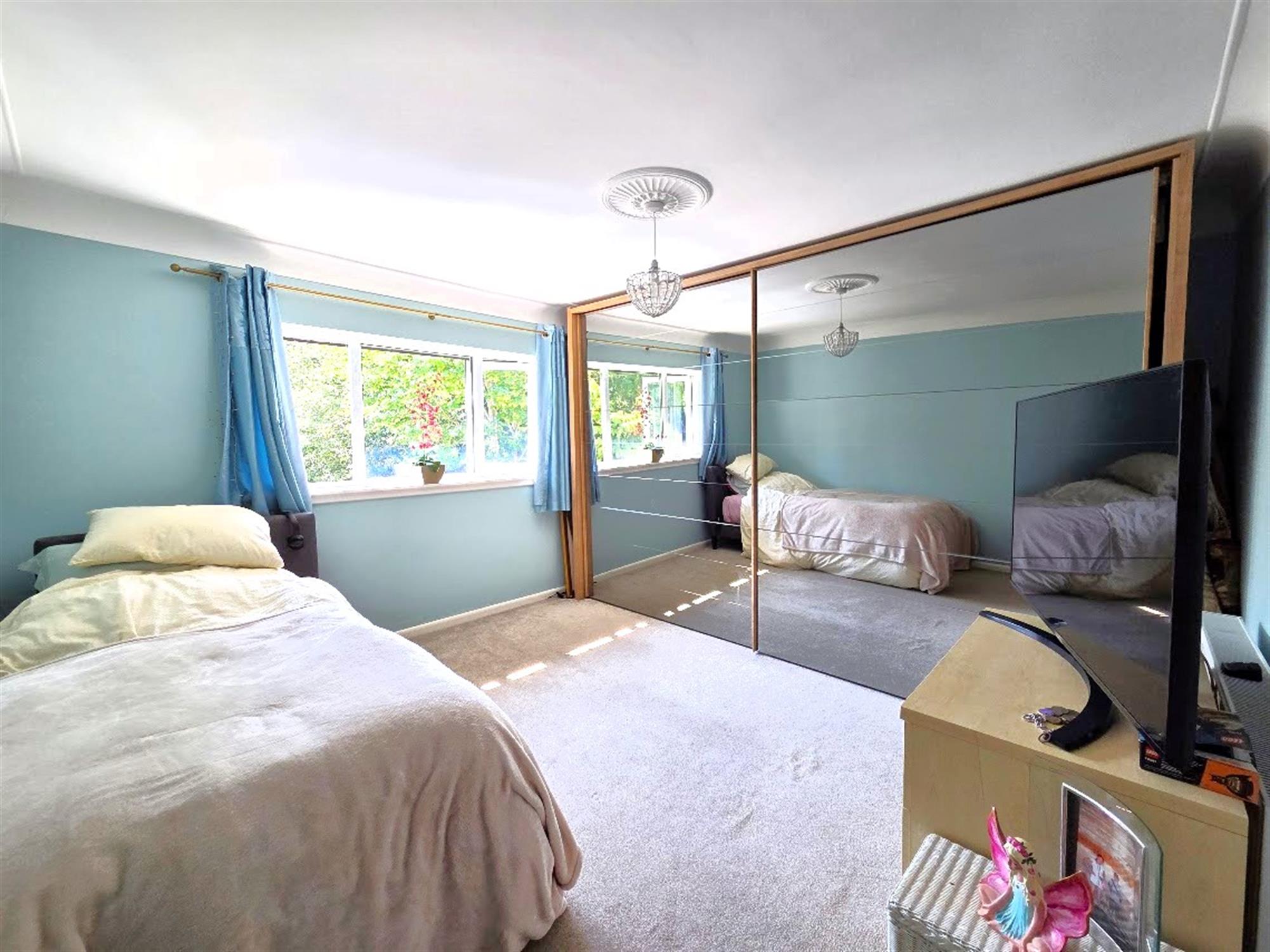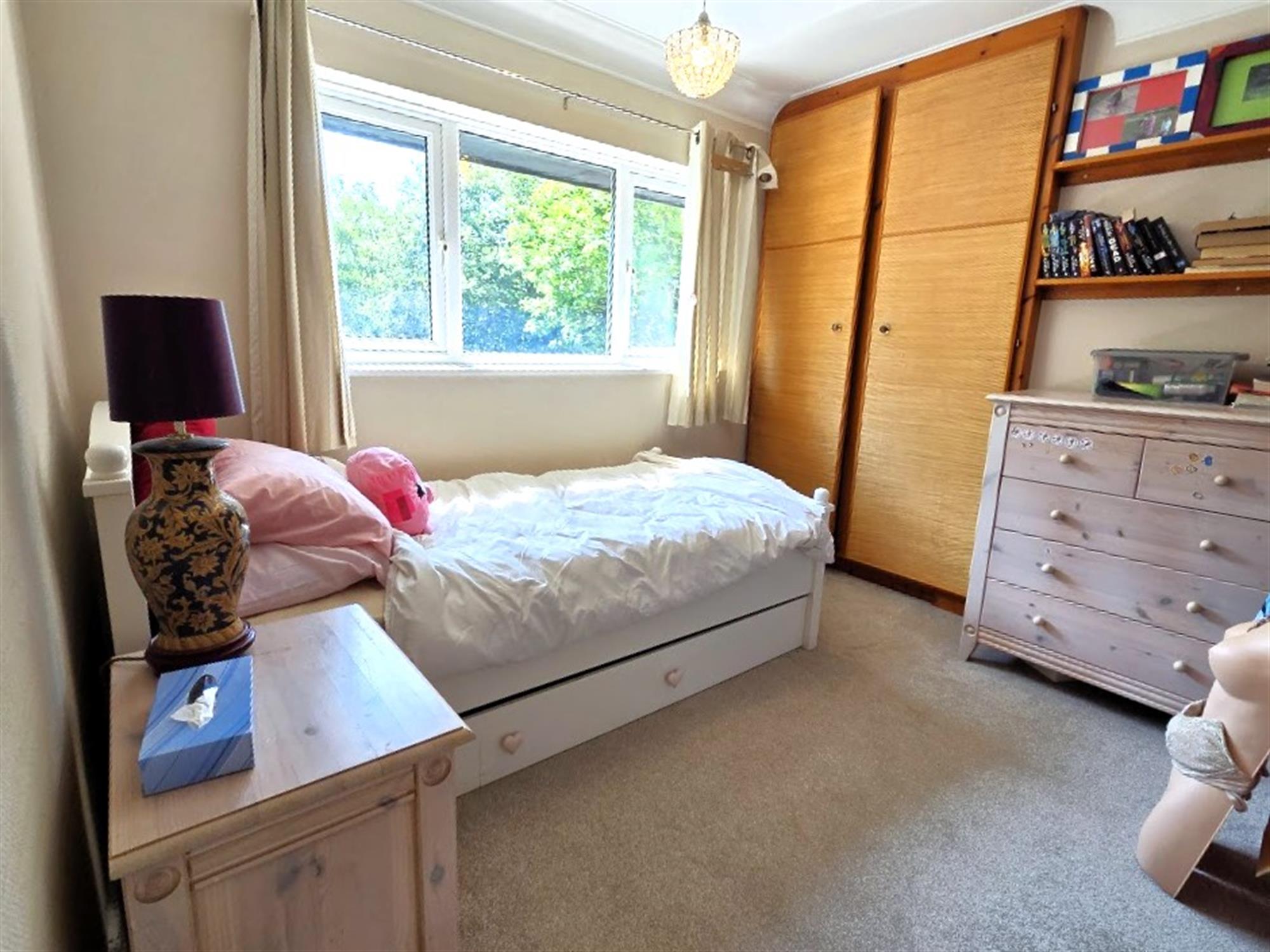 A dual-aspect room with double-glazed windows to the front and side aspects, radiator, carpeted flooring, fitted cupboard.