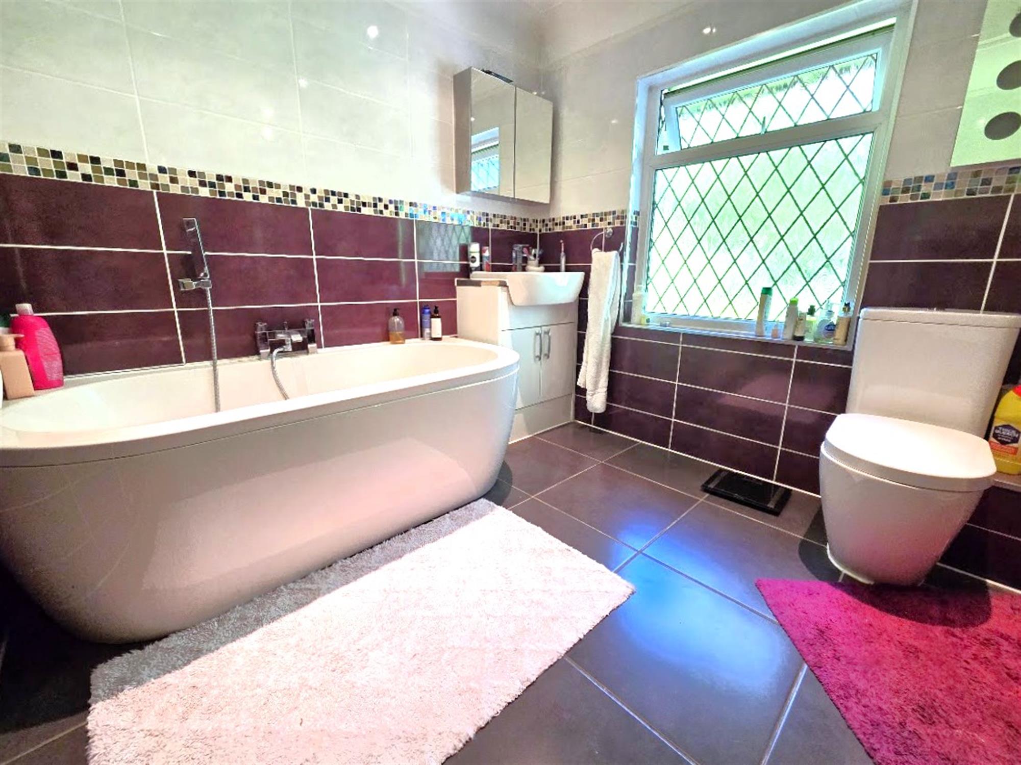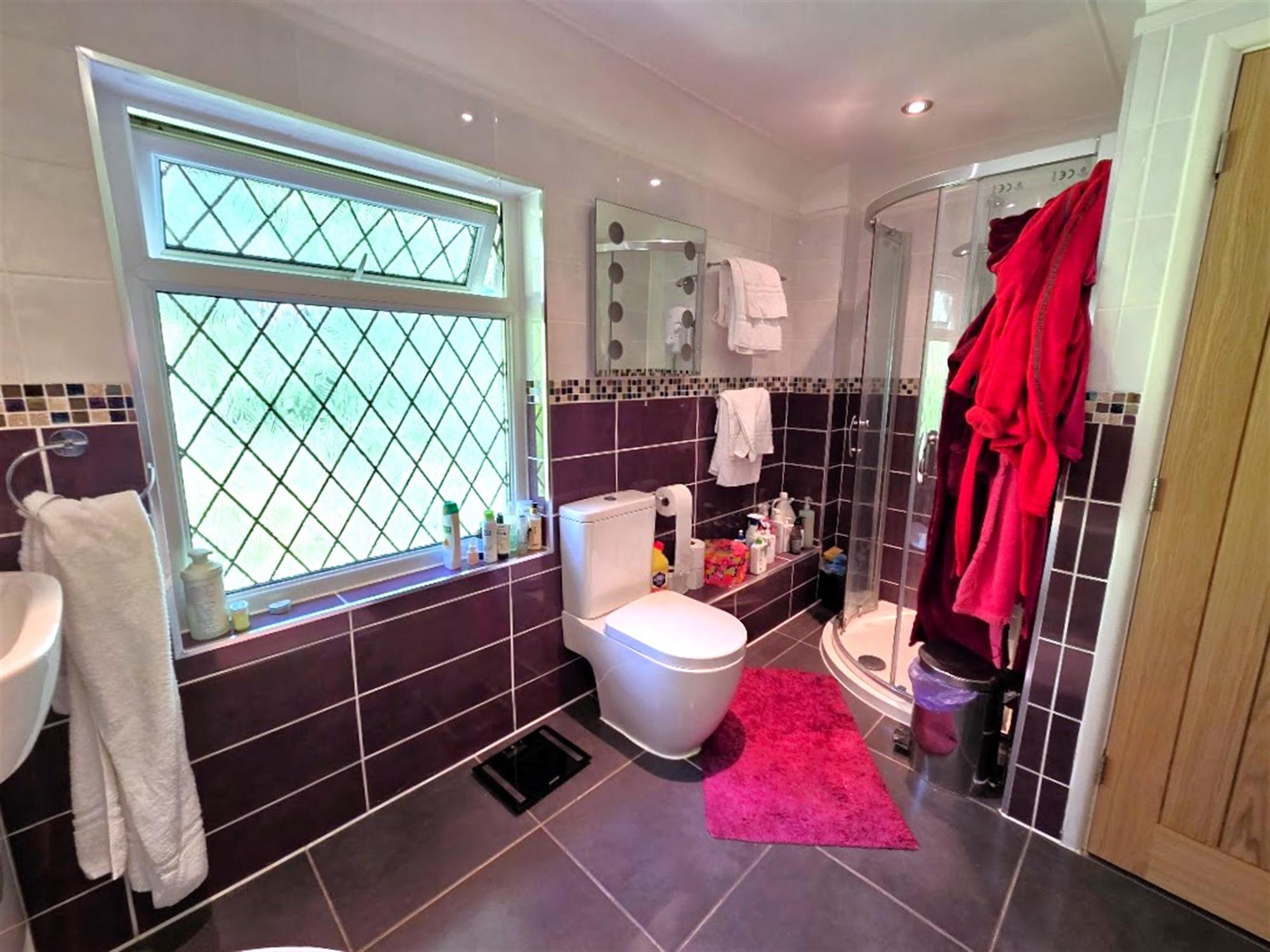 a four-piece suite comprising panel bath with central tap, low-level WC, pedestal wash basin, glazed shower enclosure, ceramic tiled walls and flooring, double-glazed window to the front aspect, chrome heated towel rail-radiator.