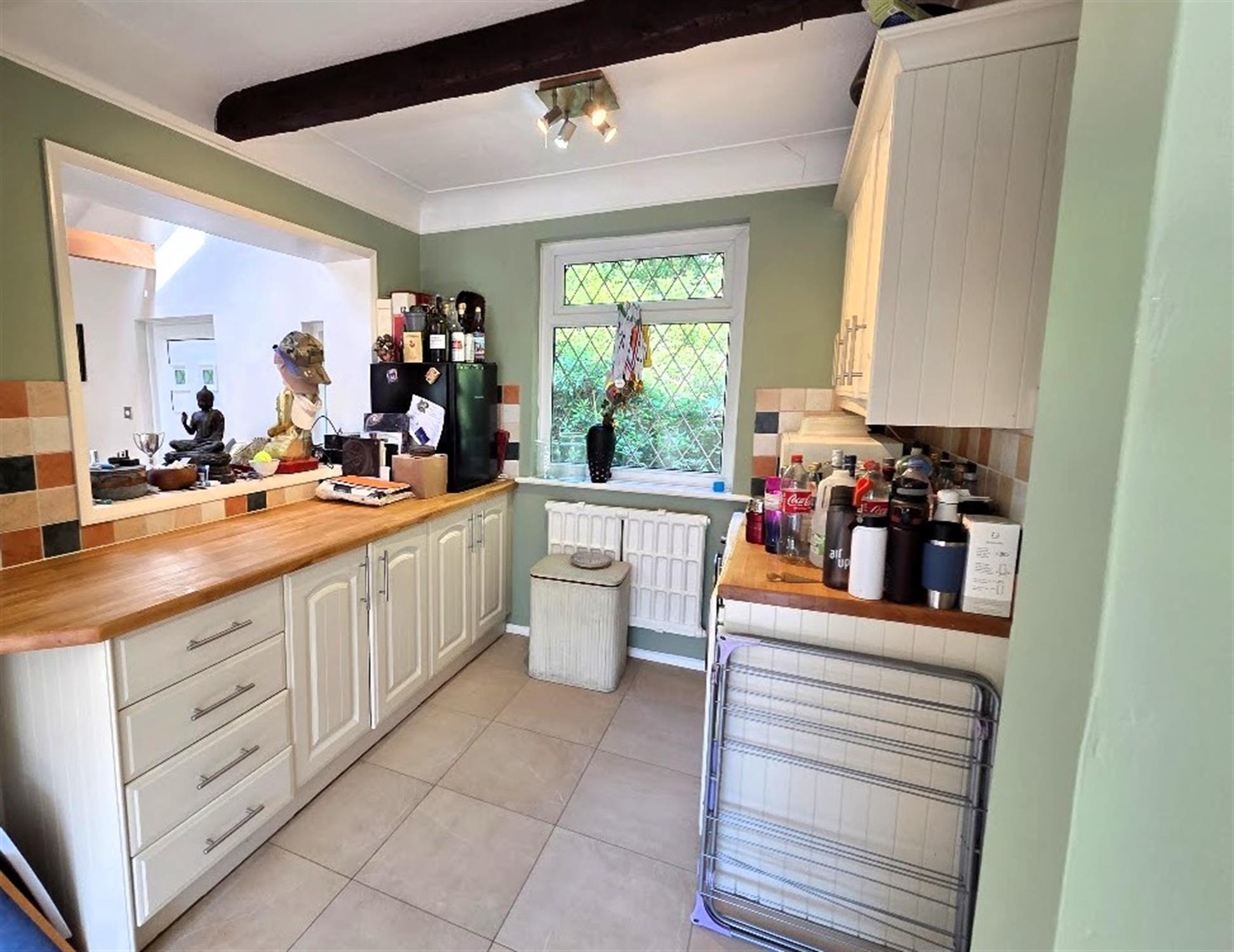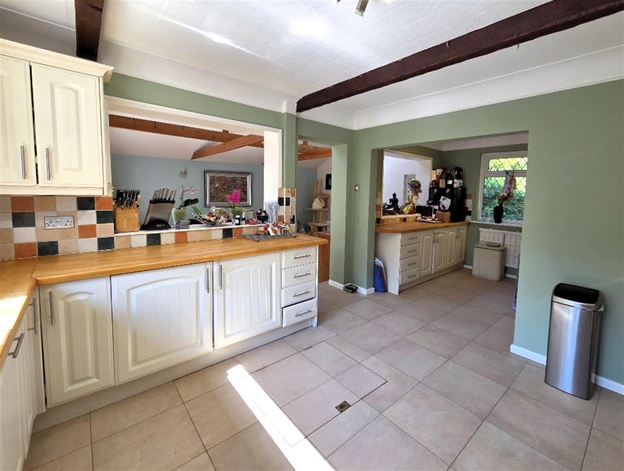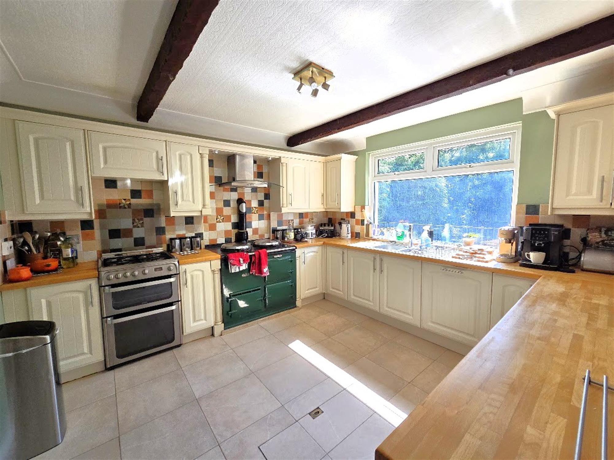 Dual aspect room with double-glazed windows to front and rear aspects, a good range of ivory-coloured wall and base unit cabinetry with timber block work surfacing and decorative tiled splash backs, space and plumbing for a range-sized cooker, fitted Aga with extractor hood over, stainless steel one and a half bowl sink, feature beamed ceiling, tiled laminate effect flooring, utility area with space and plumbing for a washing machine, tumble dryer, radiator, integrated dishwasher, access to the cellar, open aspects to the family room.