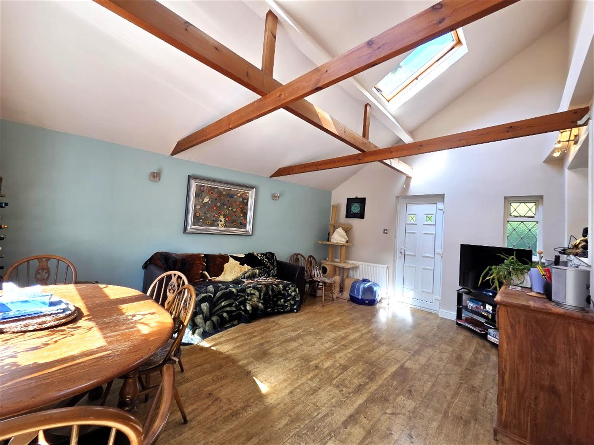 Timber effect laminated flooring, vaulted beamed ceiling, velux ceiling window, double-glazed door to the frontage, double-glazed door to the rear, double glazed window to the rear aspect, radiators, TV aerial point.
