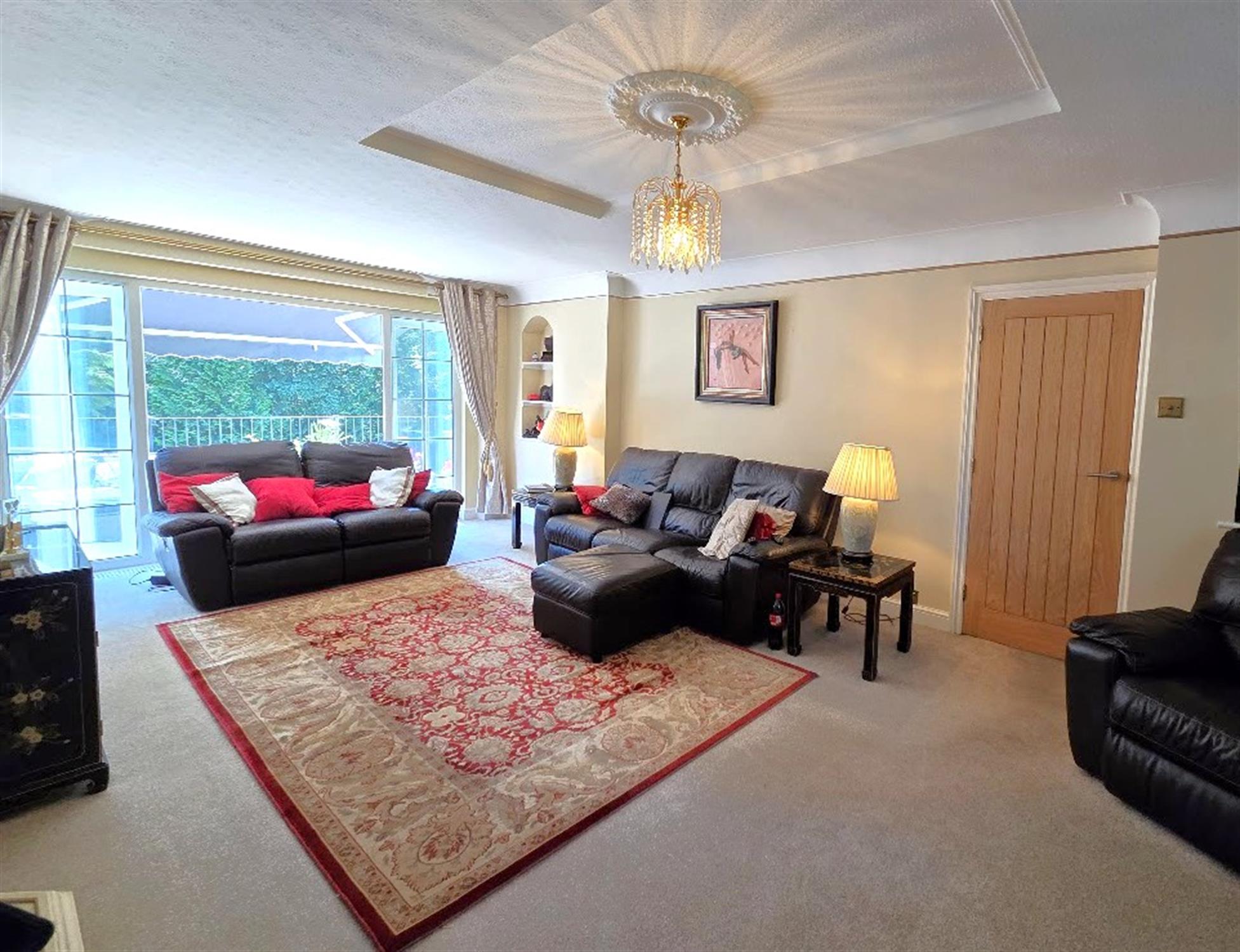 A triple-aspect room with double-glazed bay window to the front aspect, to the side aspect with french double-glazed doors to the rear overlooking the rear gardens, radiator alcove shelving, limestone fireplace with gas living flame fire, circular feature stained-glass window, TV aerial point, carpeted flooring.