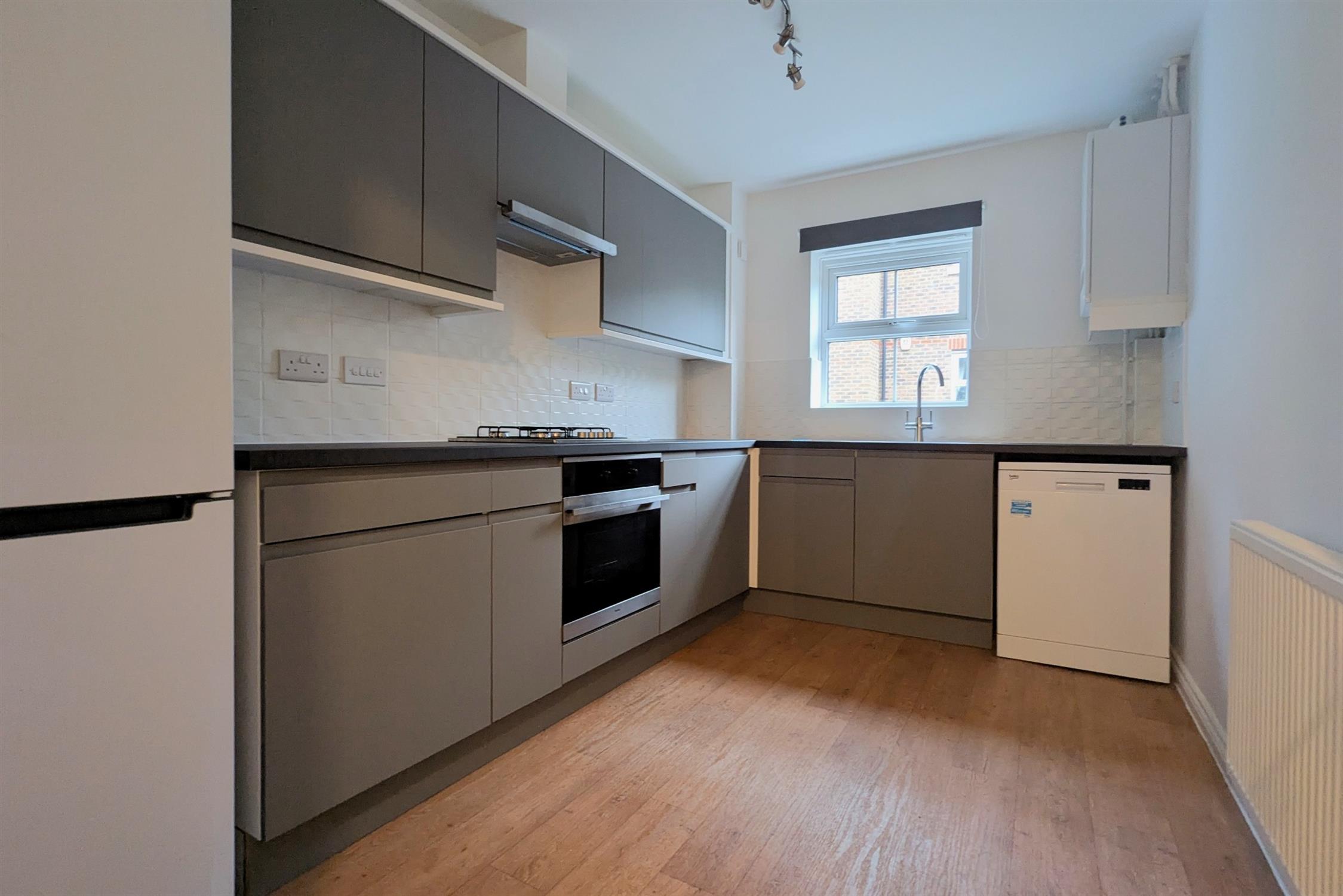 KITCHEN: Modern fitted eye and low level units with four ring gas hob, oven and integrated washing machine. Space and plumbing for fridge/freezer and dishwasher.