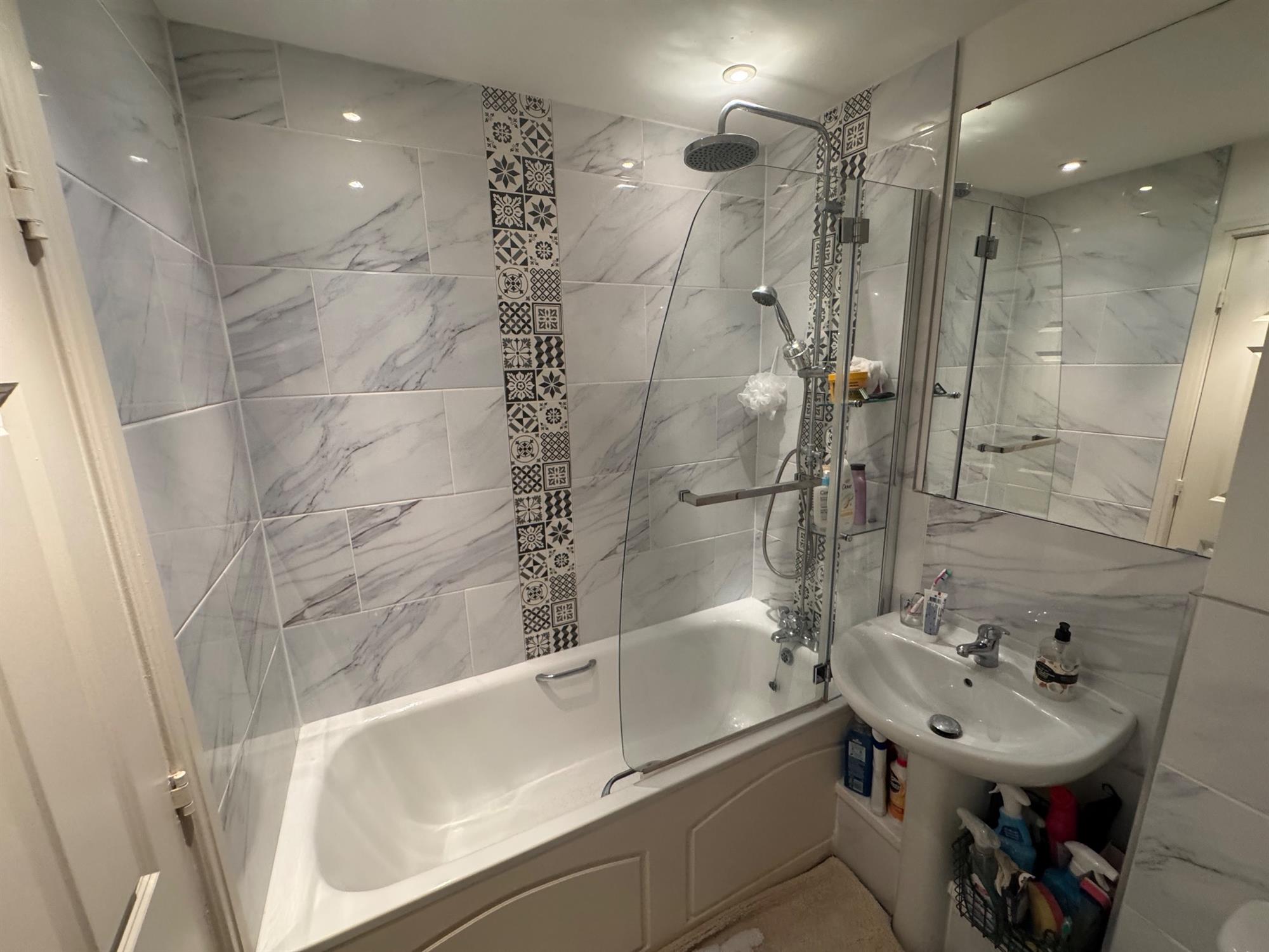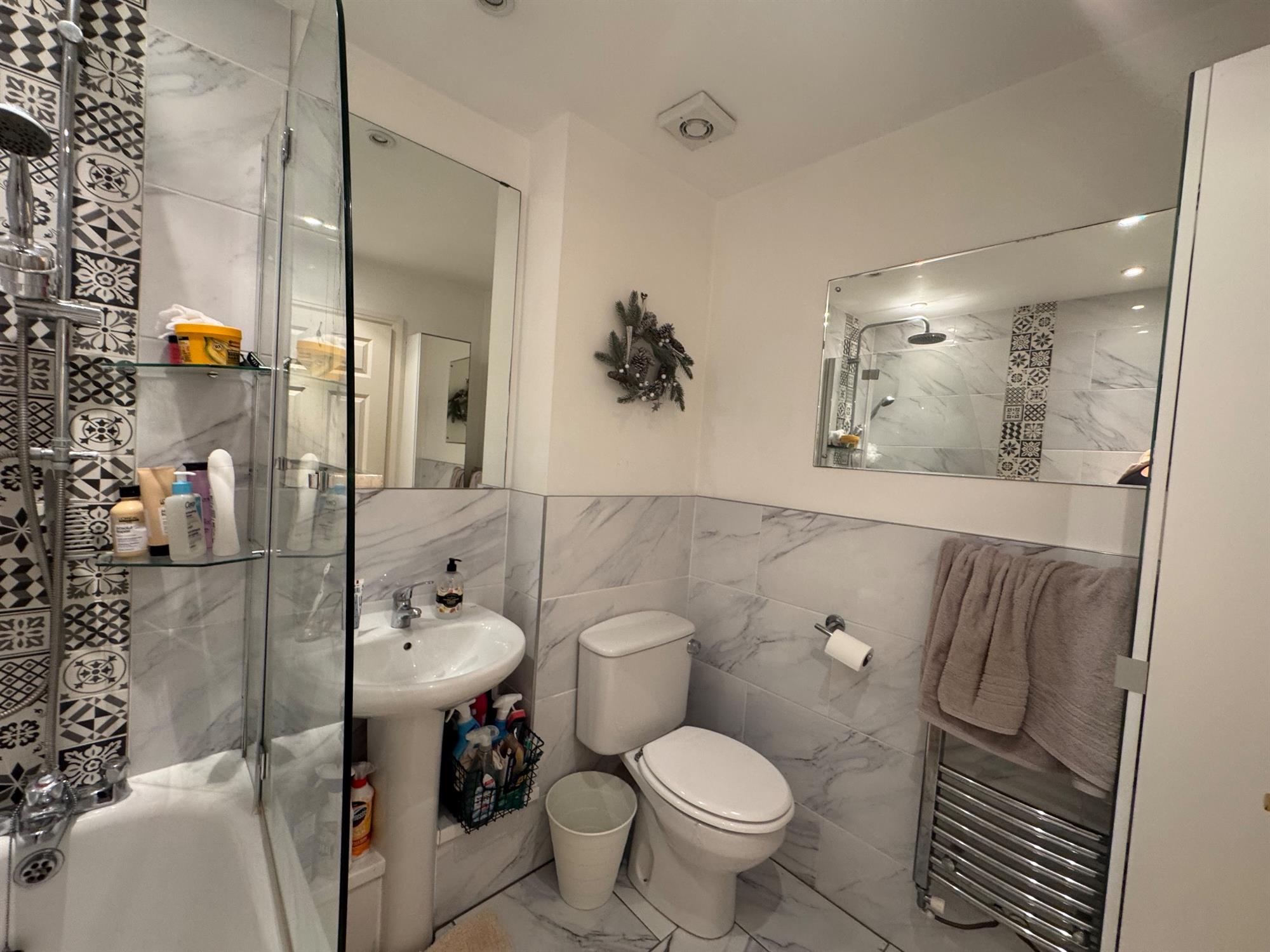 BATHROOM: Modern white suite comprising WC, wash hand basin, heated towel rail and shower cubicle with adjustable and rainfall showers.