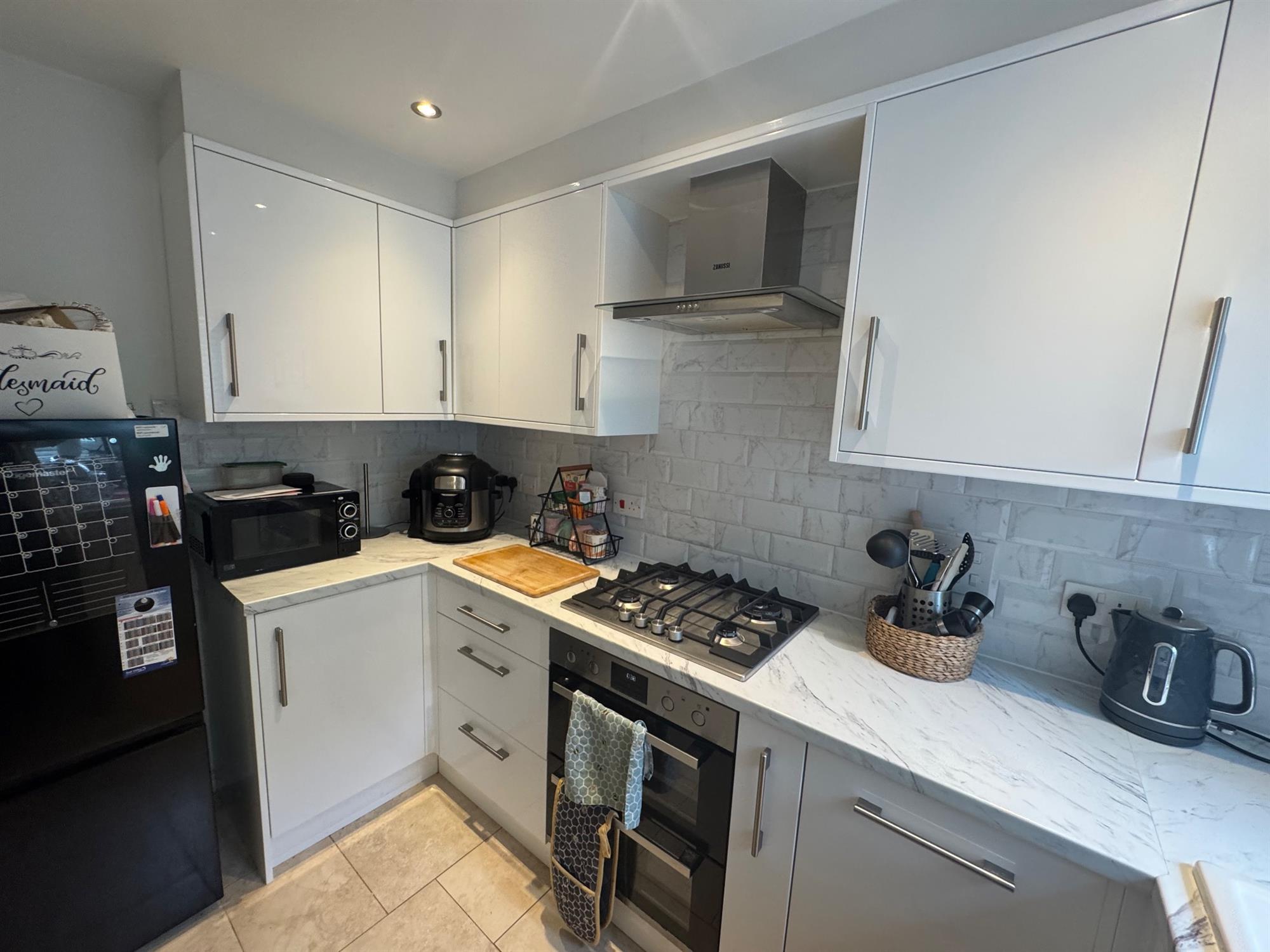 KITCHEN: Modern fitted high and low-level units with electric oven and hob.