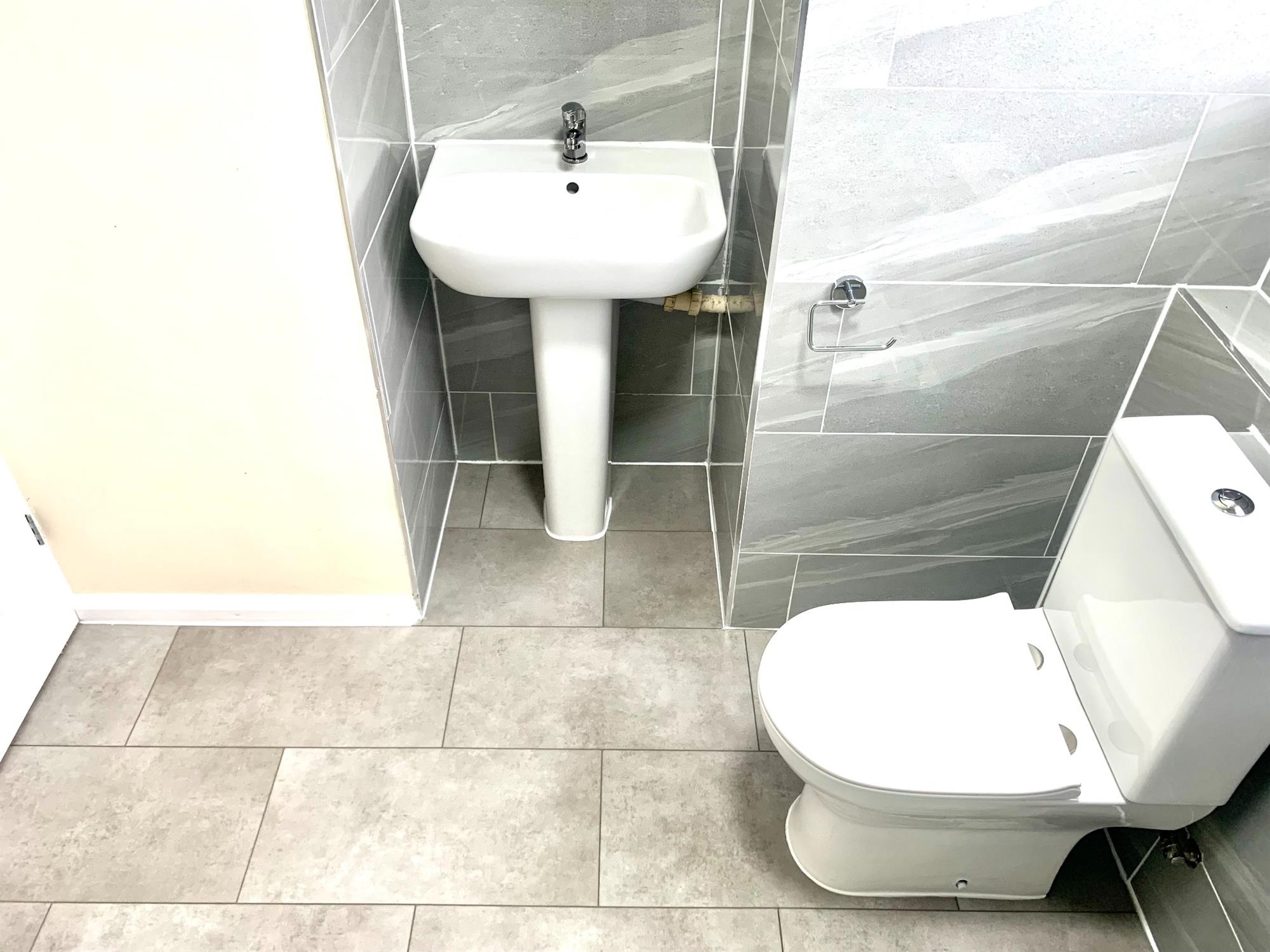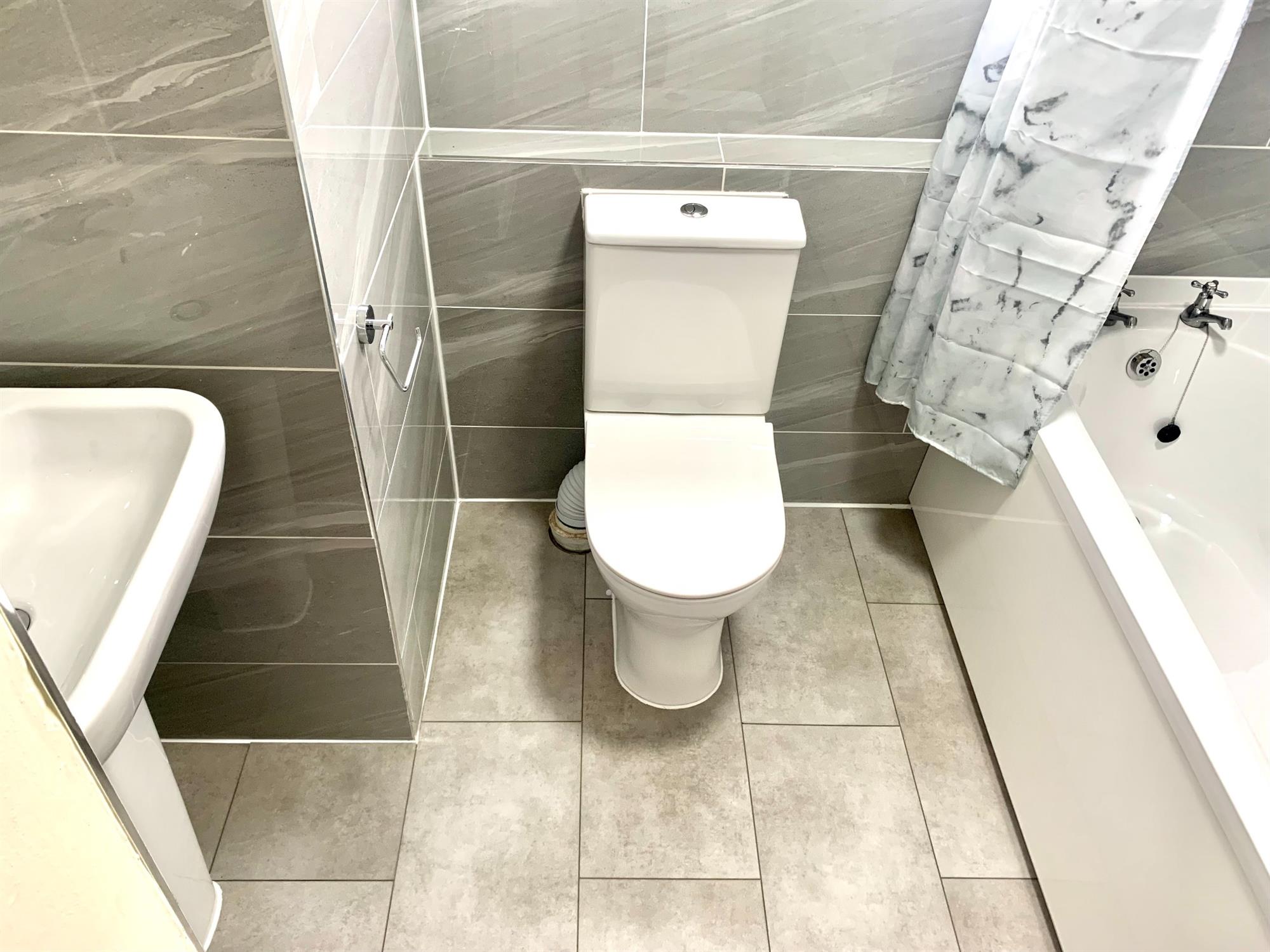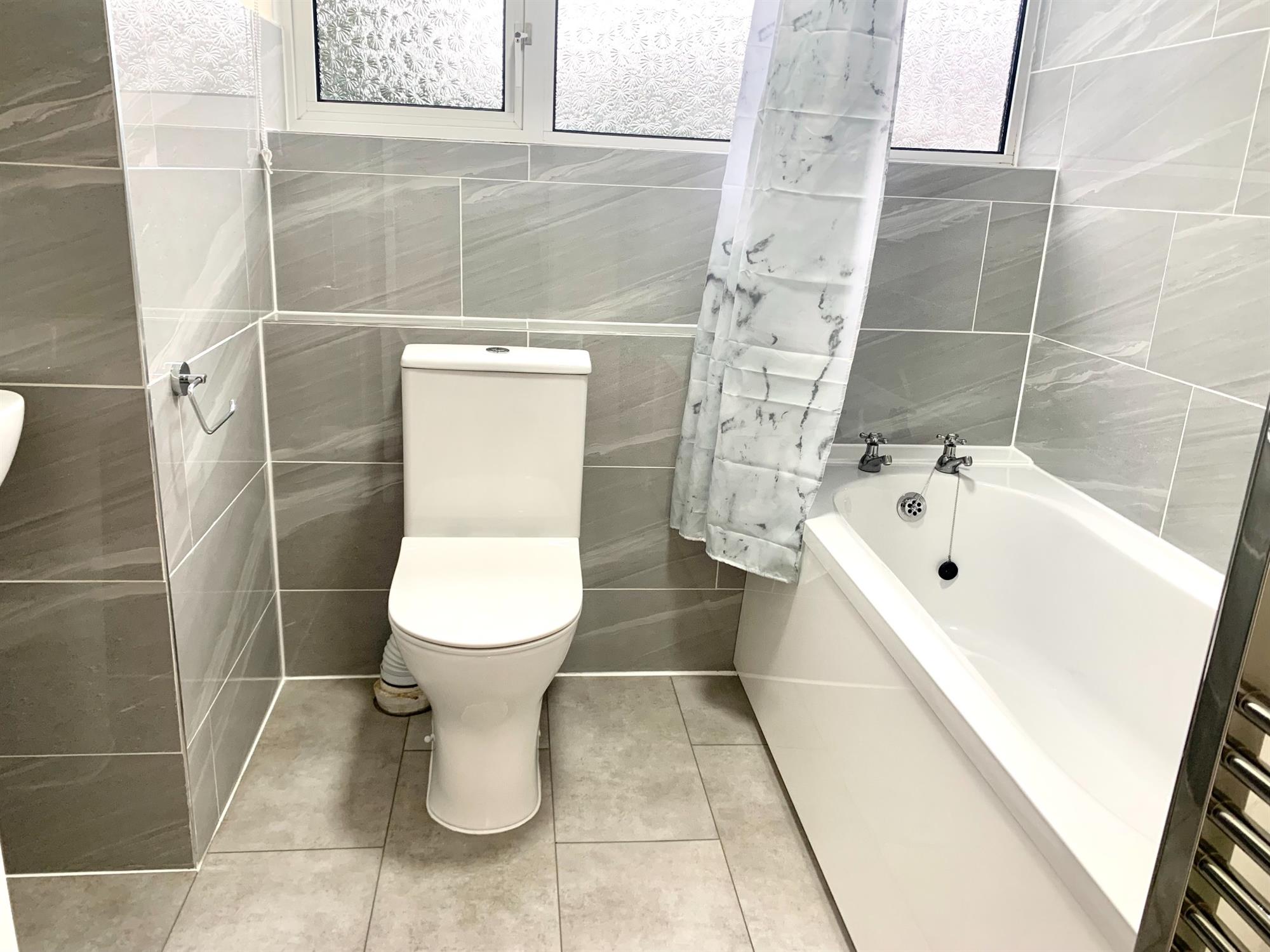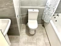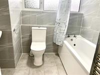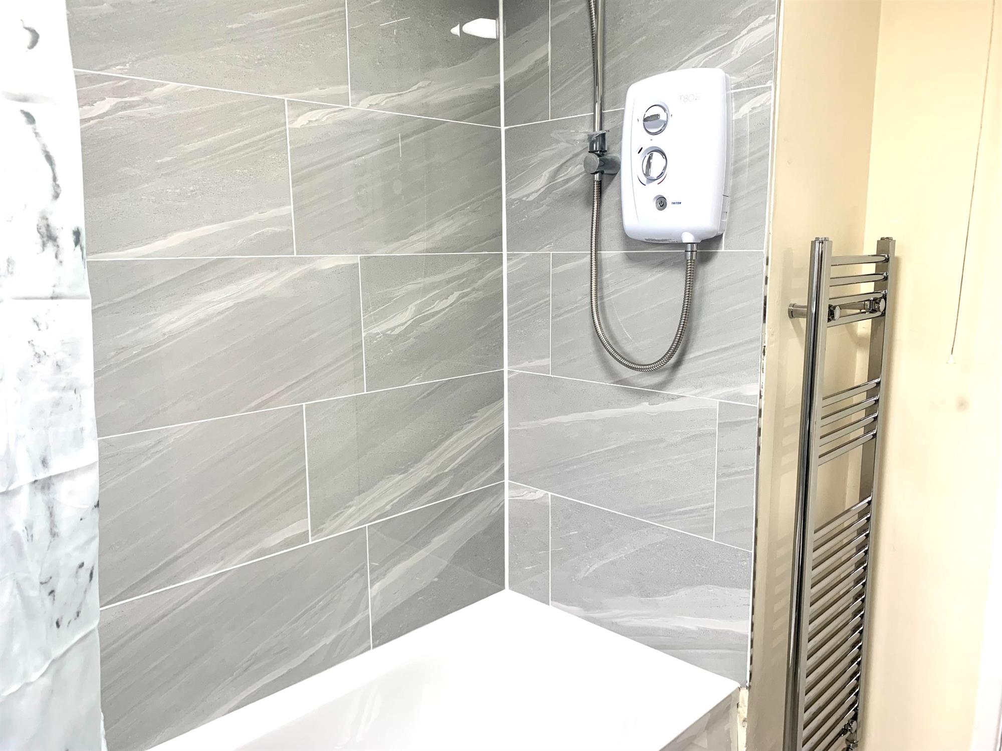 BATHROOM – Newly fitted white suite bathroom with electric shower over bath, sink and toilet. Window to rear.