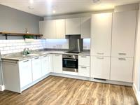 Modern white gloss wall and base units with integral f/freezer, integral slimline dishwasher, electric hob and electric oven.