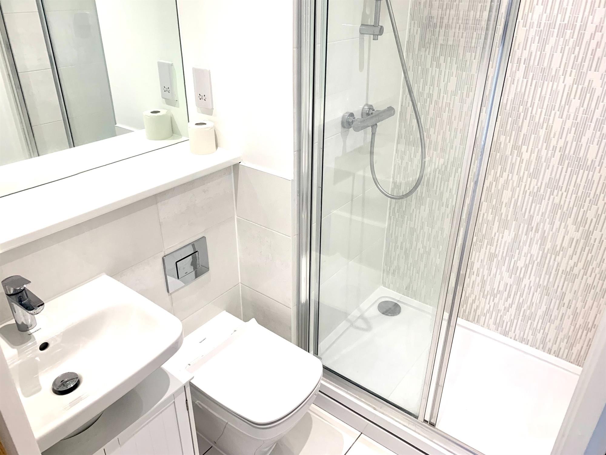 White suite with sink with vanity unit, toilet and double shower cubicle.