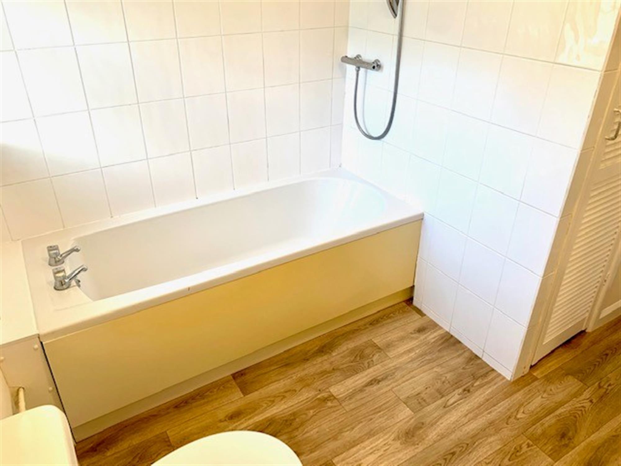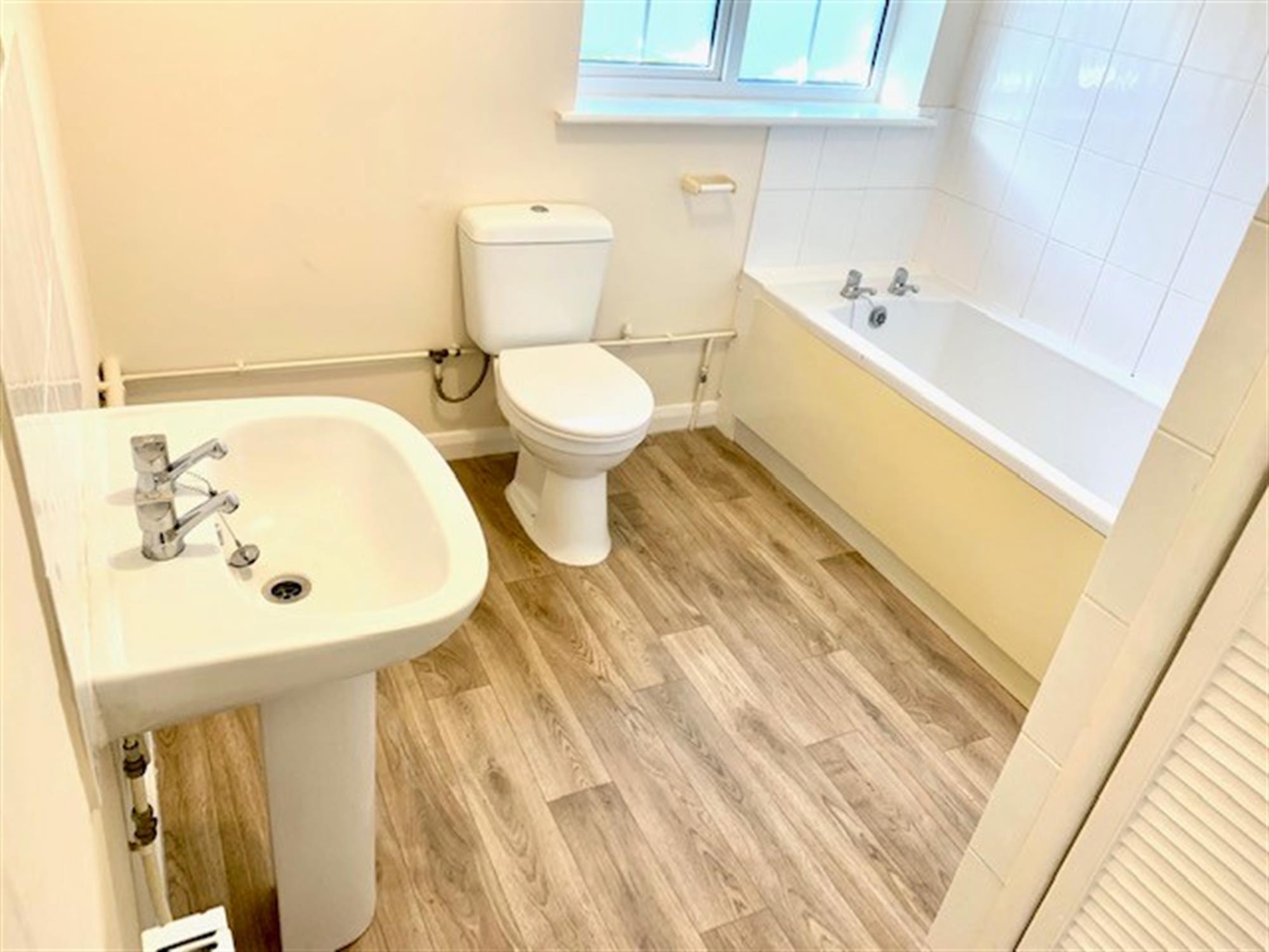 White suite with toilet, basin and bath with shower over. Window to rear. Cupboard off housing combi boiler and storage.