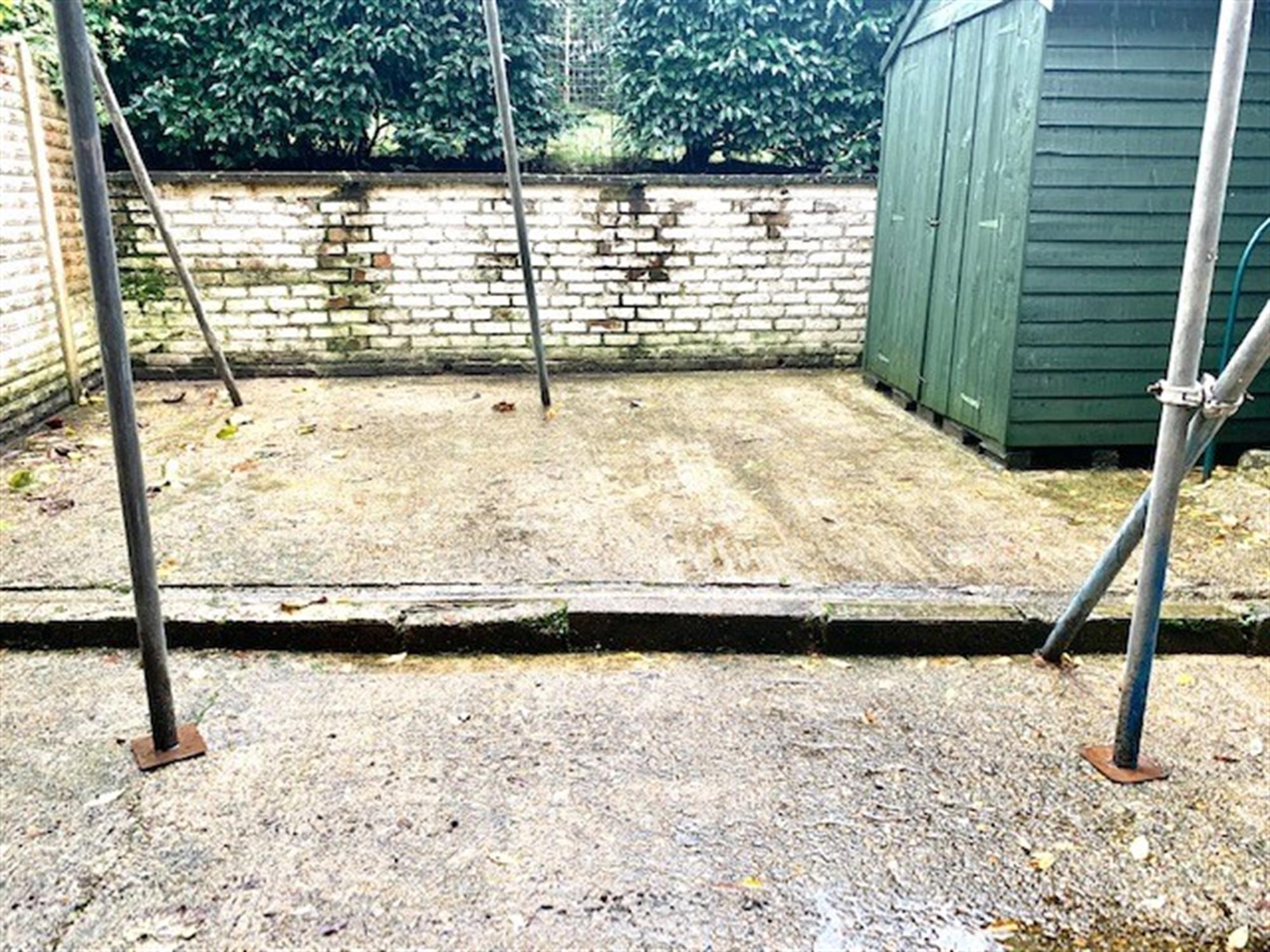 Patio area with shed and steps leading to garden.