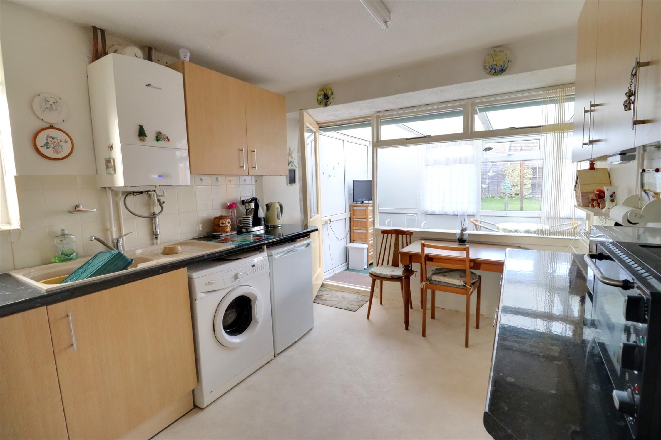 Fitted with a range of wall and base units with worksurfaces over, integral gas hob and electric oven with extractor hood over, spaces for fridge and freezer, and washing machine, wall mounted combination boiler, inset one and half bowl sink and drainer, side aspect double glazed window, rear aspect window and door leading to the conservatory.