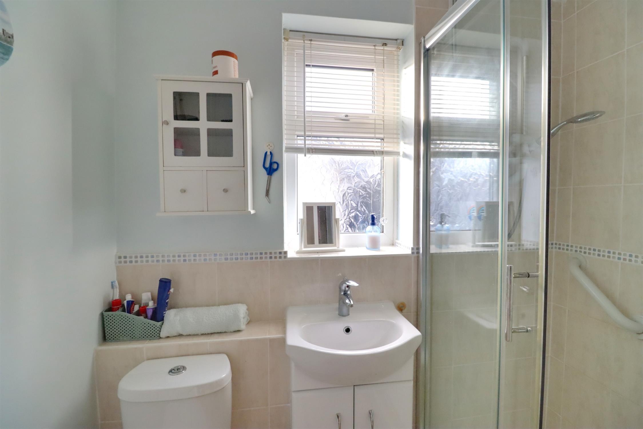 Shower cubicle with electric shower and folding seat, low-level WC, vanity unit, radiator, side aspect double glazed window.