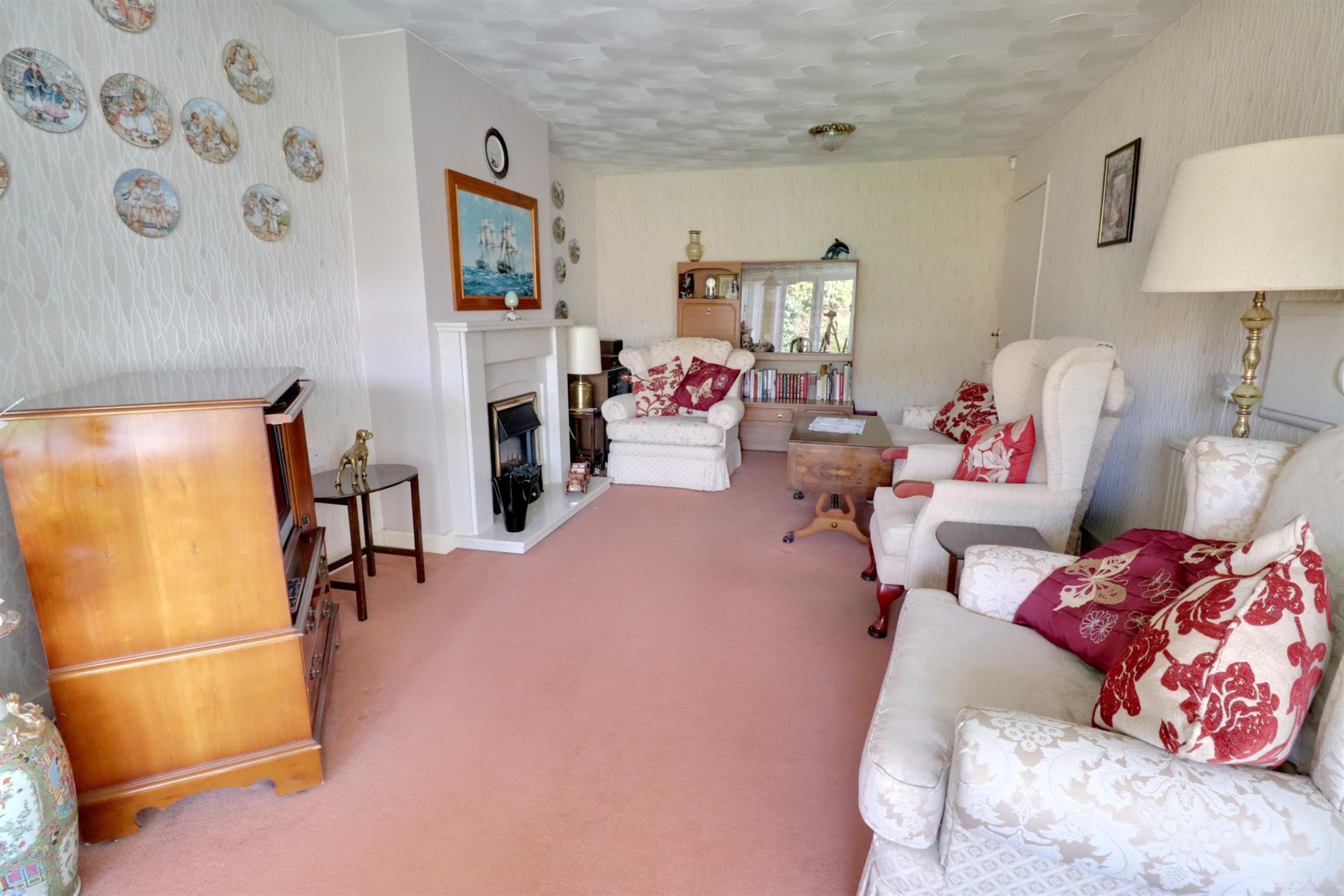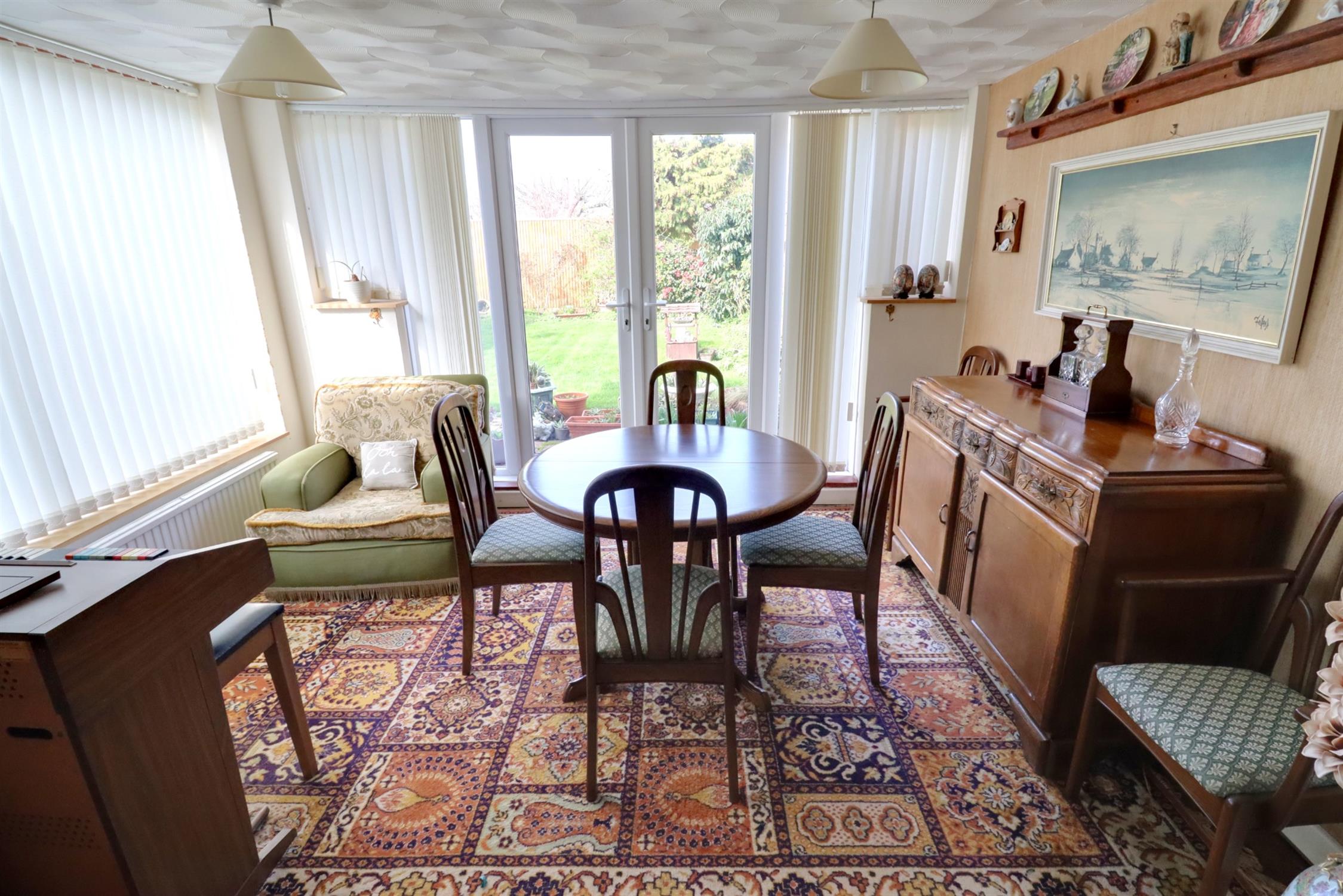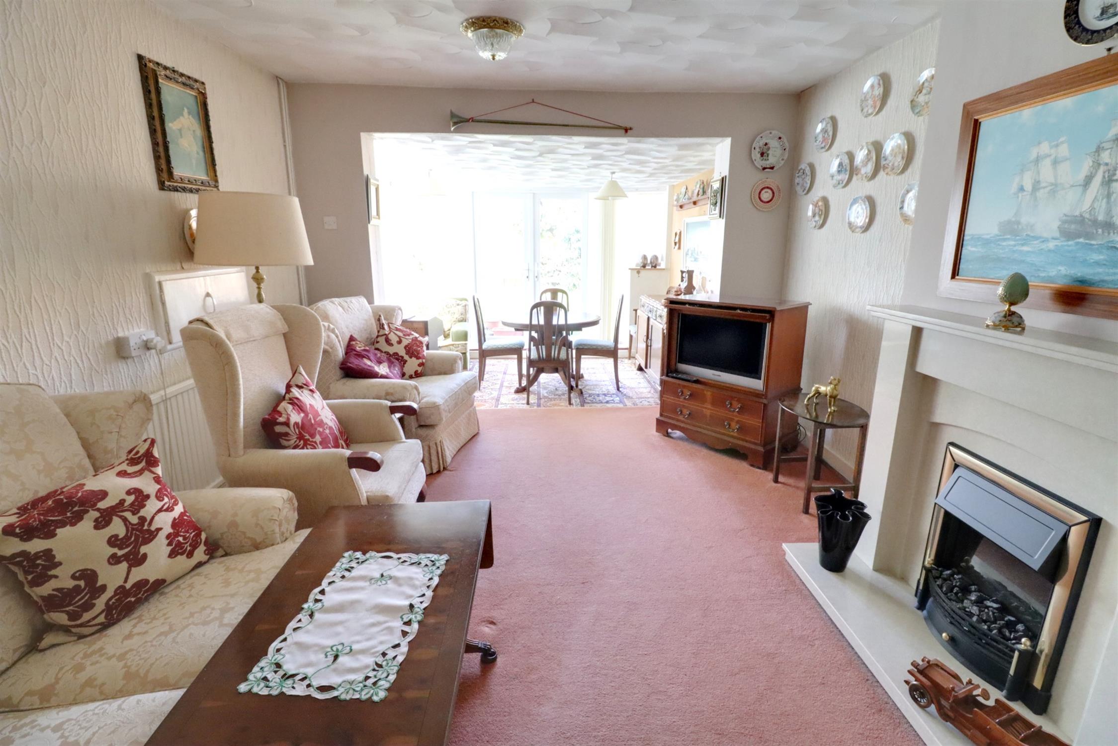 Feature fireplace with stone hearth and surround with inset electric fire, radiator, TV point, small step down to dining area, radiator, double windows to side and rear, double glazed French doors to rear garden.