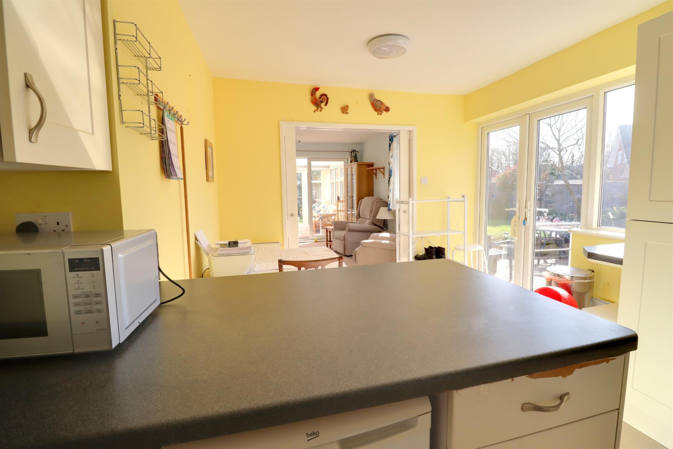 Fitted with a range of wall and base units with worksurfaces over, integral electric oven and gas hob with extractor hood over, spaces for washing machine, dishwasher, fridge and freezer, inset one and a half bowl sink and drainer, tiled flooring, radiator, cupboard housing the combination boiler, front and side aspect double glazed windows, side aspect double glazed French doors leading to the garden, sliding doors leading to the lounge.