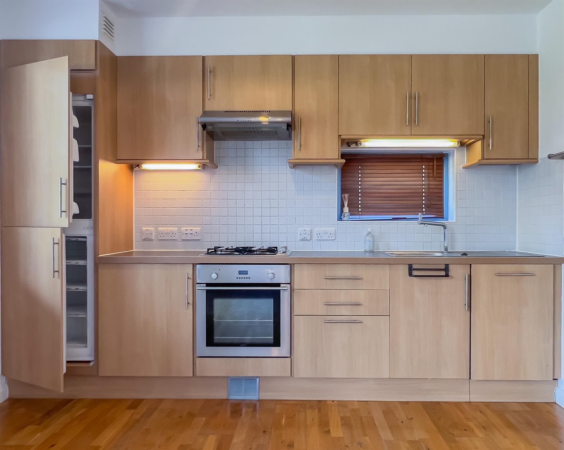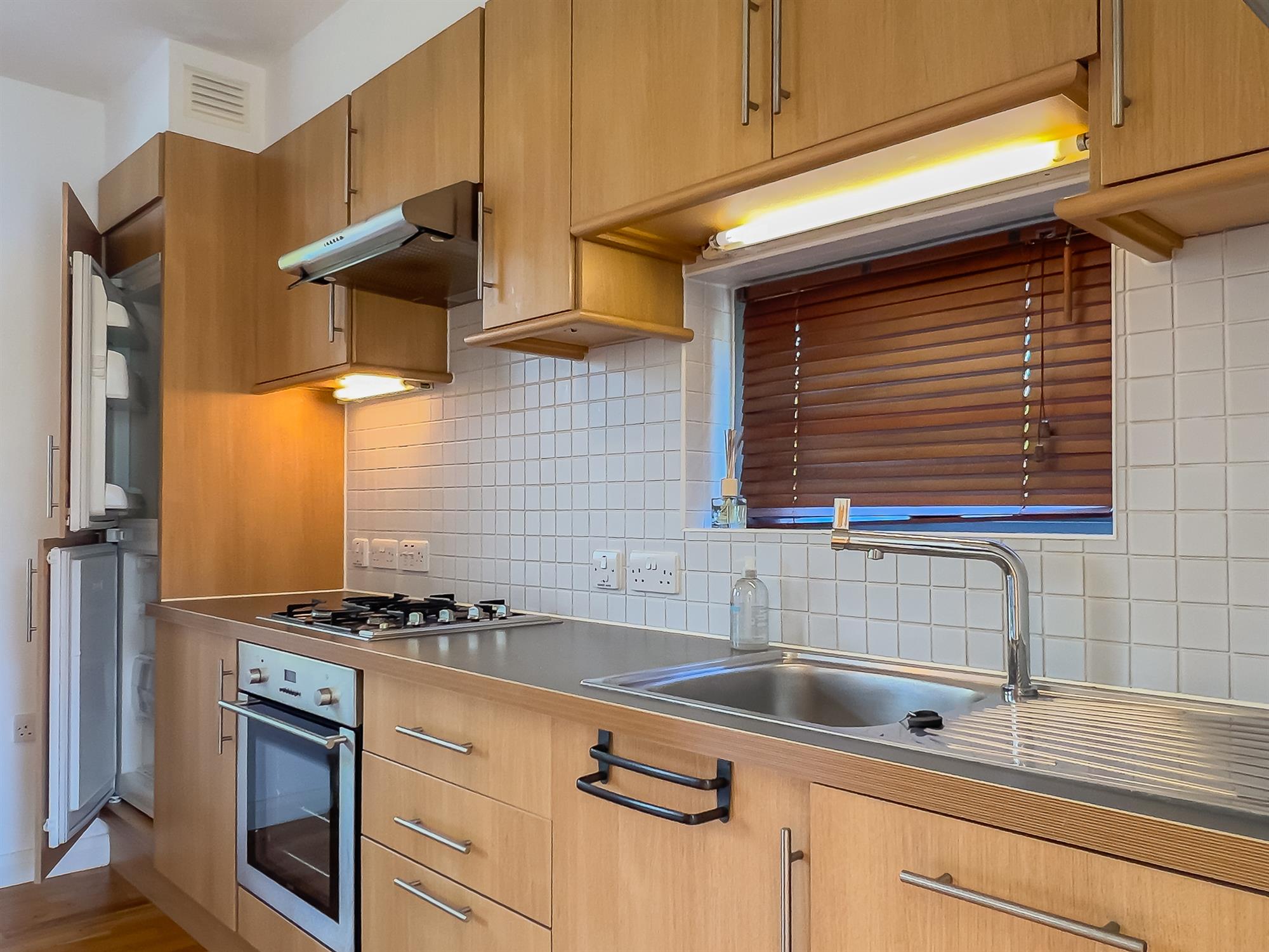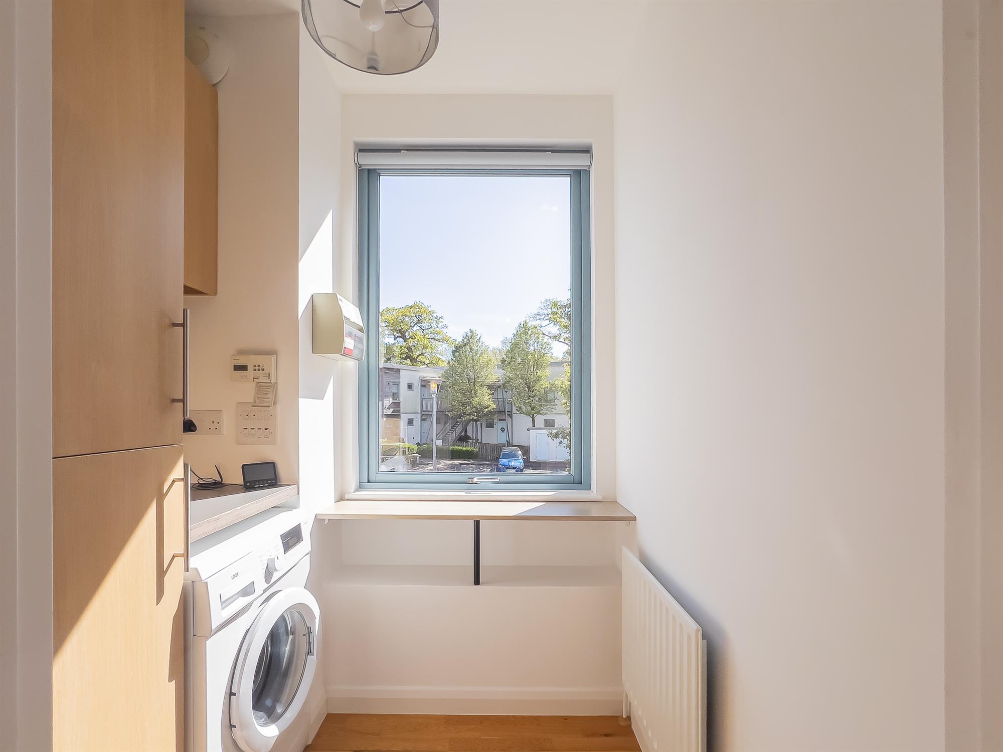 Window to front. Range of cupboards. Space and plumbing for washing machine with working surfaces over. Wood effect laminate flooring. Radiator.