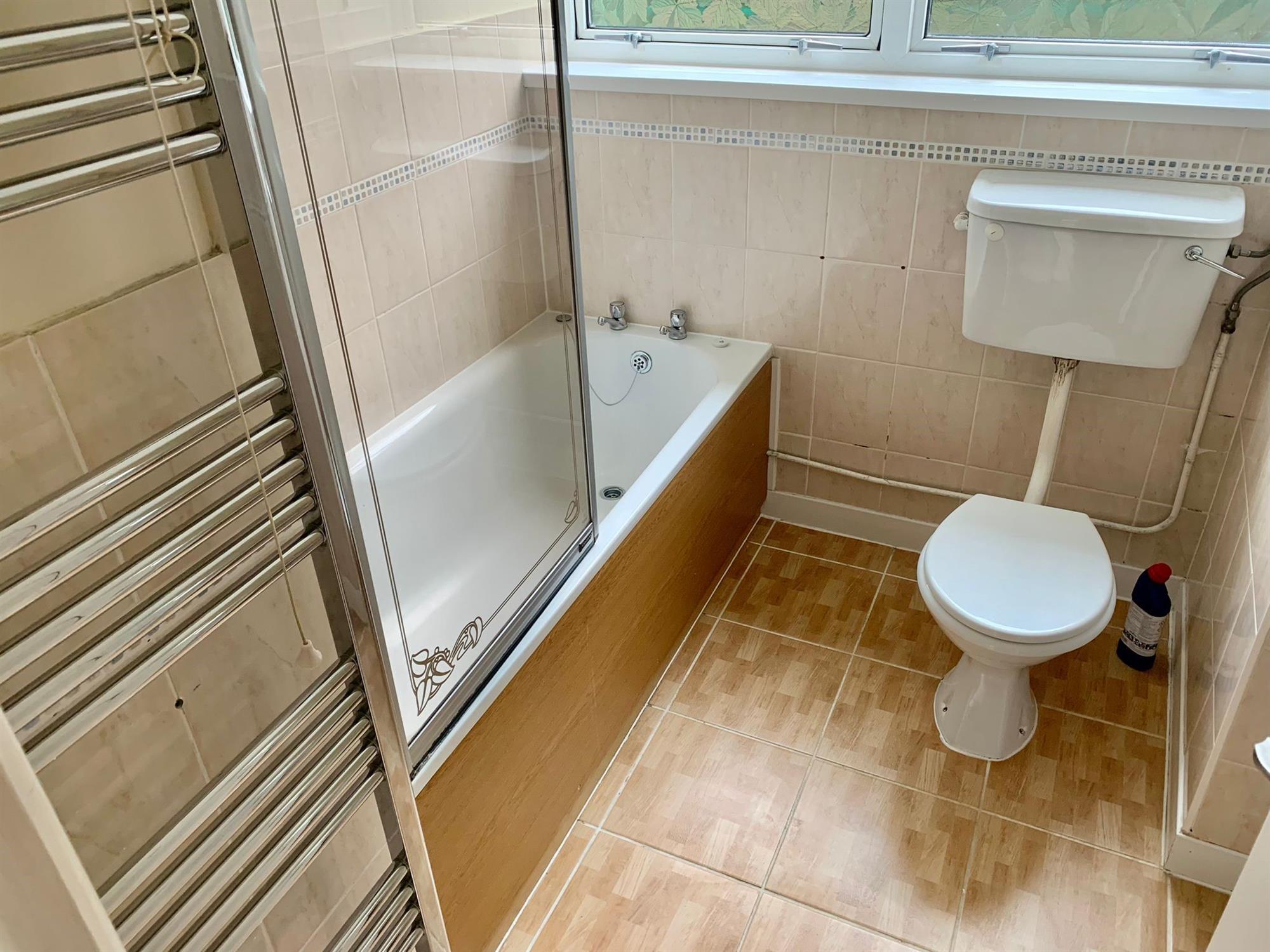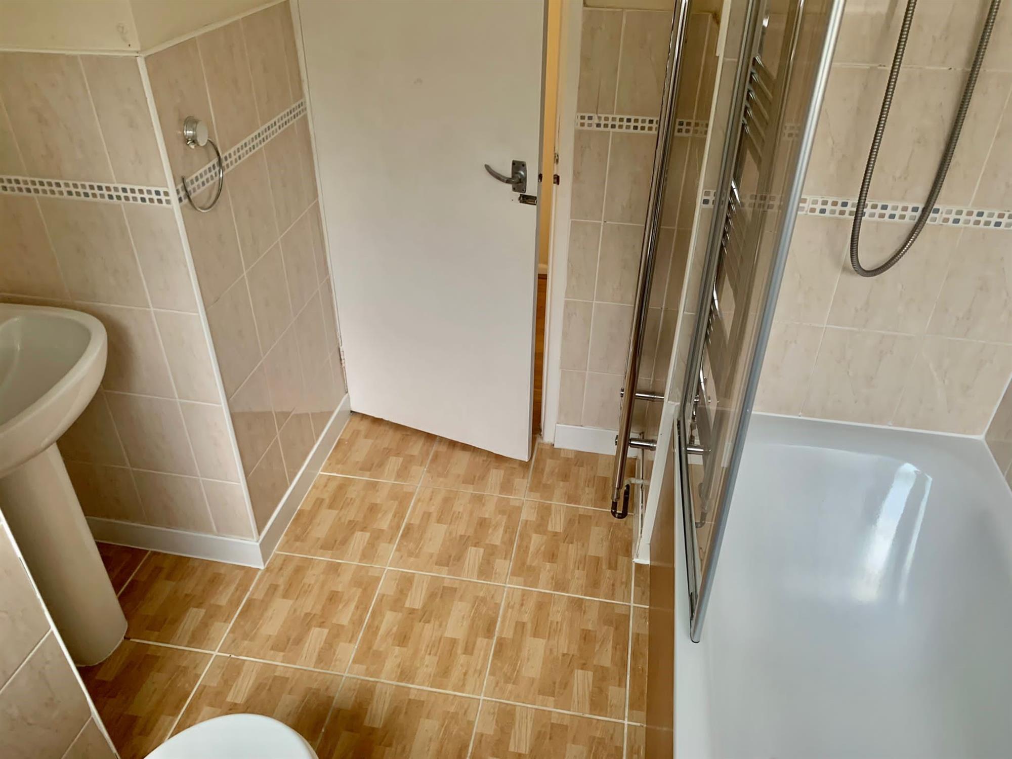 BATHROOM: A white three piece suite with electric shower over bath, WC and hand basin.