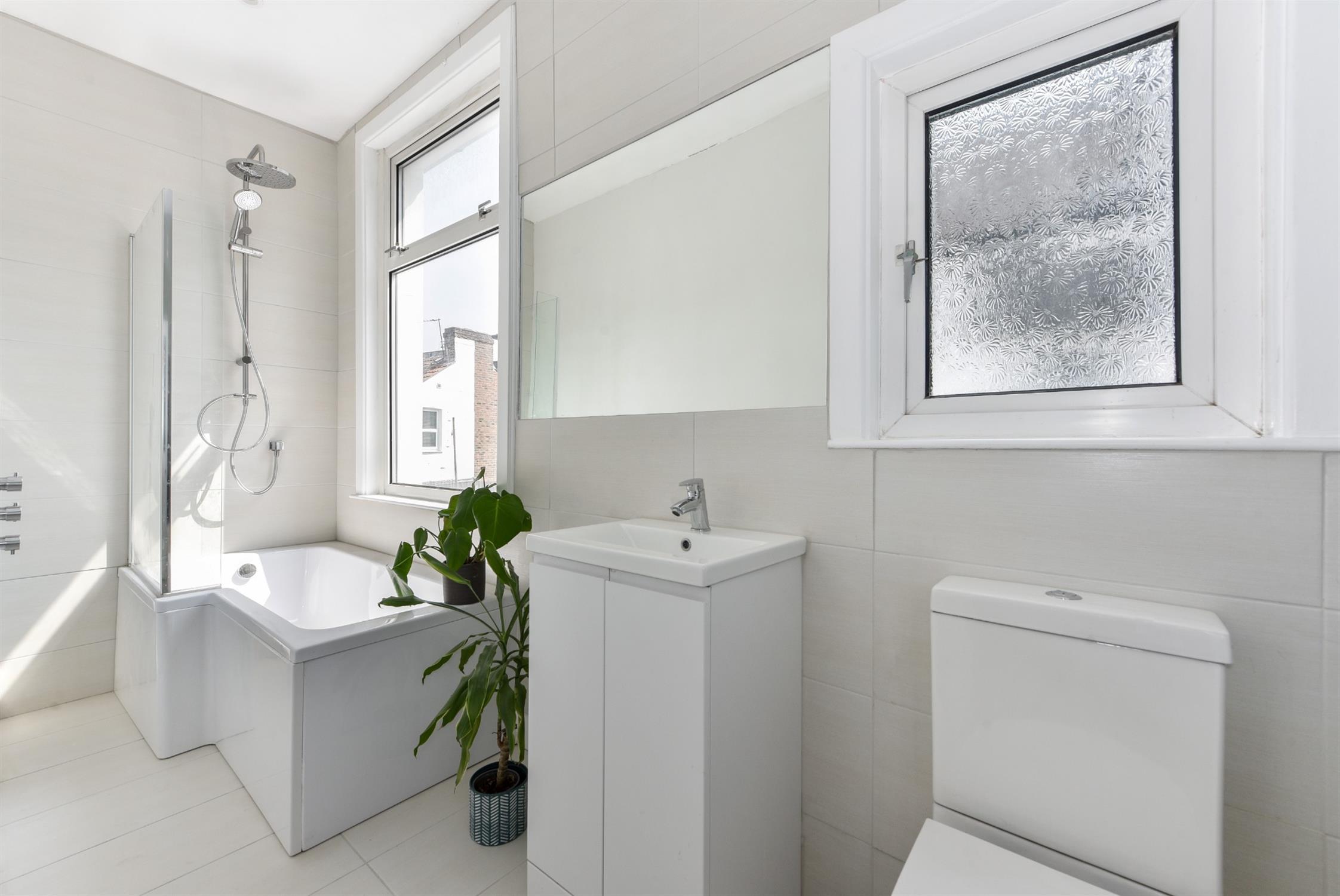 Smooth ceiling, double glazed obscured window, WC, wash hand basin with tiled splash back, ladder radiator, tiled walls, tiled floor.
