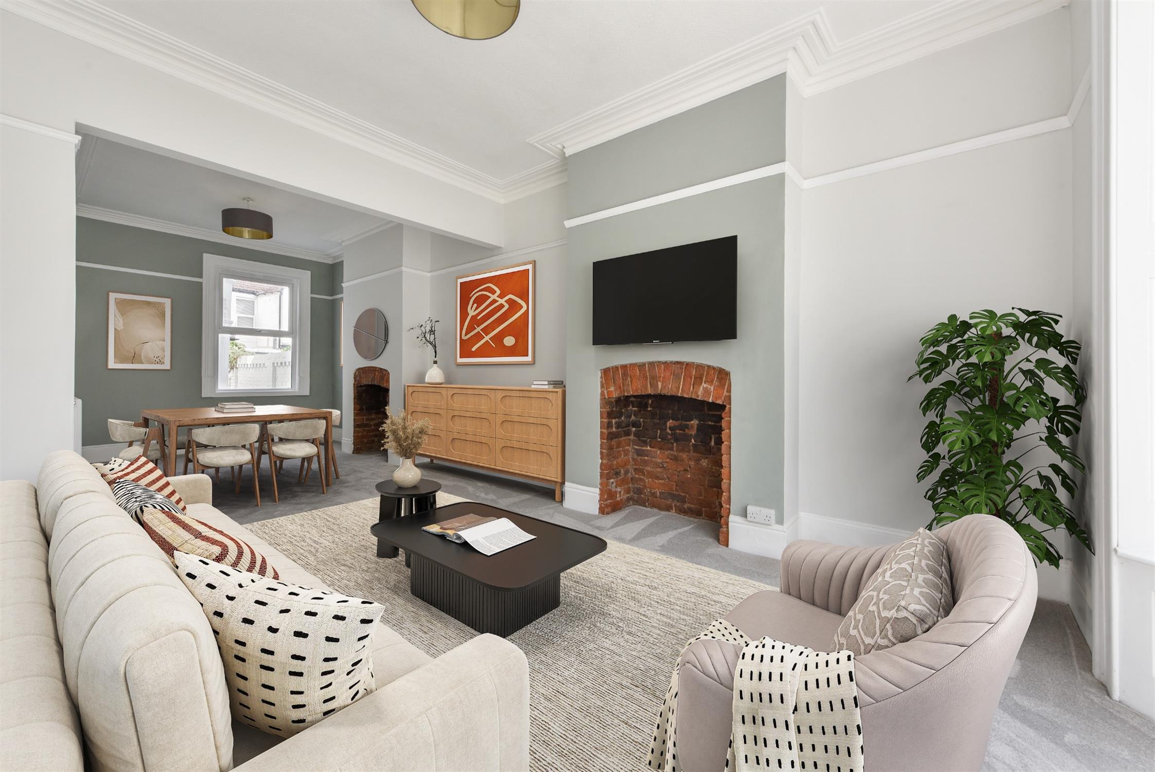 Papered ceiling, ornate cornicing, two ceiling roses, picture rails, double glazed bay windows to front aspect, double glazed window to rear aspect, two radiators, two exposed brick open fire places, fitted carpet.