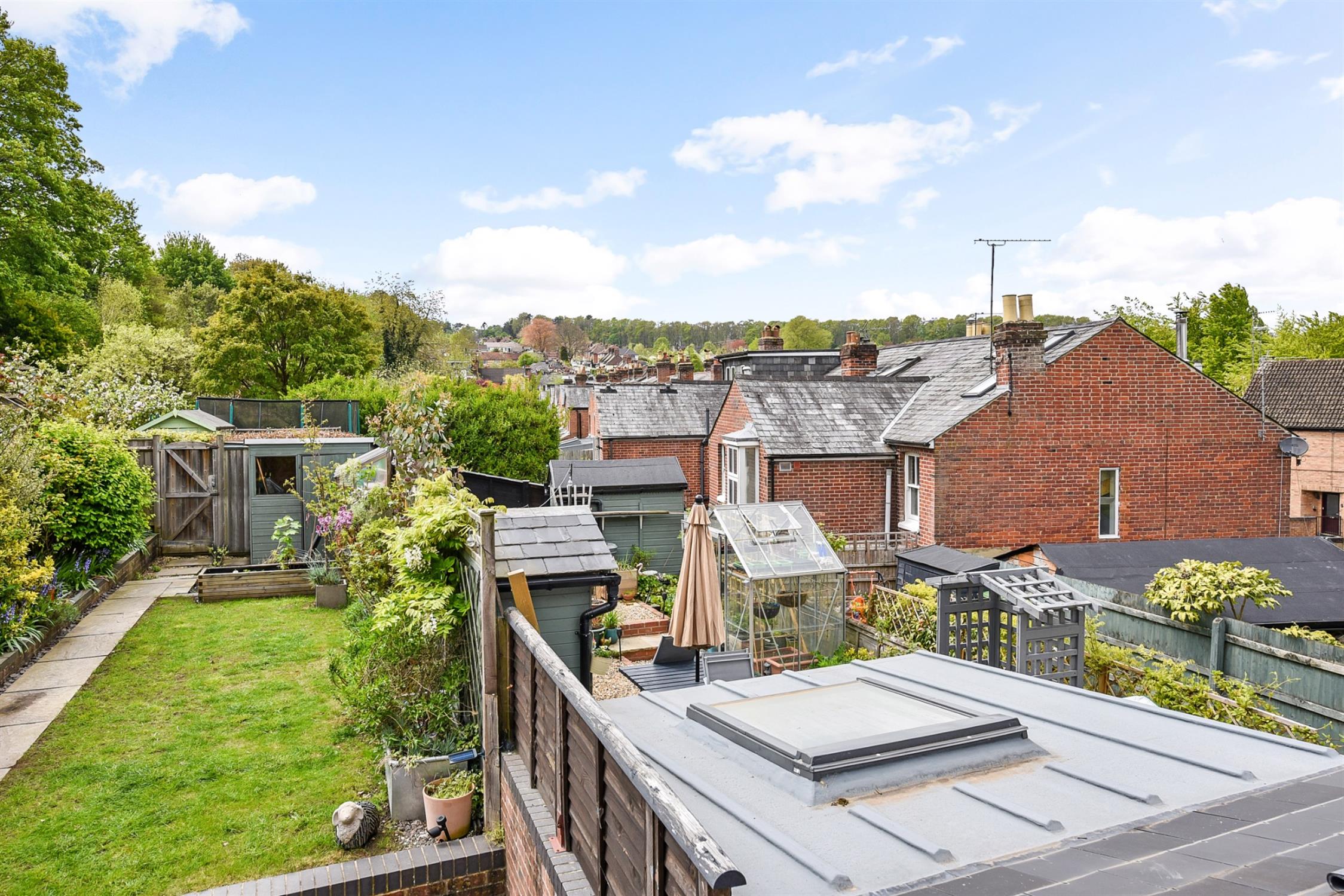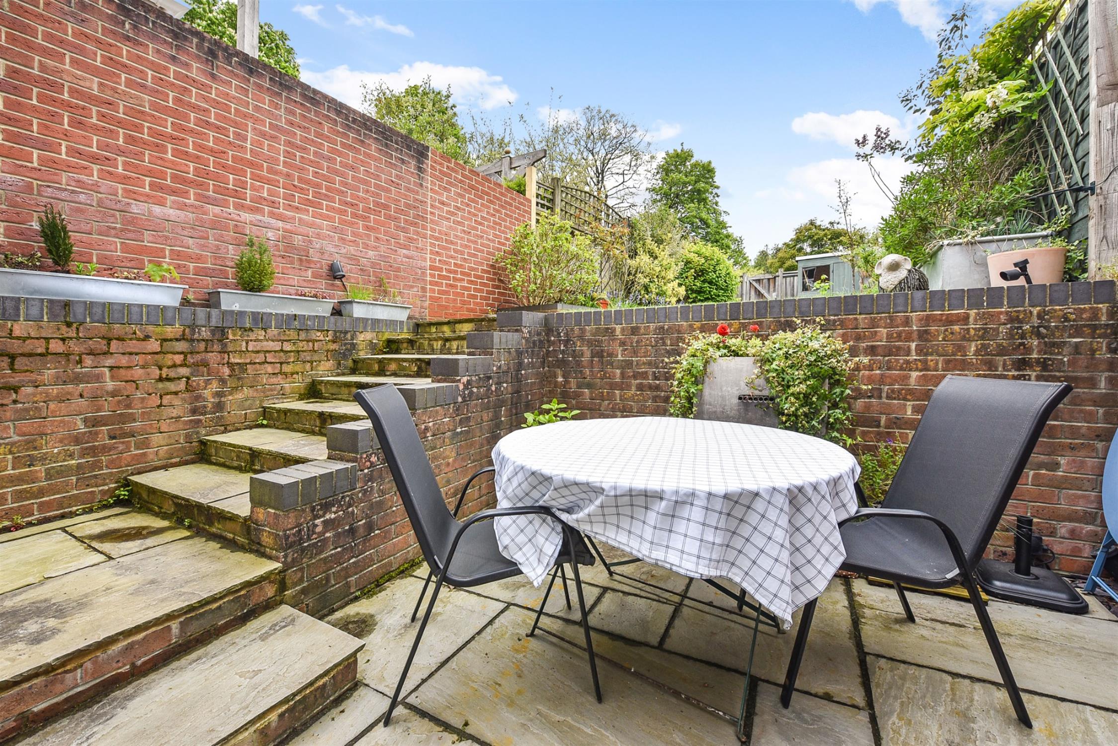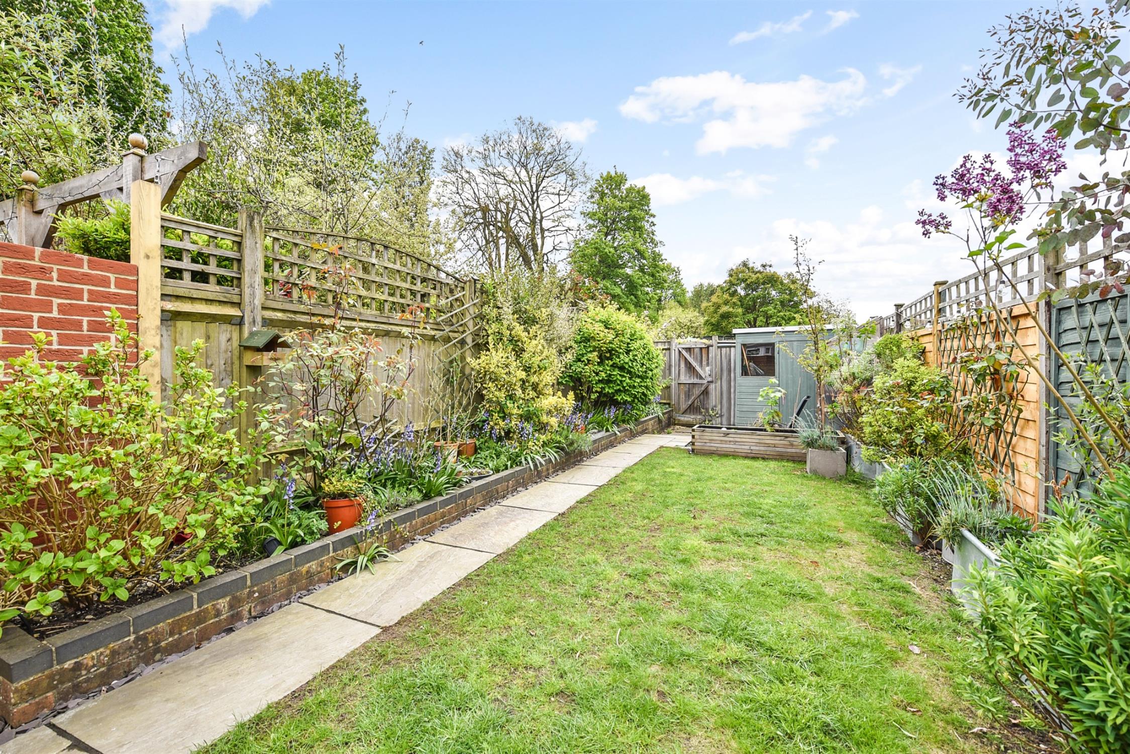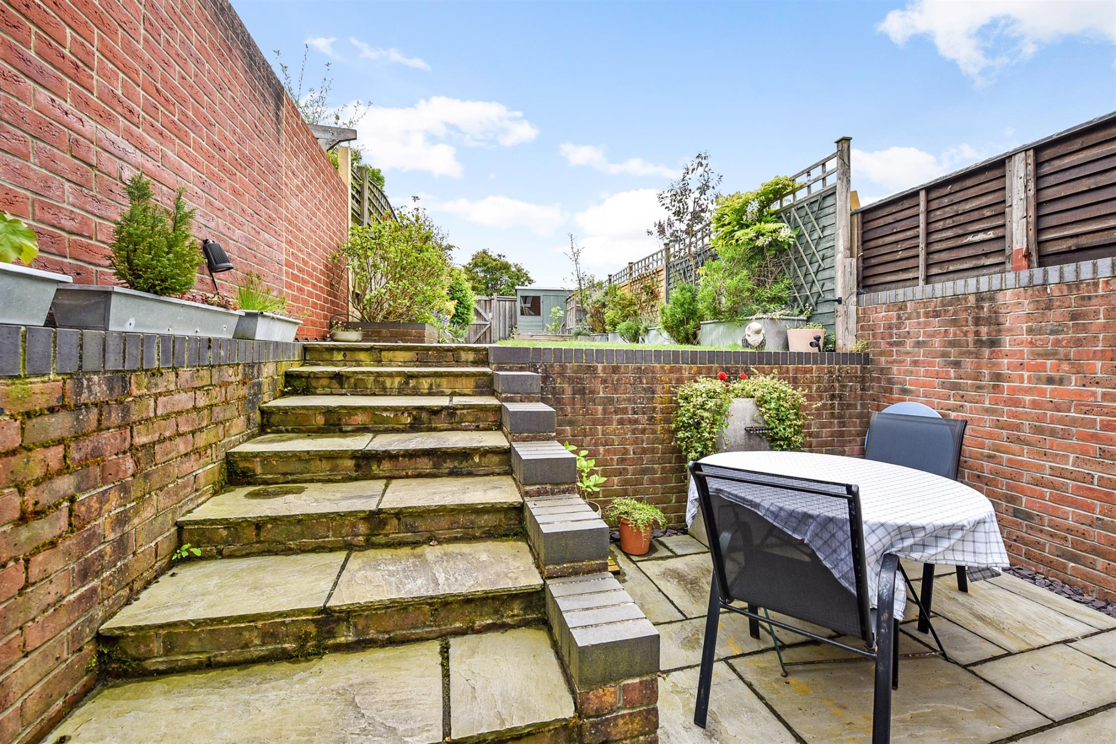 Outside, the garden is split-level and benefits from a southerly aspect, creating a splendid suntrap. Accessed via the French doors from the kitchen, there is a patio seating area on the lower level and stairs lead up to the lawn. To the end of the garden, there is a shed and rear access.