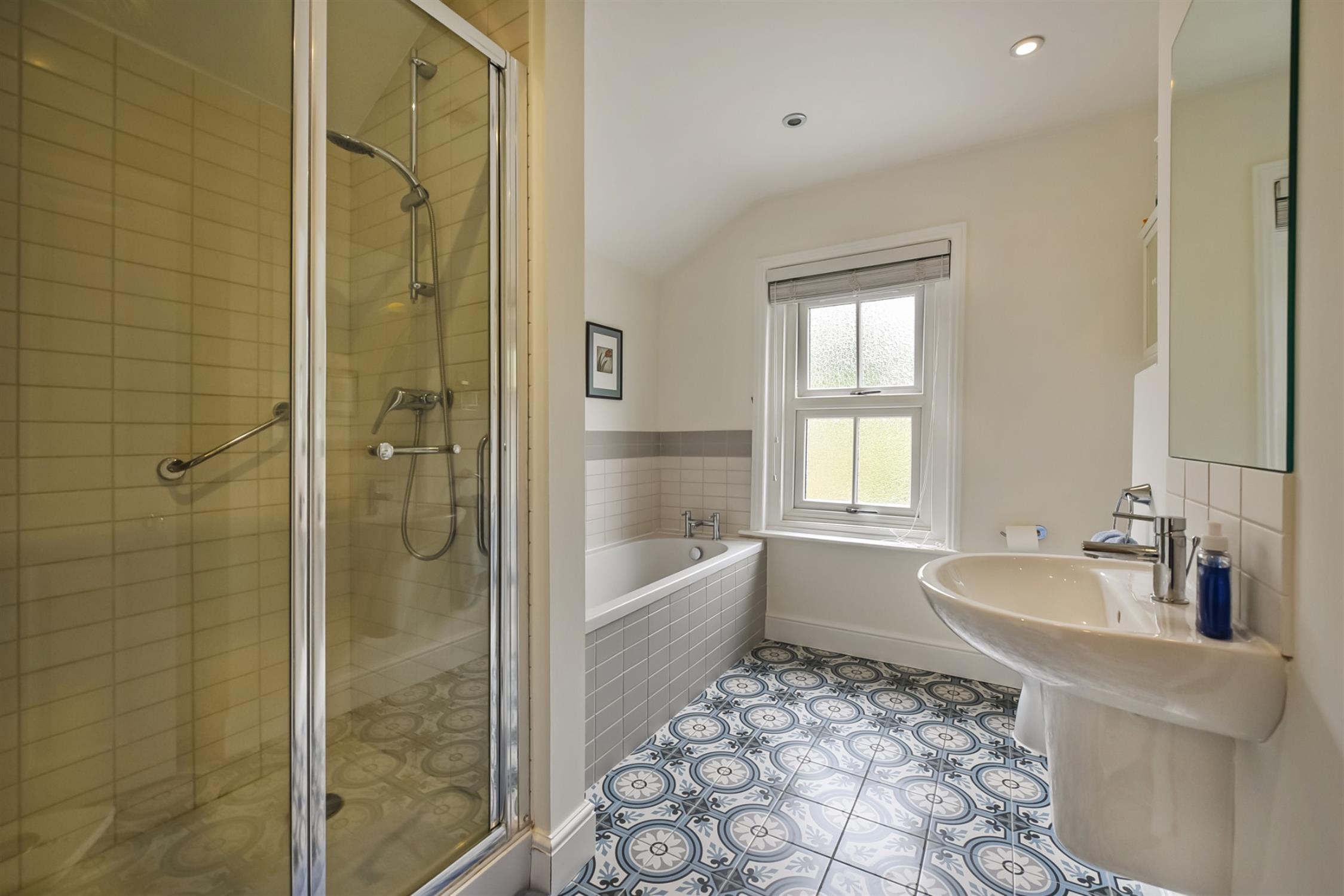 On the first floor there are two bedrooms, with the master being a generous double. The family bathroom can also be found on this floor. It is a white suite and offers separate shower and bath, basin, toilet, and heated towel rail. The vendor has added her personal touch with classic blue pattern floor tiles.