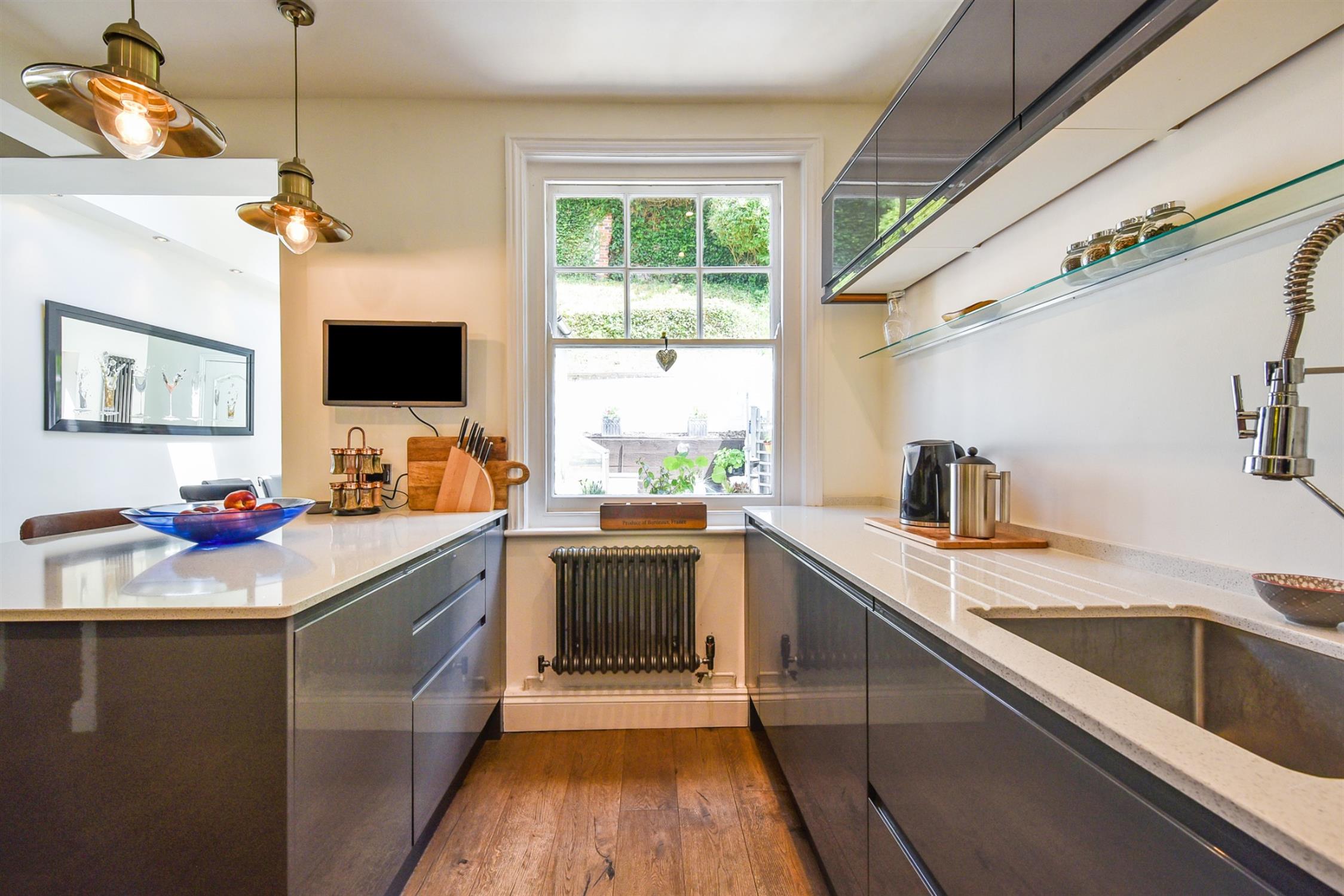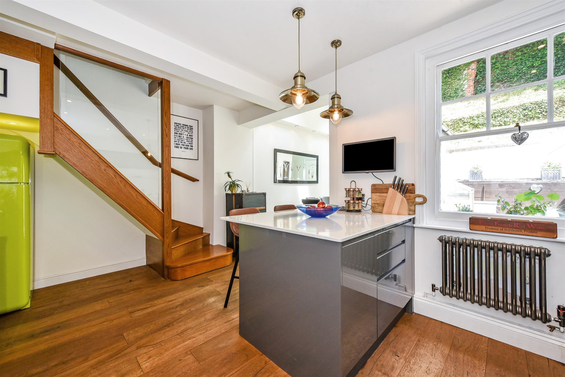 On entry, there is a hall which provides access to all ground floor accommodation with engineered hardwood flooring throughout. The cosy living room is located to the front of the property and offers an open fireplace. The social kitchen/dining room is truly the heart of the home, offering plenty of space to entertain. The kitchen is fitted to a very high standard, with a range of eye and low-level handleless units, including an island with breakfast seating. The worktops are solid mineral. The ceiling in the dining room goes high into the pitch, creating a bright and airy space alongside two skylights and French doors which open to the garden. Finishing off the ground floor is a WC with space for a washing machine.