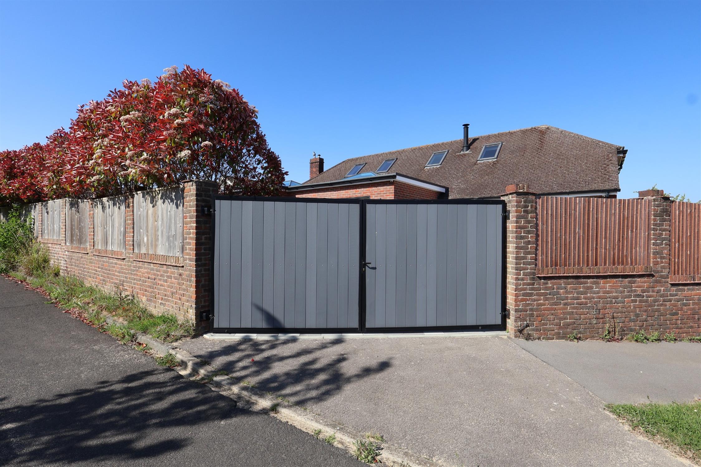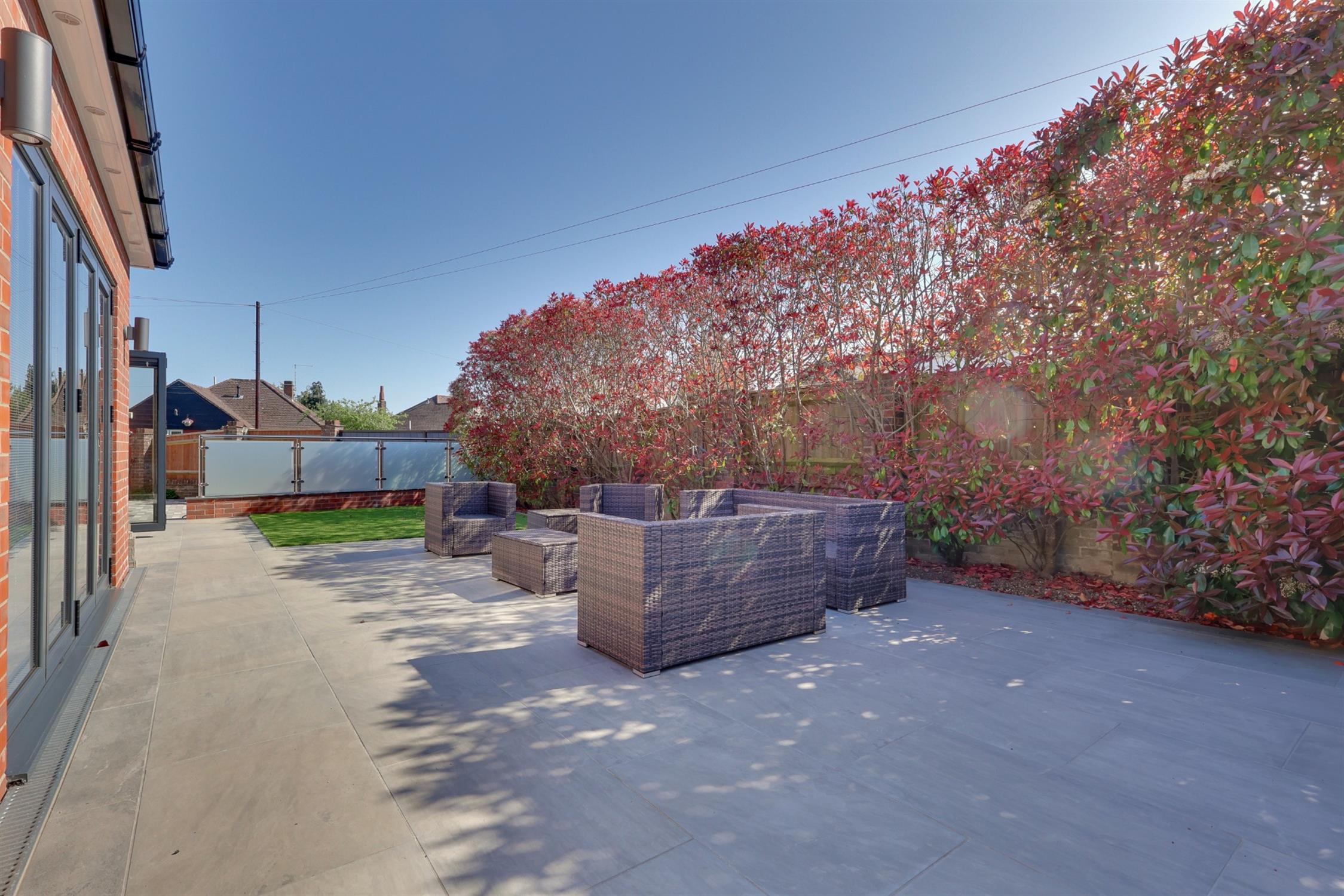 The front garden is laid to lawn with block-paved driveway offering off-road parking for several vehicles, enclosed by a low wall. The side garden is laid to lawn, while the rear garden features lawn, astroturf, a patio area, fence boundary, double electric gates, glass privacy screen, and gated access to the garage.