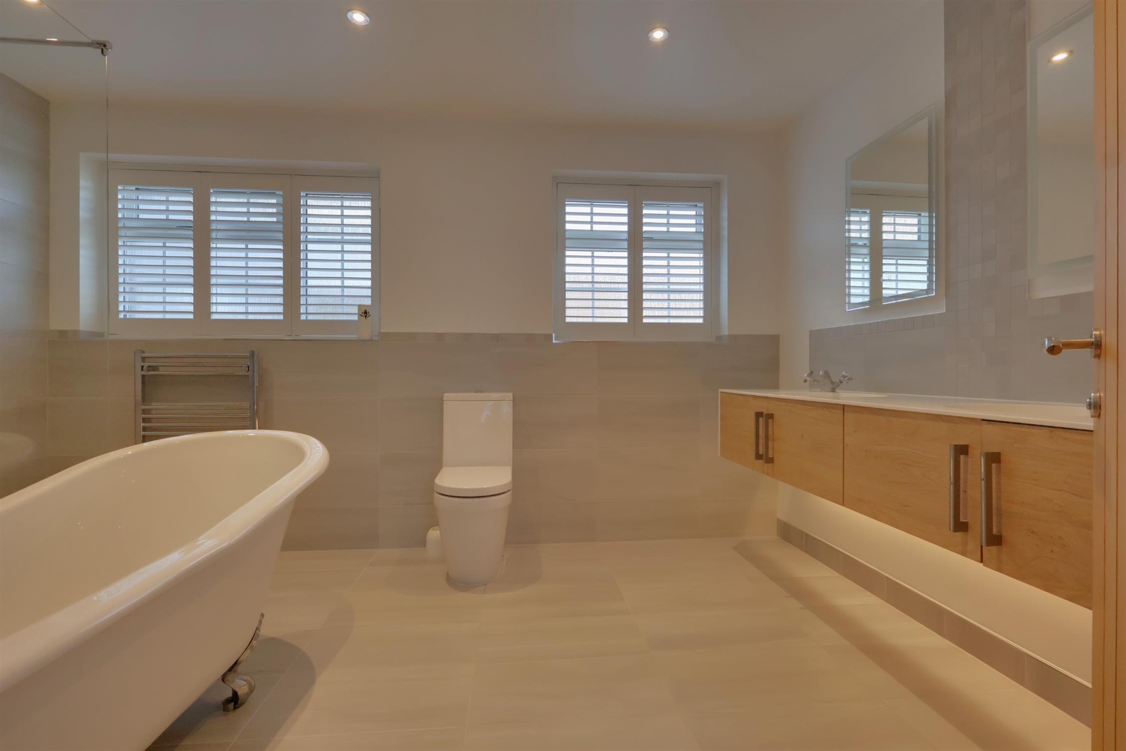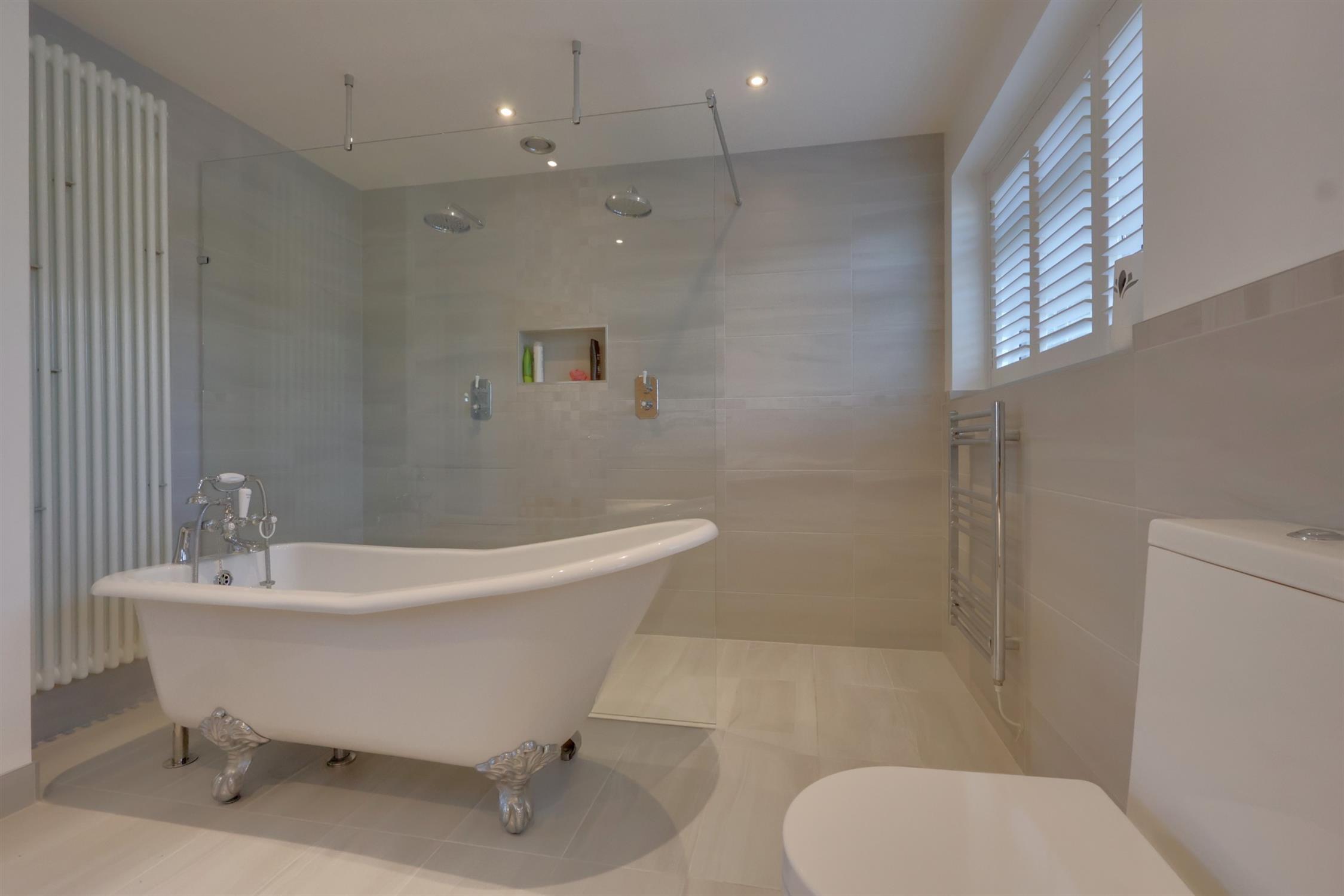 A luxurious four-piece suite comprising a freestanding roll-top clawfoot bath, a close-coupled WC, twin ‘his and hers’ vanity units, and a generous double walk-in shower. The bathroom is enhanced by two obscured double-glazed windows to the side elevation with shutters, two wall-mounted mirrors, a vertical radiator, a ladder towel radiator, underfloor heating, tiled flooring, and part-tiled walls for a stylish and functional finish.
