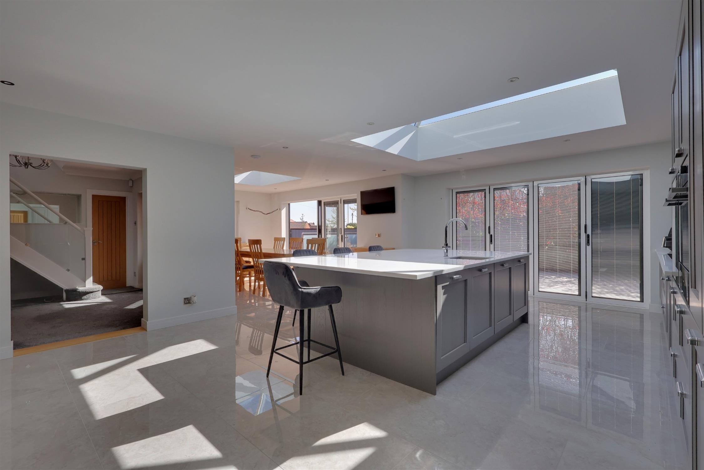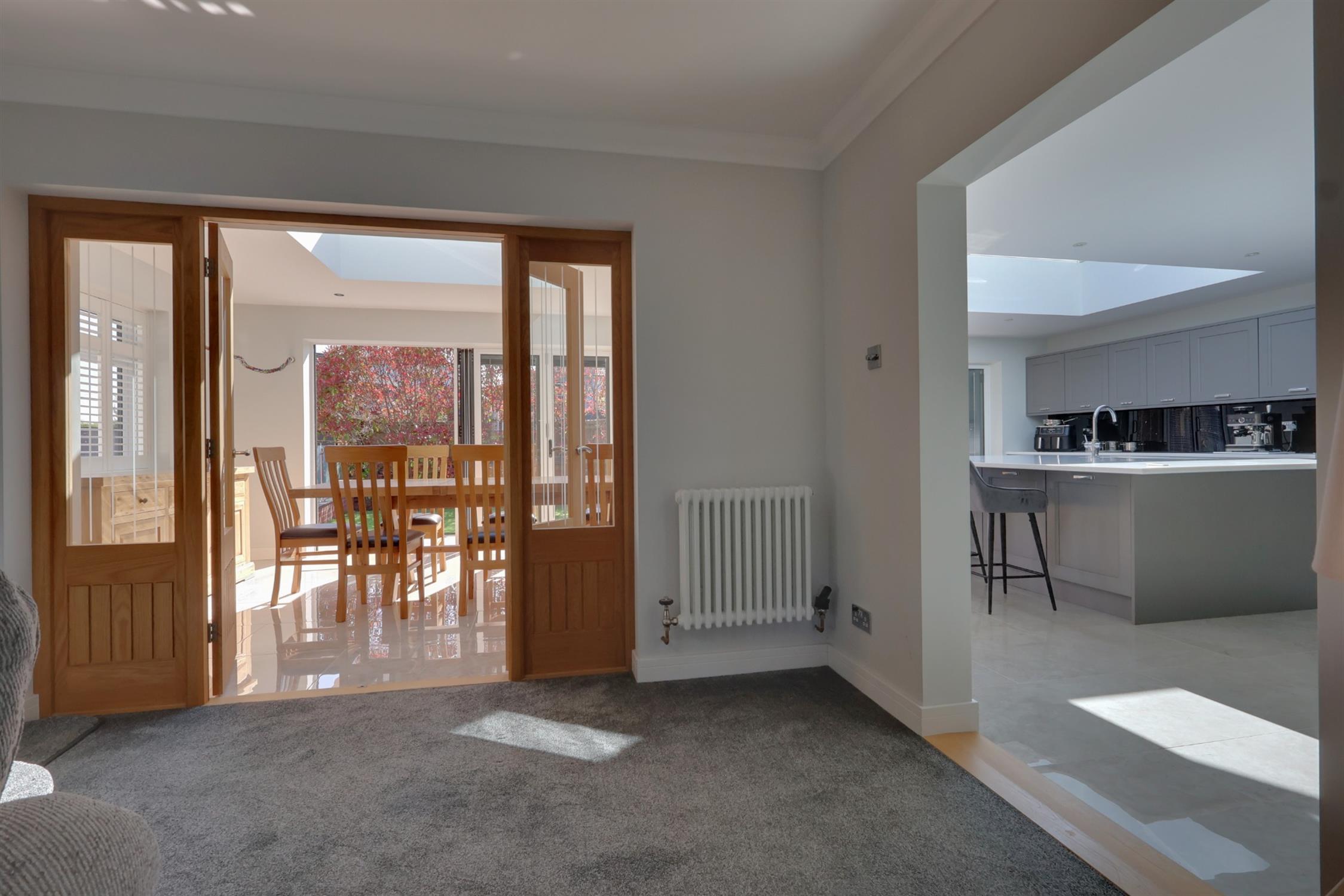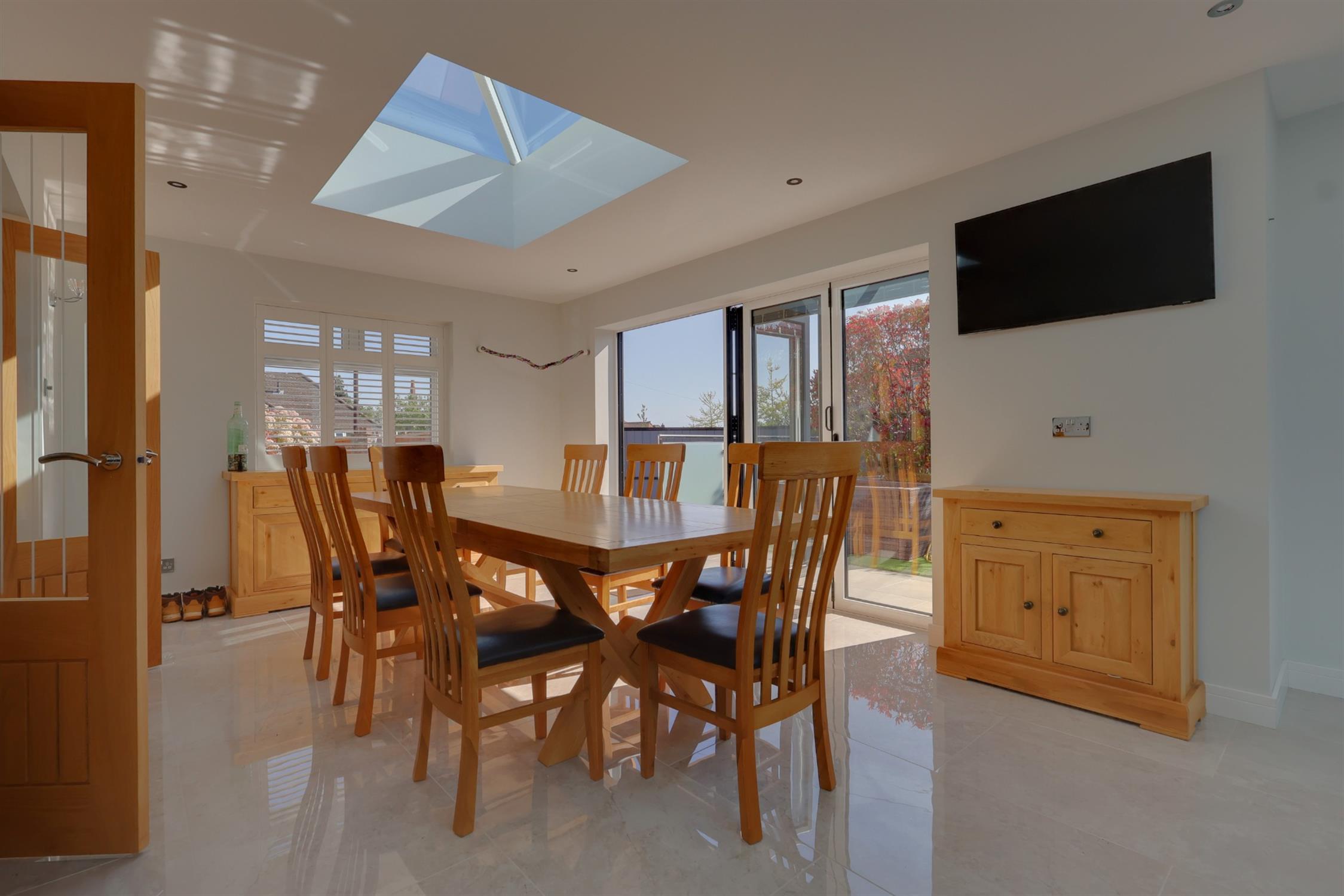 An impressive open-plan space ideal for modern living and entertaining. The dining area features double-glazed bi-fold doors opening onto the rear garden, a double-glazed side window with shutters, and a tiled floor throughout with underfloor heating. Two large ceiling lanterns allow the natural light to flood in.