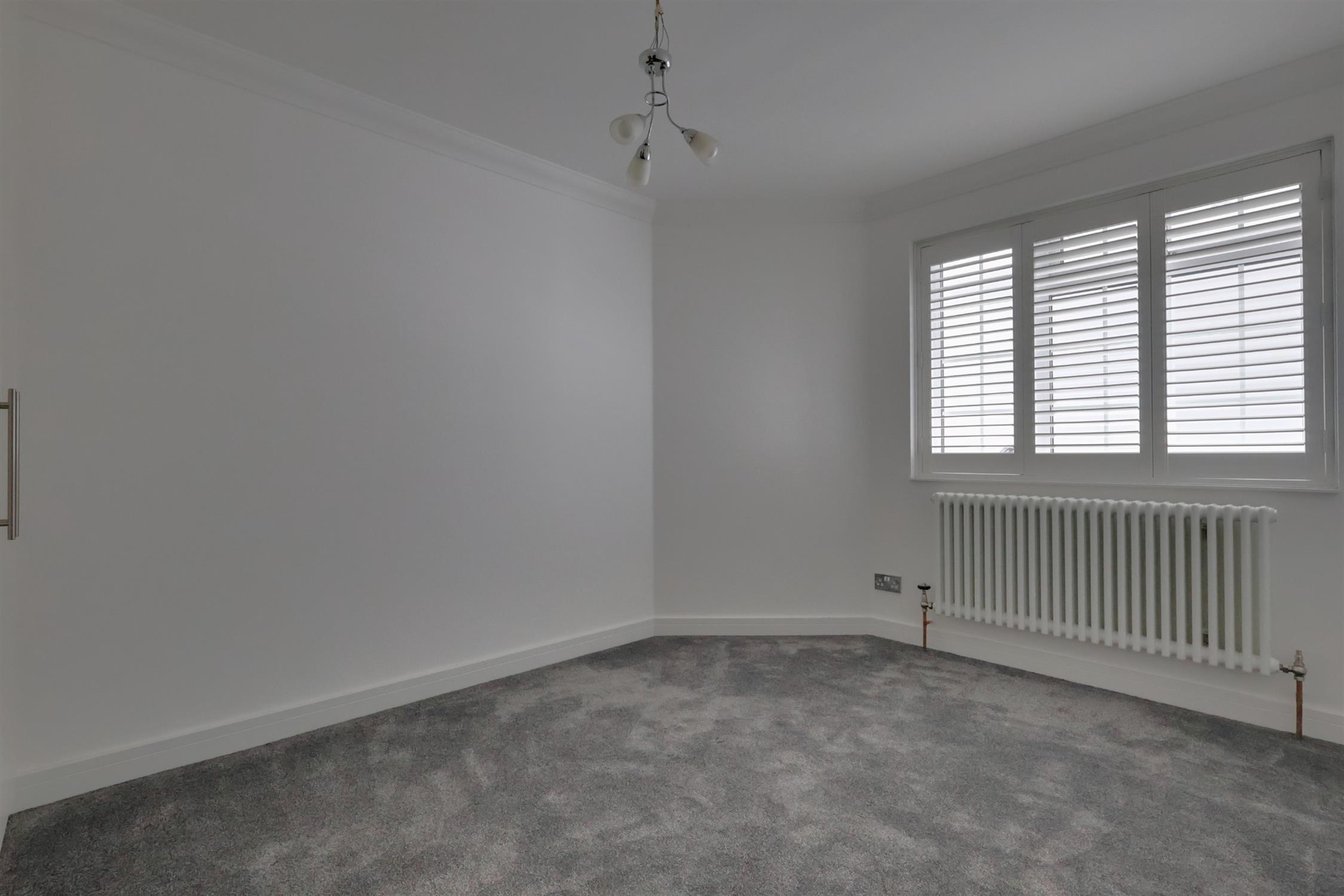 A bright and spacious double bedroom with double-glazed windows to both the front and side elevations, complemented by shutters. The room features fitted double wardrobes and a stylish Victorian-style radiator.