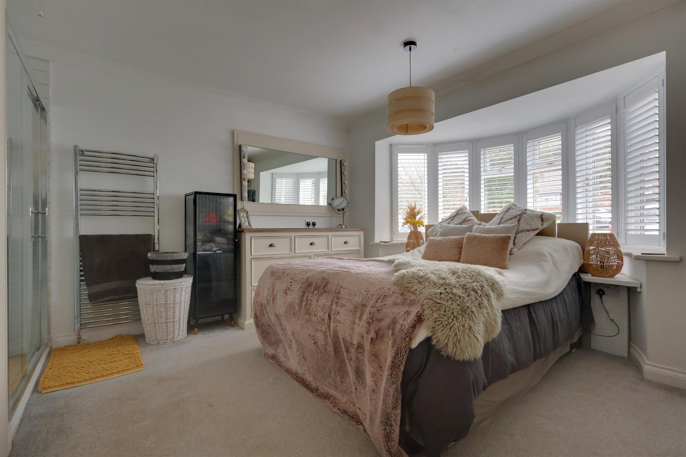 Features a double-glazed bay window with Venetian blinds, a fitted double wardrobe, a double shower and ladder radiator.