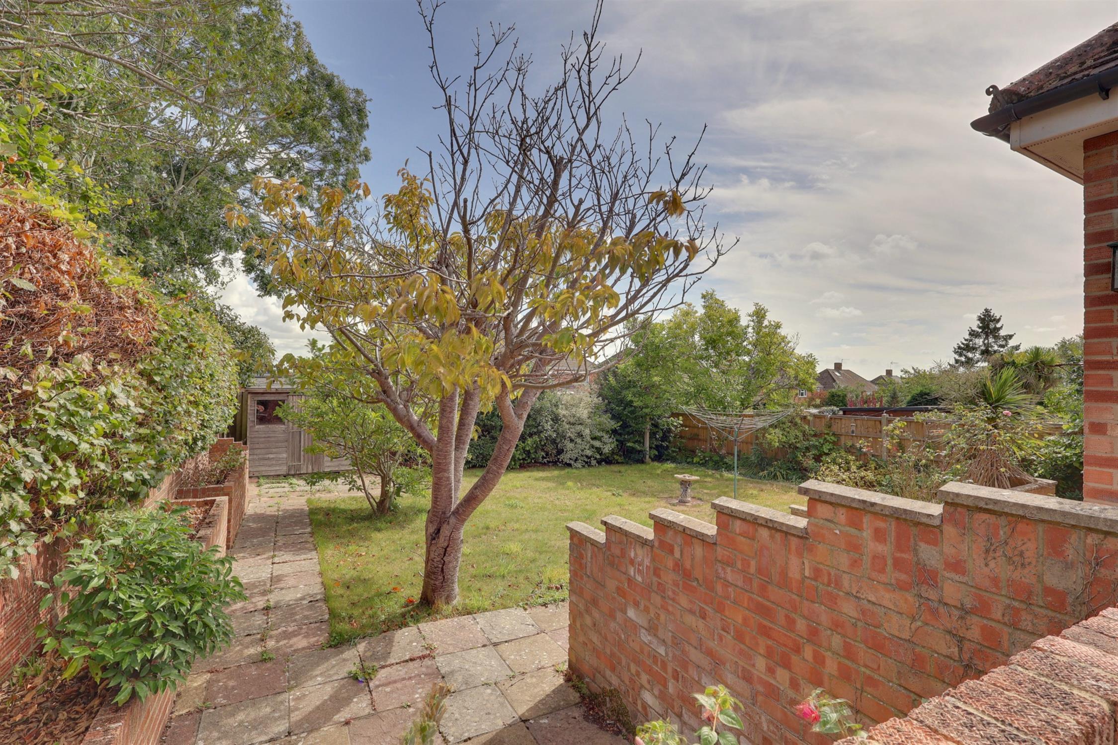 To the rear, a gently terraced garden with patio areas, lawn, mature shrubs and borders, enclosed by wall and fencing. Wooden shed and gated side pedestrian access. To the front are mature shrubs and borders, pathway to front door, and access to garage.