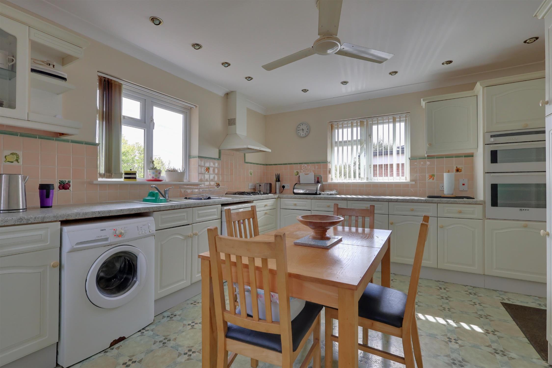 Double-glazed windows to side and rear elevations, obscure glazed side door. Fitted with a range of wall and base units with roll-top work surfaces. Incorporates one-and-a-half sink with mixer tap, integral gas hob with extractor hood, built-in double eye-level oven, integral fridge/freezer, and space/plumbing for a dishwasher and washing machine. Part tiled walls and radiator.