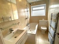 Window to side. Low level WC. Inset wash hand basin with drawers below. Panelled bath with central taps and shower over. Complementary tiling. Heated towel radiator.