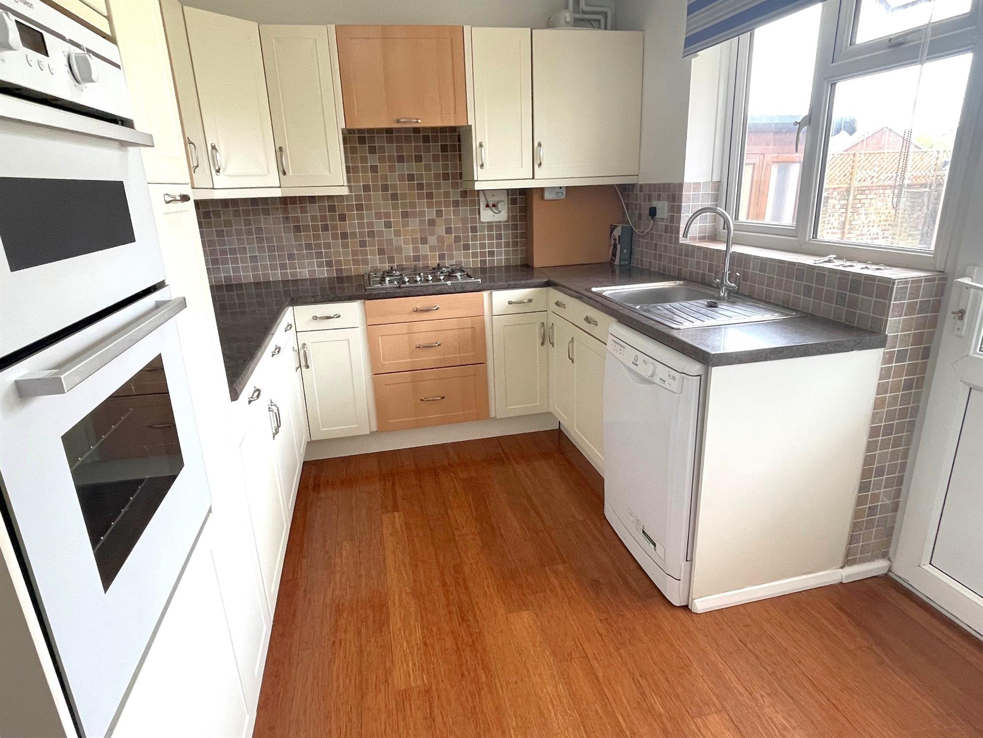 Window to rear. Range of wall and base units with work surfaces over. Single drainer stainless steel sink unit. Tiled splashbacks. 4 ring gas hob with extractor over. Built in electric double oven. Space and plumbing for washing machine and dishwasher. Space for fridge freezer. Cupboard housing Worcester Bosch gas combination boiler. Solid engineered wood flooring. Door to garden.