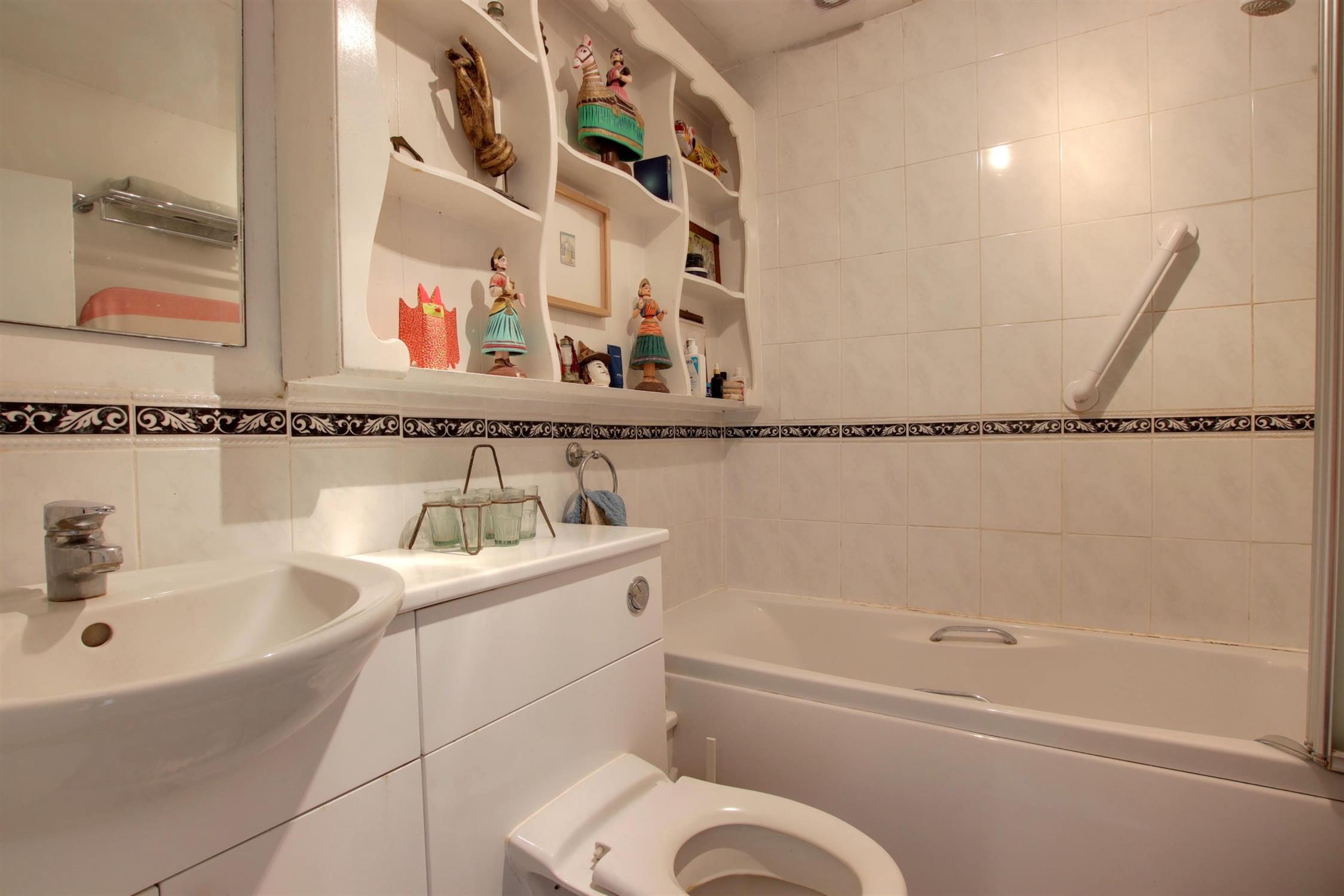 Smooth ceiling with extractor fan. Suite comprising; bath with shower over. Vanity unit with wash hand basin and low level WC. Electric heated towel rail. Part tiled walls. Tiled flooring.