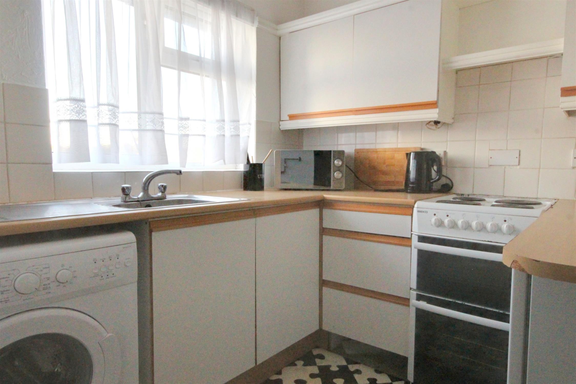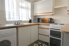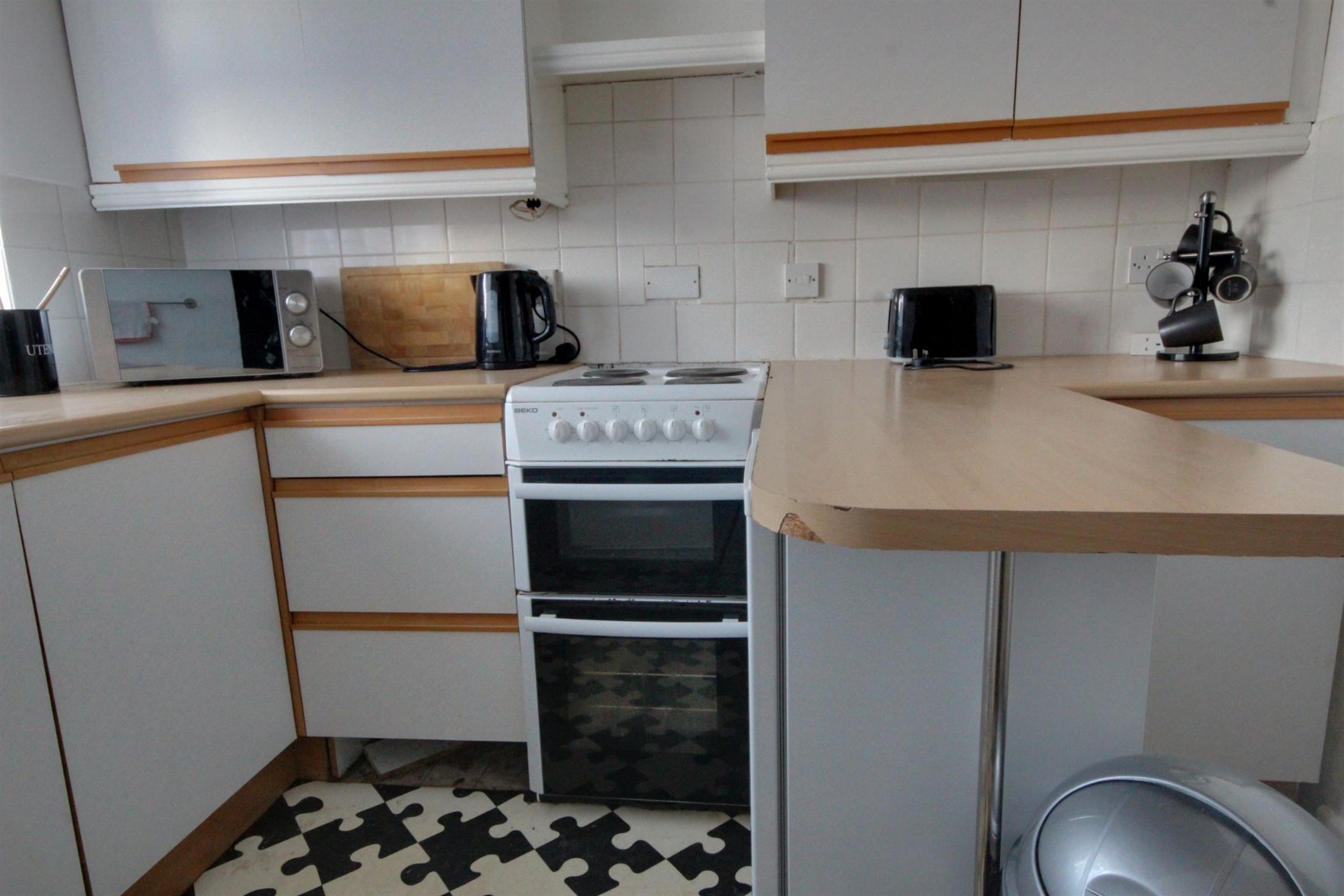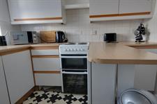 KITCHEN - fitted kitchen with free standing fridge, electric oven and hob, washing machine, toaster, microwave and utensils.