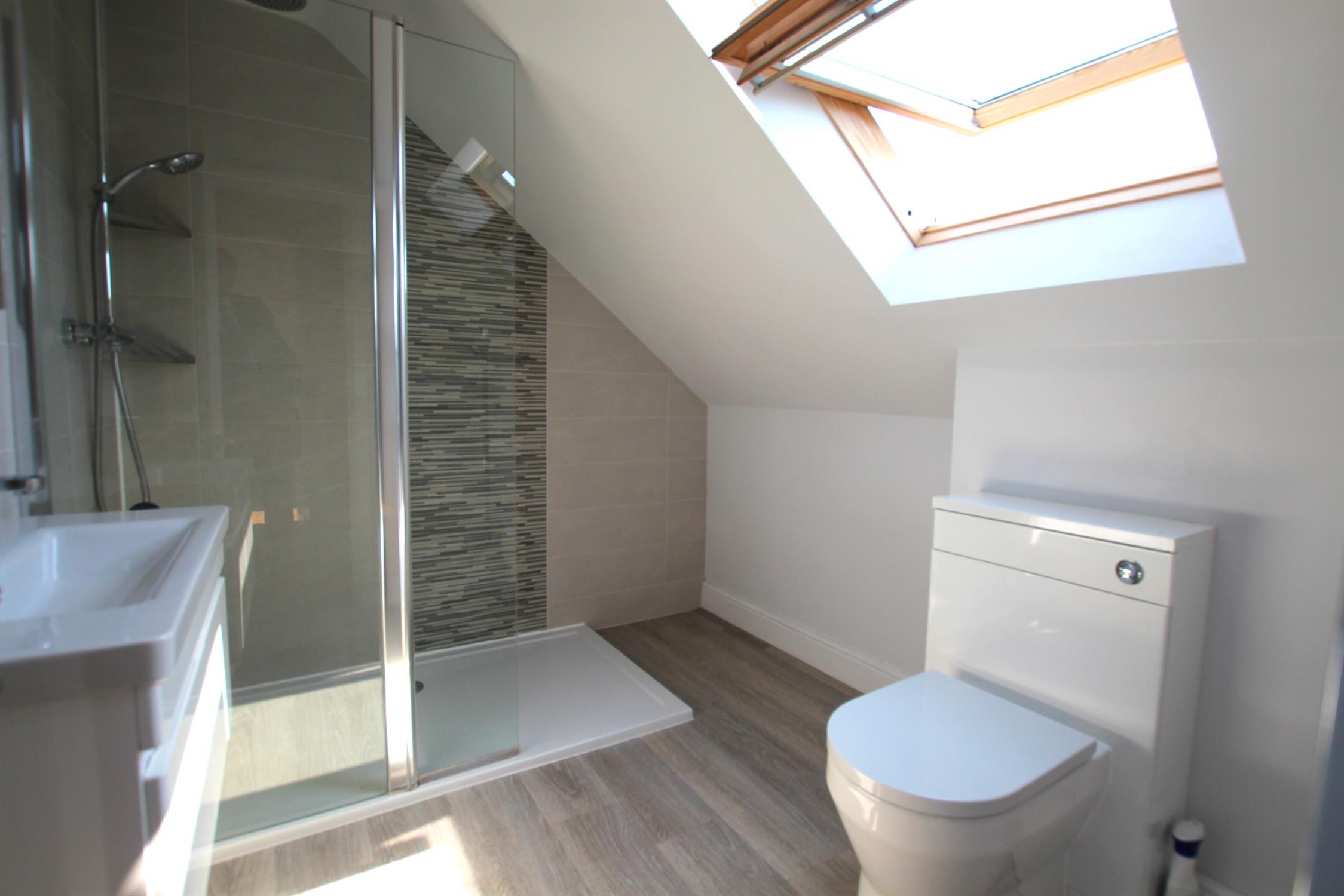 Wood laminate effect flooring, sink with mixer tap and fitted under sink storage with mirror above, walk in double sized shower with additional Monsoon shower head, tiled shower area, close coupled toilet, ladder radiator, skylight window to the south easterly elevation, smooth skimmed ceiling and spotlighting, extractor fan.
