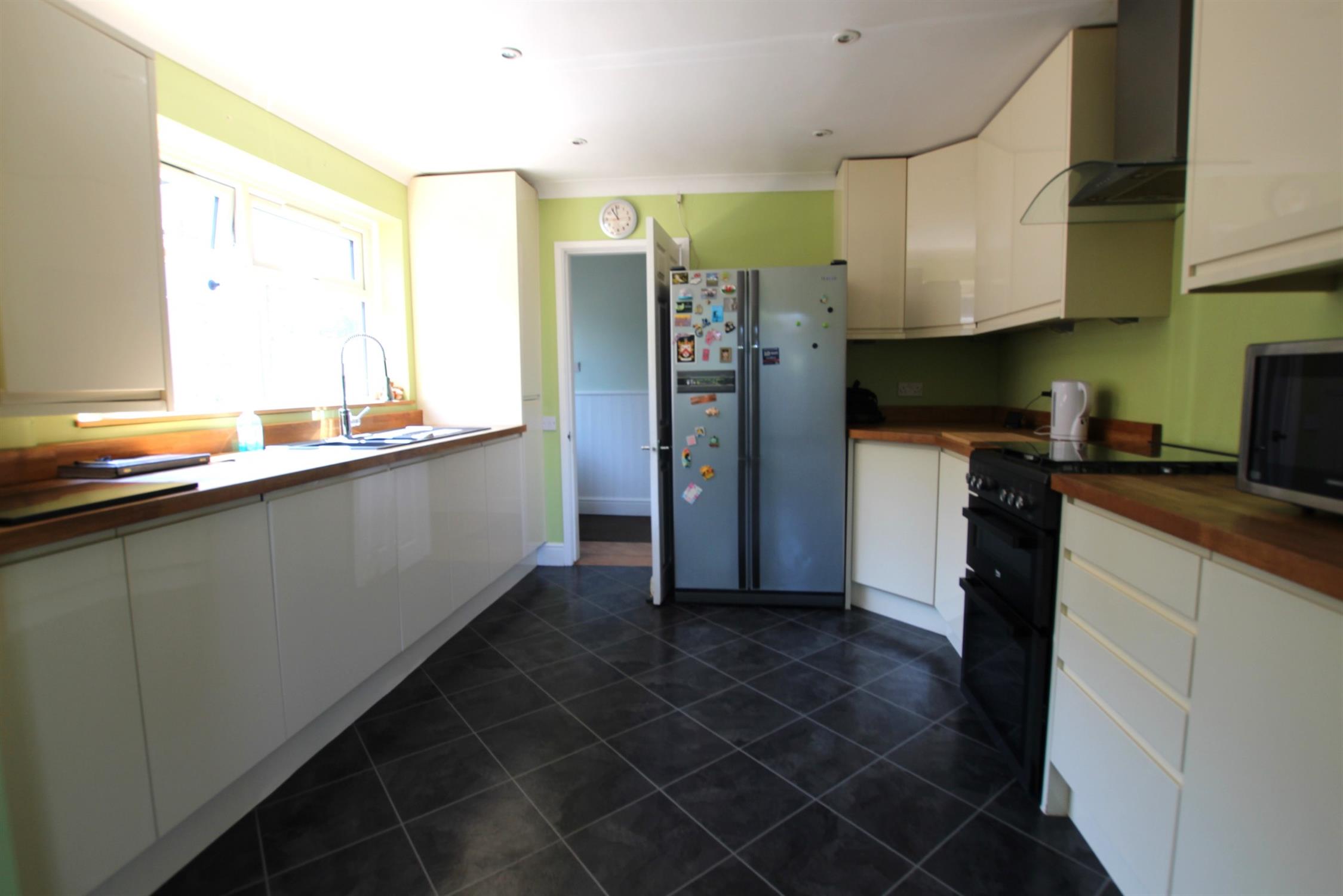 Double sink with mixer tap, upvc double glazed window to south easterly aspect, space for oversized fridge freezer, wooden work tops and splashback, electric oven with gas hob and overhead hood extraction, integrated dishwasher, grey tile flooring, smooth skimmed ceiling with spot lighting, power points and an archway leading through to.