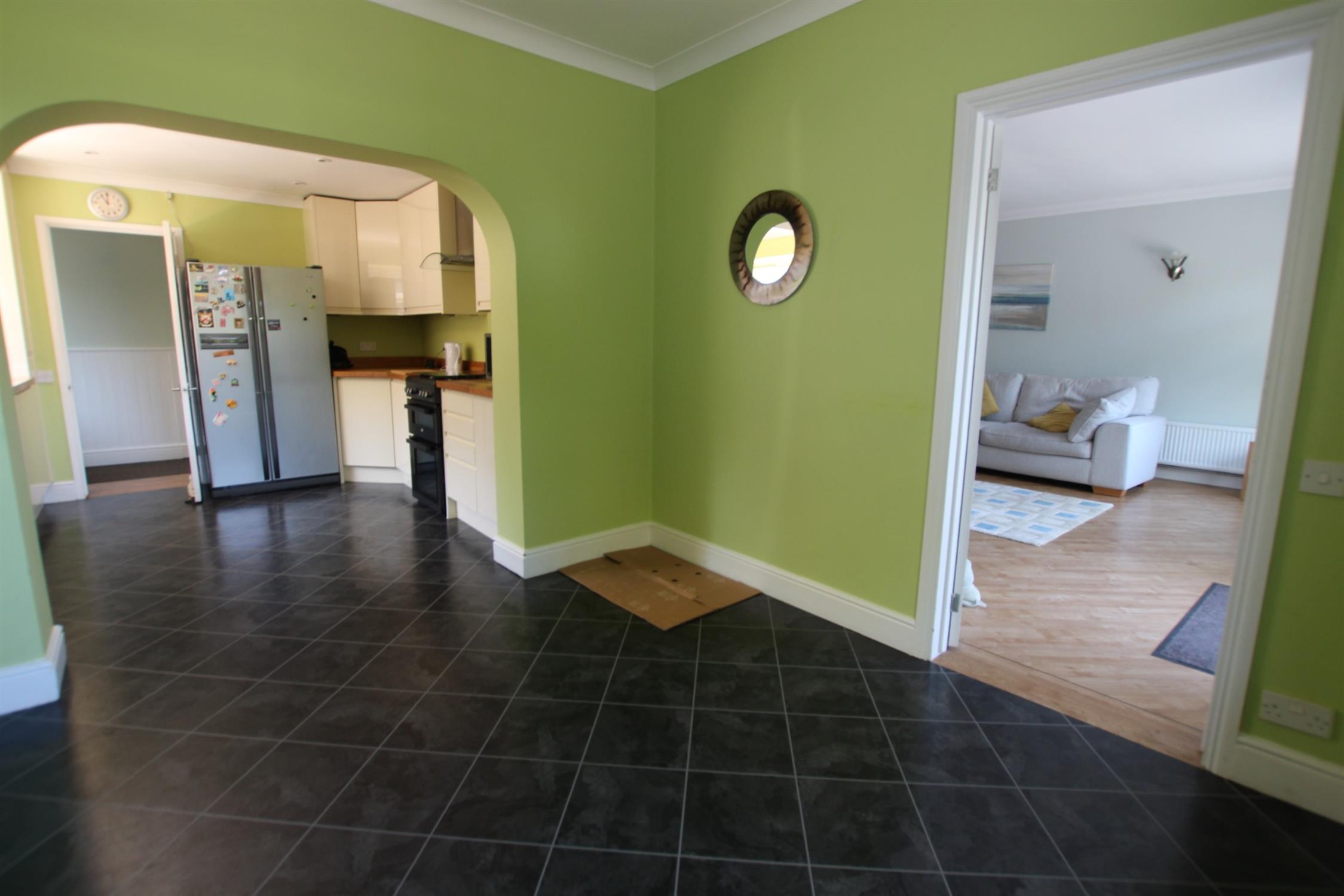 Impressive in length and wheelchair friendly offering easy access to all rooms, wood grain effect flooring, decorative half wood panelling to walls, coved ceiling, radiator, dual access front and side doors, cupboard containing fuse board and meters, thermostat, two smoke alarms, doors leading to