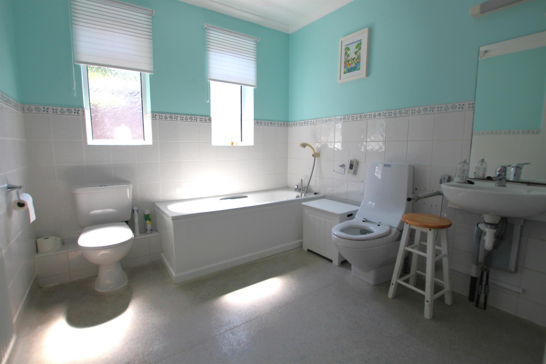 Fully tiled shower area with electric shower and curtain rail surround, toilet, bath with shower attachment, toilet and sink, two upvc double glazed opaque windows to the south easterly elevation, extraction, coved ceiling with spotlights.